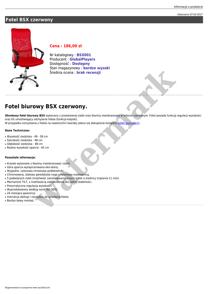 Informacje o produkcie Utworzono 07-03-2017 Fotel BSX czerwony Cena : 186,00 zł er m ar k Nr katalogowy : BSX001 Producent : GlobalPlayers Dostępność : Dostępny Stan magazynowy : bardzo wysoki Średnia ocena : brak recenzji Fotel biurowy BSX czerwony. Obrotowy fotel biurowy BSX wykonany z przewiewnej siatki oraz tkaniny membranowej w kolorze czerwonym. Fotel posiada funkcję regulacji wysokości oraz tilt umożliwiający odchylanie fotela (funkcja kołyski). W przypadku korzystania z fotela na nawierzchni twardej zaleca się dokupienie kompletu kółek gumowych. Dane Techniczne: ● ● ● ● Wysokość siedziska - 49 - 58 cm Szerokość siedziska - 48 cm Głębokość siedziska - 48 cm Realna wysokość oparcia - 65 cm Pozostałe informacje: ● ● ● ● ● ● ● ● ● Krzesło wykonane z tkaniny membranowej i siatki. Góra oparcia wytapicerowana eko-skórą. Wygodne, nylonowo-chromowe podłokietniki. Chromowana, stalowa gwieździsta noga z nylonową maskownicą. 5 podwójnych rolek (możliwość zainstalowania innych kółek o średnicy trzpienia 11 mm). Mechanizm TILT, z możliwością zablokowania dla pełnej stabilności. Pneumatyczna regulacja wysokości. Wyprodukowany według norm ISO 9001. 24 miesiące gwarancji. Instrukcja obsługi i narzędzia do składania fotela. Bardzo łatwy montaż. at ● w ● Wygenerowano w programie www.oscGold.com