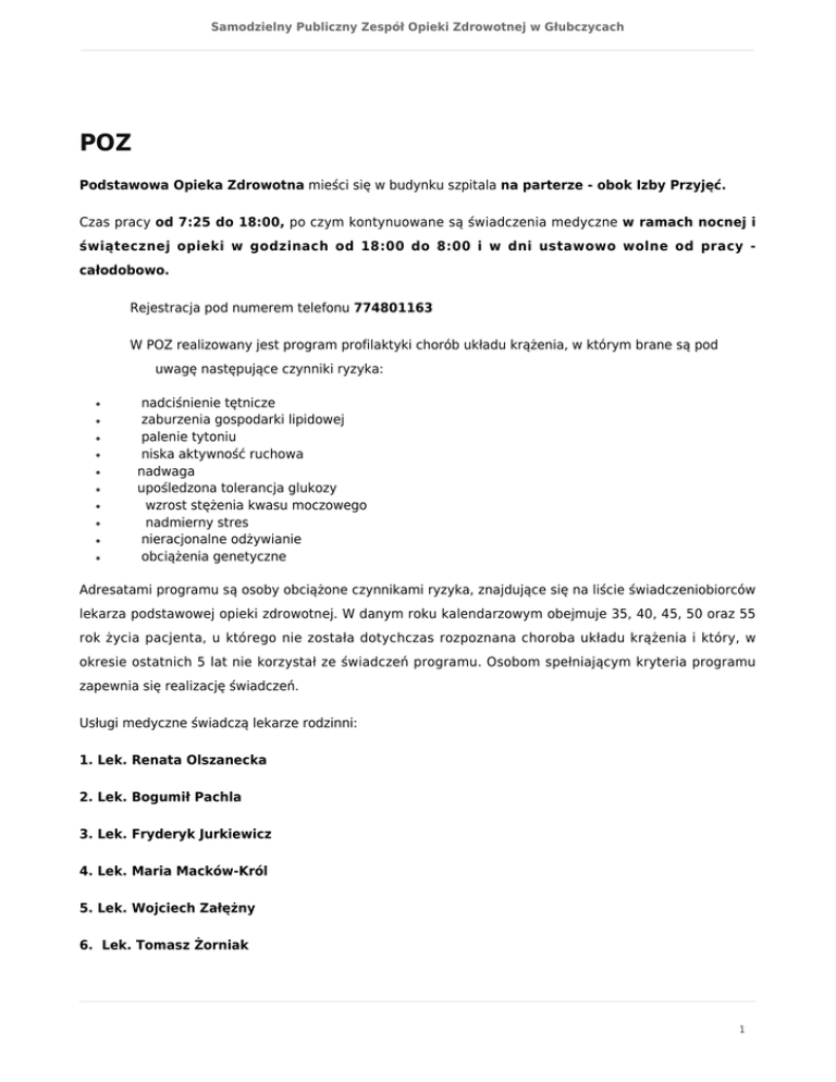 Samodzielny Publiczny Zespół Opieki Zdrowotnej w Głubczycach POZ Podstawowa Opieka Zdrowotna mieści się w budynku szpitala na parterze - obok Izby Przyjęć. Czas pracy od 7:25 do 18:00, po czym kontynuowane są świadczenia medyczne w ramach nocnej i świątecznej opieki w godzinach od 18:00 do 8:00 i w dni ustawowo wolne od pracy całodobowo. Rejestracja pod numerem telefonu 774801163 W POZ realizowany jest program profilaktyki chorób układu krążenia, w którym brane są pod uwagę następujące czynniki ryzyka: ● ● ● ● ● ● ● ● ● ● nadciśnienie tętnicze zaburzenia gospodarki lipidowej palenie tytoniu niska aktywność ruchowa nadwaga upośledzona tolerancja glukozy wzrost stężenia kwasu moczowego nadmierny stres nieracjonalne odżywianie obciążenia genetyczne Adresatami programu są osoby obciążone czynnikami ryzyka, znajdujące się na liście świadczeniobiorców lekarza podstawowej opieki zdrowotnej. W danym roku kalendarzowym obejmuje 35, 40, 45, 50 oraz 55 rok życia pacjenta, u którego nie została dotychczas rozpoznana choroba układu krążenia i który, w okresie ostatnich 5 lat nie korzystał ze świadczeń programu. Osobom spełniającym kryteria programu zapewnia się realizację świadczeń. Usługi medyczne świadczą lekarze rodzinni: 1. Lek. Renata Olszanecka 2. Lek. Bogumił Pachla 3. Lek. Fryderyk Jurkiewicz 4. Lek. Maria Macków-Król 5. Lek. Wojciech Załężny 6. Lek. Tomasz Żorniak 1 Samodzielny Publiczny Zespół Opieki Zdrowotnej w Głubczycach 7. Zofia Kępa Można składać deklaracje wyboru do w/w lekarzy. W ramach POZ świadczone są usługi opieki: ● ● ● ● pielęgniarskiej długoterminowej pielęgniarskiej środowiskowo-rodzinnej pielęgniarskiej w środowisku nauczania i wychowania pielęgniarskiej wyjazdowej nocnej i świątecznej W POZ funkcjonuje Punkt Szczepień prowadzony przez pielęgniarkę Bronisławę Furtak, która ma największą wyszczepialność w województwie opolskim i brak powikłań poszczepiennych. Pielęgniarką koordynującą podstawowej opieki zdrowotnej jest Ludmiła Buczek. 2