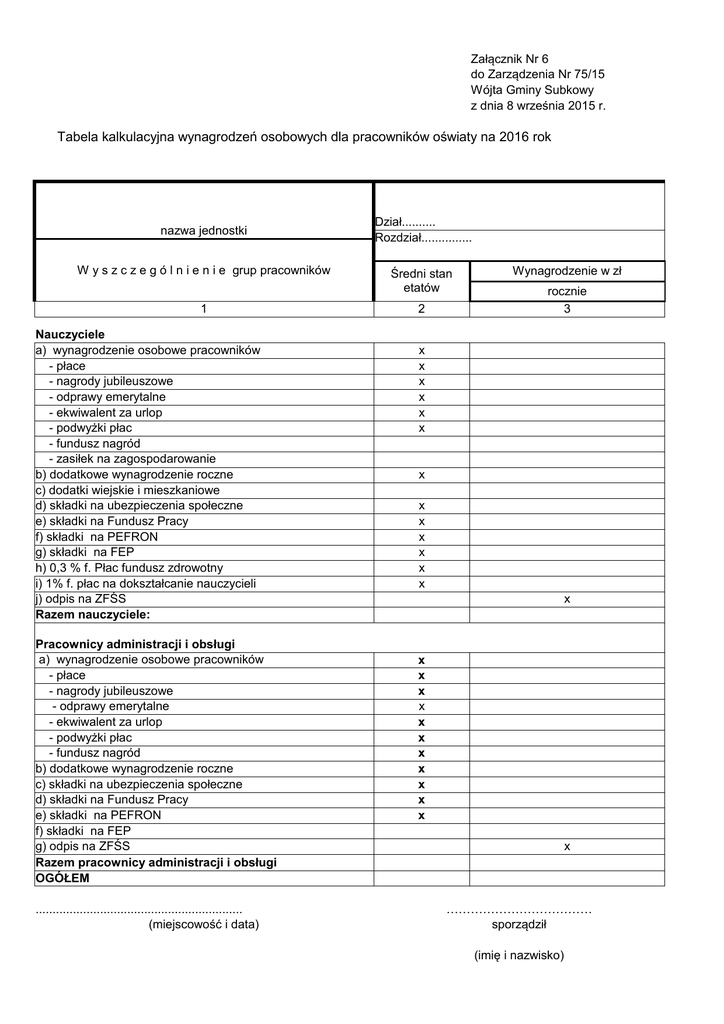 Załącznik Nr 6 do Zarządzenia Nr 75/15 Wójta Gminy Subkowy z dnia 8 września 2015 r. Tabela kalkulacyjna wynagrodzeń osobowych dla pracowników oświaty na 2016 rok nazwa jednostki W y s z c z e g ó l n i e n i e grup pracowników 1 Nauczyciele a) wynagrodzenie osobowe pracowników - płace - nagrody jubileuszowe - odprawy emerytalne - ekwiwalent za urlop - podwyżki płac - fundusz nagród - zasiłek na zagospodarowanie b) dodatkowe wynagrodzenie roczne c) dodatki wiejskie i mieszkaniowe d) składki na ubezpieczenia społeczne e) składki na Fundusz Pracy f) składki na PEFRON g) składki na FEP h) 0,3 % f. Płac fundusz zdrowotny i) 1% f. płac na dokształcanie nauczycieli j) odpis na ZFŚS Razem nauczyciele: Pracownicy administracji i obsługi a) wynagrodzenie osobowe pracowników - płace - nagrody jubileuszowe - odprawy emerytalne - ekwiwalent za urlop - podwyżki płac - fundusz nagród b) dodatkowe wynagrodzenie roczne c) składki na ubezpieczenia społeczne d) składki na Fundusz Pracy e) składki na PEFRON f) składki na FEP g) odpis na ZFŚS Razem pracownicy administracji i obsługi OGÓŁEM ............................................................. (miejscowość i data) Dział.......... Rozdział............... Średni stan etatów 2 Wynagrodzenie w zł rocznie 3 x x x x x x x x x x x x x x x x x x x x x x x x x x ……………………………… sporządził (imię i nazwisko)