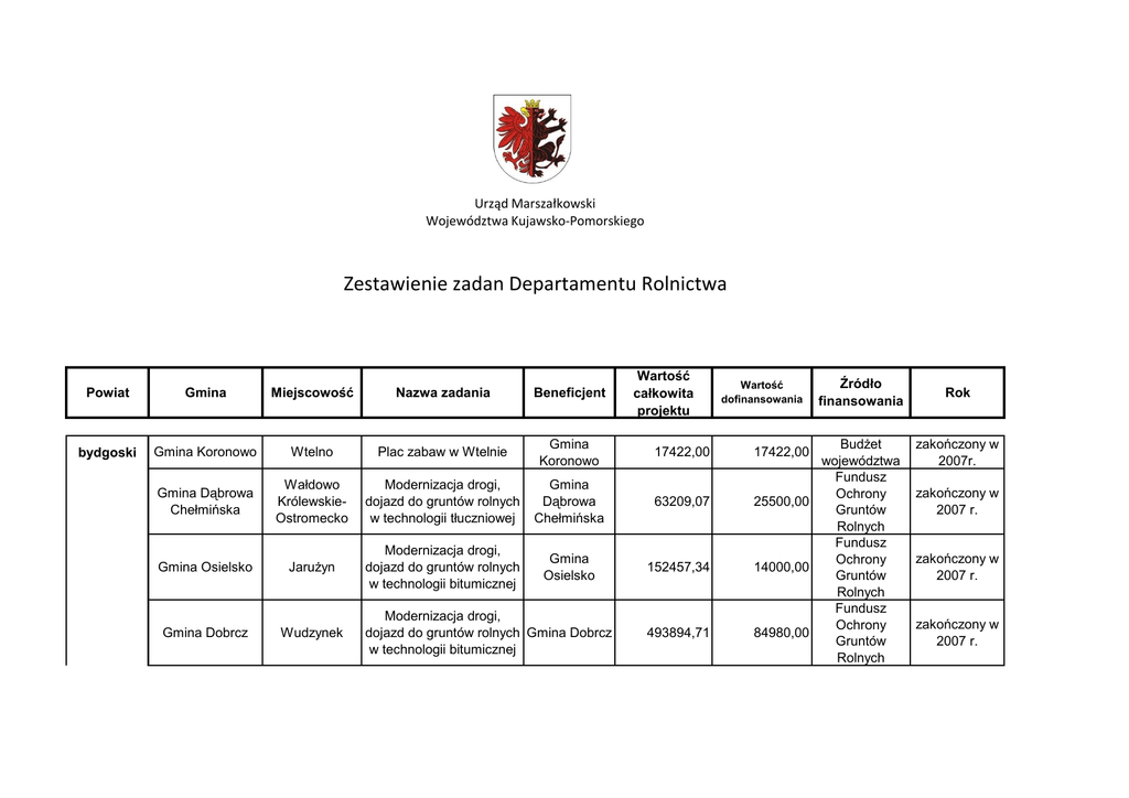 Zestawienie zadań Departamentu Rolnictwa - Kujawsko