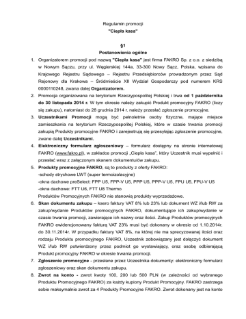 Regulamin promocji "Ciepła kasa" §1 Postanowienia ogólne 1. Organizatorem promocji pod nazwą "Ciepła kasa" jest firma FAKRO Sp. z o.o. z siedzibą w Nowym Sączu, przy ul. Węgierskiej 144a, 33-300 Nowy Sącz, Polska, wpisana do Krajowego Rejestru Sądowego – Rejestru Przedsiębiorców prowadzonym przez Sąd Rejonowy dla Krakowa – Śródmieście XII Wydział Gospodarczy pod numerem KRS 0000110248, zwana dalej Organizatorem. 2. Promocja organizowana na terytorium Rzeczypospolitej Polskiej i trwa od 1 października do 30 listopada 2014 r. W tym okresie naleŜy zakupić Produkt promocyjny FAKRO (liczy się zakupu), natomiast do 28 grudnia 2014 r. naleŜy przesłać zgłoszenie promocyjne. 3. Uczestnikami Promocji mogą być pełnoletnie osoby fizyczne, mające miejsce zamieszkania na terytorium Rzeczypospolitej Polskiej, które w czasie trwania promocji zakupią Produkty promocyjne FAKRO i zarejestrują się przesyłając zgłoszenie promocyjne, zwane dalej Uczestnikami. 4. Elektroniczny formularz zgłoszeniowy – formularz dostępny na stronie internetowej FAKRO (www.fakro.pl), w zakładce promocji „Ciepła kasa”, który Uczestnik musi wypełnić i przesłać wraz z załączonym skanem dokumentu/ów zakupu. 5. Produkty promocyjne FAKRO, są to produkty z oferty FAKRO: -schody strychowe LWT (super termoizolacyjne) -okna dachowe preSelect: FPP U5, FPP-V U5, PPP U5, PPP-V U5, FPU U5, FPU-V U5 -okna dachowe: FTT U6, FTT U8 Thermo Produktów Promocyjnych FAKRO nie stanowią produkty wyprzedaŜowe. 6. Skan dokumentu zakupu – ksero faktury VAT 8% lub 23% lub dokument WZ i/lub RW za zakup/wydanie Produktów promocyjnych FAKRO, dokumentujące ich zakup/wydanie w czasie trwania promocji, zawierające ich nazwy oraz ilości. Zakup Produktów promocyjnych FAKRO ewidencjonowany fakturą VAT 23% musi być dokonany w okresie od 1.10.2014r. do 30.11.2014r. W przypadku faktury VAT 8%, na której nie ma sprecyzowanej ilości oraz rodzaju Produktu promocyjnego FAKRO, Uczestnik zobowiązany jest dołączyć dokument WZ i/lub RW potwierdzony przez podmiot go wystawiający, oraz osobę odbierającą Produkt promocyjny FAKRO w okresie trwania promocji. 7. Zgłoszenie promocyjne - przesłane przez Uczestnika dokumenty: elektroniczny formularz zgłoszeniowy oraz skan dokumentu zakupu. 8. Zwrot na konto - zwrot kwoty 100, 200 lub 500 PLN (w zaleŜności od wybranego Produktu Promocyjnego FAKRO) za kaŜdy kupiony Produkt Promocyjny. FAKRO zastrzega sobie maksymalnie zwrot za 4 Produkty Promocyjne FAKRO. Zwrot dokonany jest na konto bankowe w Polsce, podane przez Uczestnika w poprawnie wypełnionym i przesłanym Formularzu zgłoszeniowym do promocji. Zwrot zostanie dokonany w terminie 20 dni roboczych od pozytywnej weryfikacji Organizatora. JeŜeli Uczestnik nie posiada konta bankowego Organizator nie dokona zwrotu naleŜnej kwoty w Ŝadnej innej formie. 9. Niniejszy Regulamin oraz wszelkie materiały informacyjne dotyczące promocji dostępne są w siedzibie Organizatora, u Doradców Technicznych FAKRO na terenie całego kraju oraz na stronie internetowej www.fakro.pl. §2 Zasady i warunki uczestnictwa 1. Uczestnikami promocji nie mogą być deweloperzy, firmy montaŜowe oraz dystrybutorzy FAKRO, czyli firmy lub osoby fizyczne, które zostały wpisane do wewnętrznego systemu firmy FAKRO jako współpracownicy w zakresie sprzedaŜy lub montaŜu produktów Organizatora. 2. Warunkiem koniecznym przystąpienia do promocji "Ciepła kasa", jest zapoznanie i zaakceptowanie niniejszego regulaminu. 3. W czasie trwania promocji Uczestnik moŜe tylko raz zgłosić swój udział czyli jeden raz zarejestrować się poprzez wysłanie wymaganych dokumentów, a co za tym idzie tylko raz otrzymać zwrot o wyliczonej wartości. 4. Uczestnik za zakup od 1 do maksymalnie 4 Produktów promocyjnych FAKRO otrzymuje od Organizatora zwrot na konto. JeŜeli Uczestnik zakupił więcej Produktów promocyjnych FAKRO to spośród nich do wyliczeń kwoty zwrotu uwzględniane będą 4 sztuki produktów, dla których ustalona jest najwyŜsza wartość zwrotu. 5. Dane Uczestnika promocji wpisane we wszystkim dokumentach stanowiących elementy zgłoszenia promocyjnego muszą być zgodne i wystawione na jednego zgłaszającego się do promocji. 6. Zwrot kwot za zakup Produktów promocyjnych FAKRO, przysługuje wyłącznie jednej osobie w danym gospodarstwie domowym w całym okresie trwania Promocji. W przypadku przesłania więcej niŜ jednego zgłoszenia promocyjnego z danego gospodarstwa domowego rozpatrywane będzie tylko pierwsze dostarczone do Organizatora (liczy się data wpływu). 7. Przez zgłoszenie promocyjne przesłane z danego gospodarstwa domowego rozumie się zgłoszenie promocyjne przez Uczestników Promocji podających te same dane na formularzach zgłoszeniowych dotyczące zamieszkania (miejscowość, ulicę, numer budynku, nr mieszkania). 8. Zwrot kwot na jeden numer rachunku bankowego, przysługuje wyłącznie jeden raz. W przypadku przesłania więcej niŜ jednego zgłoszenia promocyjnego, zawierającego ten sam numer rachunku bankowego, rozpatrywane będzie tylko pierwsze dostarczone do Organizatora (liczy się data wpływu). 9. Uczestnik moŜe uzyskać zwrot o wartości minimalnej 100 PLN do maksymalnie 2000 PLN. 10. Aby przystąpić do promocji naleŜy: a) dokonać zakupu Produktu promocyjnego FAKRO w terminie podanym w §1 punkt 2, b) ze strony www.fakro.pl, z zakładki promocji: „Ciepła kasa" wypełnić i przesłać do Organizatora zgłoszenie promocyjne zawierające: - elektroniczny formularz zgłoszeniowy (na którym naleŜy podać wymagane dane: imię, nazwisko, adres zamieszkania, adres mailowy, numer telefonu oraz numer konta bankowego na który Organizator ma dokonać zwrotu), - skan dokumentu zakupu, c) zgłoszenie promocyjne musi zostać przesłane do dnia 28 grudnia 2014r. d) po pozytywnej weryfikacji zgłoszenia, Organizator wylicza wartość zwrotu według. poniŜszej zasady: -za zakup jednej szt