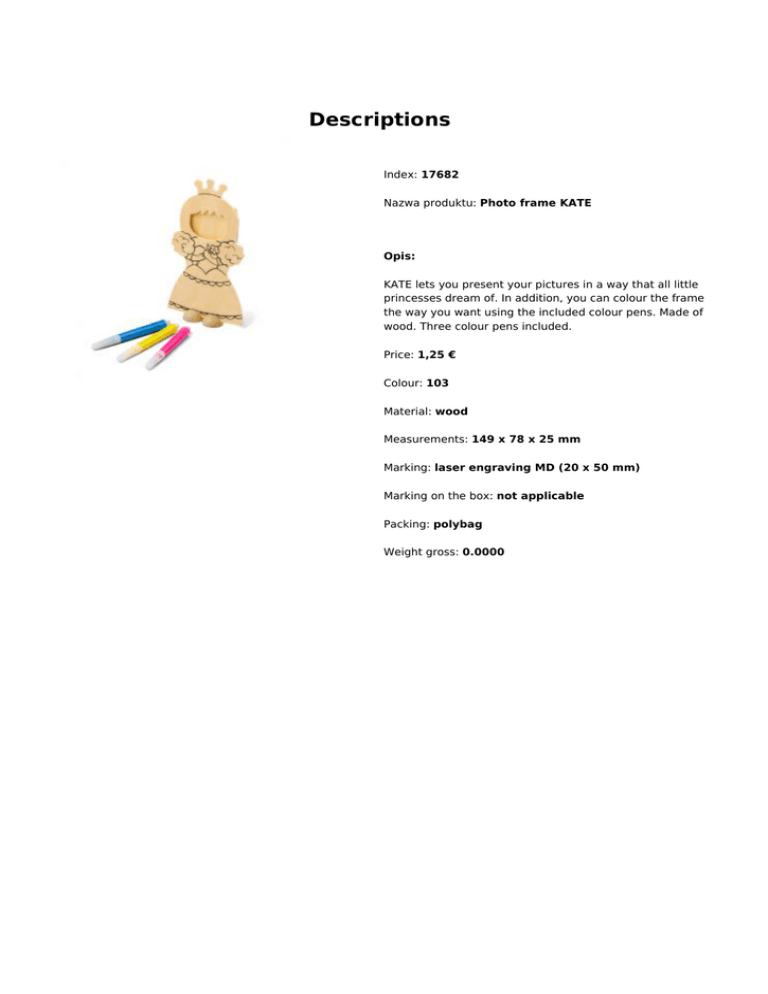 Descriptions Index: 17682 Nazwa produktu: Photo frame KATE Opis: KATE lets you present your pictures in a way that all little princesses dream of. In addition, you can colour the frame the way you want using the included colour pens. Made of wood. Three colour pens included. Price: 1,25 € Colour: 103 Material: wood Measurements: 149 x 78 x 25 mm Marking: laser engraving MD (20 x 50 mm) Marking on the box: not applicable Packing: polybag Weight gross: 0.0000 Powered by TCPDF (www.tcpdf.org)