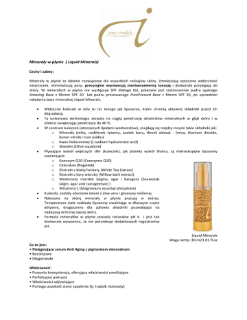 Minerały w płynie ( Liquid Minerals) Cechy i zalety: Minerały w płynie to idealne rozwiązanie dla wszystkich rodzajów skóry. Zmniejszają optycznie widoczność zmarszczek, minimalizują pory, precyzyjnie wyrównują nierównomierną tonację i doskonale przylegają do skóry. W minerałach w płynie nie występuje SPF dlatego też, polecane jest zastosowanie pudru sypkiego Amazing Base z filtrem SPF 20 lub pudru prasowanego PurePressed Base z filtrem SPF 20, po uprzednim nałożeniu bazy mineralnej Liquid Minerals. • • • • • • • Widoczne kuleczki w żelu to nic innego jak liposomy, które chronią aktywne składniki przed ich degradacją Ta unikatowa technologia zezwala na ciągłą penetrację składników mineralnych w głąb skóry i w efekcie zwiększając penetracje do 40 %. W centrum kuleczek (otoczonych lipidami wodorostów), znajdują się między innymi takie składniki jak: o Minerały (mika, nadtlenek tytantu, azotek boru, tlenek żelaza) - (mica, titanium dioxide, boron nitride i iron oxides) o Kwas hialuronowy (L-sodium hyaluronate acid) o Skwalen (Olive squalane) Pływające wokół większych sfer (kuleczek), jak planety wokół Słońca, są mikroskopijne liposomy zawierające: o Koenzym Q10 (Coenzyme Q10) o Calendula (Nagietek) o Ekstrakt z białej herbaty (White Tea Extract) o Ekstrakt z kory wierzby (Willow bark extract) o Wodorosty morskie (algina, agar i karagen) (Seaweeds (algin, agar and carrageenan) ) o Witamina C (Magnesium ascorbyl phosphate) Kuleczki, zostały otoczone żelem z aloe vera i gliceryny roślinnej Nałożone na skórę minerały w płynie pracują w skórze. Temperatura ciała rozkłada liposomy uwalniając w dłuższym czasie aktywne, drogocenne dla zdrowia składniki pozwalające na najlepszą ochronę naszej skóry. Formuła minerałów w płynie posiada naturalne pH 6 i jest tak doskonale wyważona, że nie potrzebuje dodatkowych regulatorów pH. Liquid Minerals Waga netto: 30 ml/1.01 fl oz Co to jest: • Pielęgnujące serum Anti Aging z pigmentem mineralnym • Bezolejowe • Długotrwałe Właściwości: • Puszysta konsystencja, oferująca właściwości nawilżające • Perfekcyjne pokrycie • Właściwości odżywiające • Pomaga uspokoić stany zapalenie (tj. trądzik różowaty) • Dostarcza lekkiego do średniego pokrycia • Minimalizuje optycznie drobne zmarszczki i pory skóry • Ukrywa zaczerwienienia Składniki: Water/Eau/Aqua, Titanium Dioxide (CI 77891), Glycerin, Algae, Sodium Hyaluronate, Avena Sativa (Oat) Kernel Extract, Glyceryl Polymethacrylate, Salix Nigra (Willow) Bark Extract, Calendula Officinalis Flower Oil, Camellia Sinensis (White Tea) Leaf Extract, Aloe Barbadensis Leaf Juice, Raphanus Sativus (Radish) Root Extract, Chondrus Crispus (Carrageenan) Extract, Hyaluronic Acid, Magnesium Ascorbyl Phosphate (Vitamin C), Squalane, Ubiquinone (Coenzyme Q10), Boron Nitride, Stearic Acid. Może zawierać: Mica (CI 77019), Iron Oxides (CI 77491, CI 77492, CI 77499), Chromium Oxide Greens (CI 77288). Kluczowe składniki: • Kwas hialuronowy (Hyaluronic Acid) o Przyciąga wilgoć - może pomieścić w wodzie 40 krotną jego wagę • Witamina C o Pomaga odwrócić szkody spowodowane promieniami UV o Tłumi tworzenie się melaniny o Chroni • Koenzym Q10 (Coenzyme Q10) o Pomaga odwrócić oznaki starzenia się o Chroni Rodzaje skóry: • Wszystkie rodzaje skóry System: • Pędzel Foundation • Puder sypki Amazing Base lub puder prasowany PurePressed Base Zalecane przygotowanie: • Oczyść skórę twarzy rękawicą Magic Mitt bądź innym wybranym zmywaczem. • Zastosuj odpowiedni produkt nawilżający i poczekaj aż do całkowitego wchłonięcia. • Jeżeli jest to niezbędne, spryskaj skórę twarz odpowiednią wodą nawilżającą, a następnie poczekaj do całkowitego wyschnięcia. • Wykonaj aplikację minerałów w płynie według instrukcji. Aplikacja: Przy pierwszym użyciu naciśnij pompkę produktu około ośmiu razy aż do uzyskania określonego koloru bazy mineralnej. Przezroczysty bądź pół przezroczysty żel usuń, bądź wetrzyj w skórę dłoni - posiada on właściwości odżywcze doskonałe dla skóry. Ten krok nie będzie już konieczne przy ponownym użyciu produktu. 1.Umieść dwie pompki minerałów w płynie na metalowej paletce bądź na zewnętrznej stronie czystej dłoni. 2.Płaską stroną pędzelka Foundation wymieszaj produkt kolistym ruchem do czasu aż wszystkie składniki zostaną połączone. 3.Nakładanie bazy rozpocznij od prawego policzka. Nanieś produkt ruchem krzyżowym z zewnątrz do wewnątrz twarzy, lekkim bądź średnim naciskiem. Lekko naciskają, nałóż produkt wokół prawego oka. 4.Pobierz produkt za pomocą pędzelka z palety lub dłoni. Rozpocznij nakładanie bazy na lewy policzek. Nanieś produkt ruchem krzyżowym z zewnątrz do wewnątrz twarzy, lekkim bądź średnim naciskiem. Lekko naciskając, nałóż produkt wokół lewego oka. 5.Pobierz produkt za pomocą pędzelka z palety lub dłoni. Rozpocznij nakładanie bazy na centralną część czoła. Nanieś produkt ruchem krzyżowym na całe czoło, w dół nosa, wokół ust w kierunku podbródka. 6.Pobierz produkt za pomocą pędzelka z palety lub dłoni. Rozpocznij nakładanie podkładu od prawego ucha do szczęki i brody szybko, lekkim bądź średnim uciskiem wykonując ruchy krzyżowe tak aby pokryć prawą stronę szyi. Powtórz te same elementy po lewej stronie szyi. • • • W razie potrzeby, czystą, sucha gąbką Flocked Sponge rozetrzyj podkład używając ruchu falistego Pozwól aby minerały w płynie wchłonęły się w skórę Nanieś puder sypki Amazing Base lub puder prasowany PurePressed Base Bardzo istotne jest aby nie traktować minerałów w płynie jak tradycyjny fluid. Minerały w płynie to zaawansowana technologia liposomowa. Duże liposomy zawieszone w żelu są podzielone na małe części, a następnie wypompowywane z pojemnika. Otaczające je mikroskop