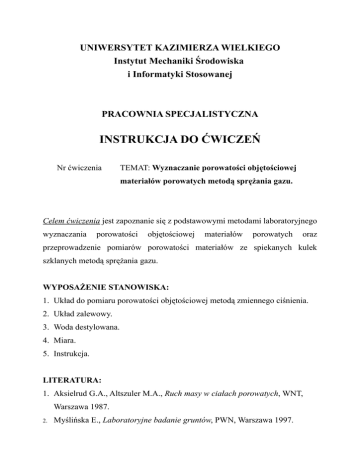 UNIWERSYTET KAZIMIERZA WIELKIEGO Instytut Mechaniki Środowiska i Informatyki Stosowanej PRACOWNIA SPECJALISTYCZNA INSTRUKCJA DO ĆWICZEŃ Nr ćwiczenia TEMAT: Wyznaczanie porowatości objętościowej materiałów porowatych metodą sprężania gazu. Celem ćwiczenia jest zapoznanie się z podstawowymi metodami laboratoryjnego wyznaczania porowatości objętościowej materiałów porowatych oraz przeprowadzenie pomiarów porowatości materiałów ze spiekanych kulek szklanych metodą sprężania gazu. WYPOSAŻENIE STANOWISKA: 1. Układ do pomiaru porowatości objętościowej metodą zmiennego ciśnienia. 2. Układ zalewowy. 3. Woda destylowana. 4. Miara. 5. Instrukcja. LITERATURA: 1. Aksielrud G.A., Altszuler M.A., Ruch masy w ciałach porowatych, WNT, Warszawa 1987. 2. Myślińska E., Laboratoryjne badanie gruntów, PWN, Warszawa 1997. 1. Podstawy teoretyczne Wiele materiałów pochodzenia naturalnego i technicznie wytworzonych posiada w swej budowie wewnętrznej dużą liczbę pustych przestrzeni o wielkości względnie małej w porównaniu z wymiarem charakterystycznym samego ciała. Przestrzenie takie, niezależnie od ich kształtu i wymiarów nazywane są porami, a materiały, w których one występują materiałami porowatymi. Do materiałów porowatych technicznych i pochodzenia naturalnego należą: - grunty, skały, złoża węglowe, złoża roponośne, drewno, tkanki kostne, mięśnie, tkanki roślin, itp., - tworzywa sztuczne piankowe (pianki poliestrowe, poliuretanowe, szkło piankowe), włókniny, błony półprzepuszczalne, betony, ceramika, spieki metali, pumeks, itp. Wzajemnie połączone pory tworzą w materiale porowatym przestrzeń porową, przeważnie wypełnioną płynem, powietrzem, wodą, gazem ziemnym, ropą itd., który może się przemieszczać. Część stałą takich materiałów nazywamy szkieletem. W zależności od stopnia połączenia porów między sobą oraz z otoczeniem rozróżnia się pory przelotowe, nieprzelotowe (ślepe) i zamknięte. Przepływ cieczy i gazów możliwy jest tylko w porach otwartych. W porach takich przepływowi płynu towarzyszyć mogą zjawiska wymiany ciepła, filtracji, dyfuzji, sorpcji a także reakcji chemicznych. Z tego powodu objętość porów połączonych nazywana jest często objętością aktywną porów lub objętością efektywną. Objętość wszystkich porów nazywana jest objętością całkowitą porów. Niezależnie od składu chemicznego i rodzaju materiałów porowatych różniących się własnościami fizycznymi, wspólną cechą takich materiałów jest wewnętrzna struktura wzajemnie połączonych porów. 2 Do najważniejszych parametrów charakteryzujących strukturę materiałów porowatych należą: - porowatość objętościowa, - przepuszczalność, - powierzchnia właściwa. Porowatość objętościowa materiału porowatego oznaczana jest przez fv i definiowana jako stosunek objętości porów Vp zawartych w próbce materiału porowatego do całkowitej objętości próbki V , tj. fv = (1) Vp , V 0 ≤ fv ≤ 1 . Ze względu na zależność (2) V p + Vs = V porowatość objętościową możemy zdefiniować równoważnie wzorem (3) fv = V − Vs V =1− s V V gdzie Vs jest objętością materiału szkieletu w próbce. Dla materiałów porowatych złożonych z regularnie rozmieszczonych cząstek np. z kulek porowatość objętościowa może być obliczona na podstawie wymiarów i rozmieszczenia kulek. Nie zależy ona od wymiarów cząstek, które tworzą ośrodek, zależy natomiast od kształtu tych cząstek i ich rozmieszczenia 3 w materiale porowatym. Dla rzeczywistych materiałów porowatych, których geometria porów jest bardzo złożona, bezpośrednie obliczenie porowatości jest trudne do wykonania. W takim przypadku porowatość objętościową wyznacza się eksperymentalnie wykorzystując definicje (1) bądź (3). W materiałach o złożonej budowie wewnętrznej porów obok tak zdefiniowanej porowatości objętościowej, nazywanej również porowatością całkowitą, wyróżniamy także porowatość: - rzeczywistą, - aktywną, - zamkniętą. Porowatość rzeczywista jest to stosunek objętości porów otwartych zawartych w próbce materiału porowatego do całkowitej objętości próbki. W ciałach o małej zawartości porów zamkniętych porowatość całkowita i rzeczywista przyjmują zbliżone wartości. Porowatość zamknięta jest różnicą porowatości całkowitej i rzeczywistej. W takich materiałach porowatych jak: szkło piankowe, piankowe tworzywa sztuczne, niektóre spieki ceramiczne i z proszków metali większą część przestrzeni porowej tworzą pory zamknięte. Porowatość aktywna jest to stosunek objętości porów przelotowych, przez które może zachodzić przepływ płynu, zawartych w jednostce objętości materiału porowatego. Przepuszczalność jest to zdolność materiału porowatego do przepuszczania cieczy i gazów przez przestrzeń porową pod wpływem różnicy ciśnień. Przepuszczalność jest jednym z kryteriów oceny właściwości izolacyjnych i zdolności przepuszczania płynów materiałów budowlanych, izolacji cieplnych, materiałów filtracyjnych, sorbentów i katalizatorów. Przepuszczalność silnie zależy od powierzchni właściwej. 4 Powierzchnia właściwa jest to stosunek pola powierzchni wewnętrznej porów zawartych w próbce materiału porowatego do objętości tej próbki. Powierzchnia właściwa jest ważną cechą przepuszczalnych materiałów porowatych, decyduje bowiem o przebiegu tych procesów, dla których wielkość rozwinięcia powierzchni porów ma podstawowe znaczenie (np. sorbenty, katalizatory, wypełniacze jonowe, izolacje cieplne). 2. Podstawowe metody wyznaczania porowatości objętościowej Z definicji (1) porowatości objętościowej fv próbki materiału porowatego, którą można zapisać w postaci fv = (4) Vp V = 1- Vs V wynika, że dla określenia porowatości objętościowej należy wyznaczyć dwie z trzech następując