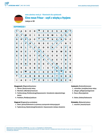 www.aterima-med.pl - Niemiecki dla opiekunek Eine neue Frisur - czyli z wizytą u fryzjera Lekcja nr 48 ODPOWIEDZI I T A S C H N E H C S A W T S Y M E I S E N M L C Ȍ K S D P S C F Ȍ H N E N U Z C J F B I N S E L E I N T H R L T E K O R N I S F B N H E I F R S I N D M Ä R E ö G S T A A S C H I R O I T E C Z S A T U E T B T D R N H O U G E U W T E U E K A S B R I S T N A N M N E M A N I K Ü R E G O N F F A R B B E R A T U N G I A E I P E D I K Û R E O Waagerecht [Wagereśt] poziomo: 1. föhnen [fynen] suszyć włosy 2. Maniküre [Manikyre] manicure 3. Farbberatung [Farbberatung] dopasowanie i doradzenie odpowiedniego koloru 4. Pediküre [Pedikyre] pedicure Senkrecht [Zenkreśt] pionowo: 1. schneiden [sznajden] strzyc włosy 2. pflegen [pflegen] pielęgnować 3. Rasur [Razur] golenie Diagonal [Diagonal] po przekątnej: 1. tönen [tynen] farbowanie za pomocą szamponów koloryzujących 2. Typberatung [Typberatung] doradzenie i dopasowanie rodzaju strzyżenia Rückwärts [Rykwerts] wstecz: 1. waschen [waszen] mycie 4. färben [ferben] farbowanie ODPOWIEDZI II 1. Nachdem ich mir die Haare gewaschen habe, muss ich sie föhnen [Nachdejm iś mija di Hare gewaszen habe, mus iś zi fynen]. Po tym jak umyłam włosy, muszę je wysuszyć. 2. Meine Haare sind ein bisschen zu lang. Schneiden Sie mir bitte die Spitzen. [Majne Hare zind ajn bissien cu lang. Sznajden Zi mija byte di Szpicen]. Moje włosy są trochę za długie. Proszę mi podciąć końcówki. 3. Machen Sie mir bitte ein paar Strähnchen, um graue Haare abzudecken. [Machen Zi mija byte ajn paa Sztrensien, um grałe Hare abcudeken]. Proszę mi zrobić kilka pasemek, żeby zakryć siwe włosy. 4. Deine Haare sind zu lang, du sollst sie schneiden lassen. [Dajne Hare zind cu lang, du zolst zi sznajden lasen]. Twoje włosy są za długie, powinnaś je obciąć. 5. Ihre Haare sind so trocken. Sie muss jeden Tag die Spülung auftragen. [Ire Hare zind zo troken. Zi mus jeden Tag di Szpylung ałftragen]. Jej włosy są tak suche. Ona musi codziennie nakładać odżywkę.