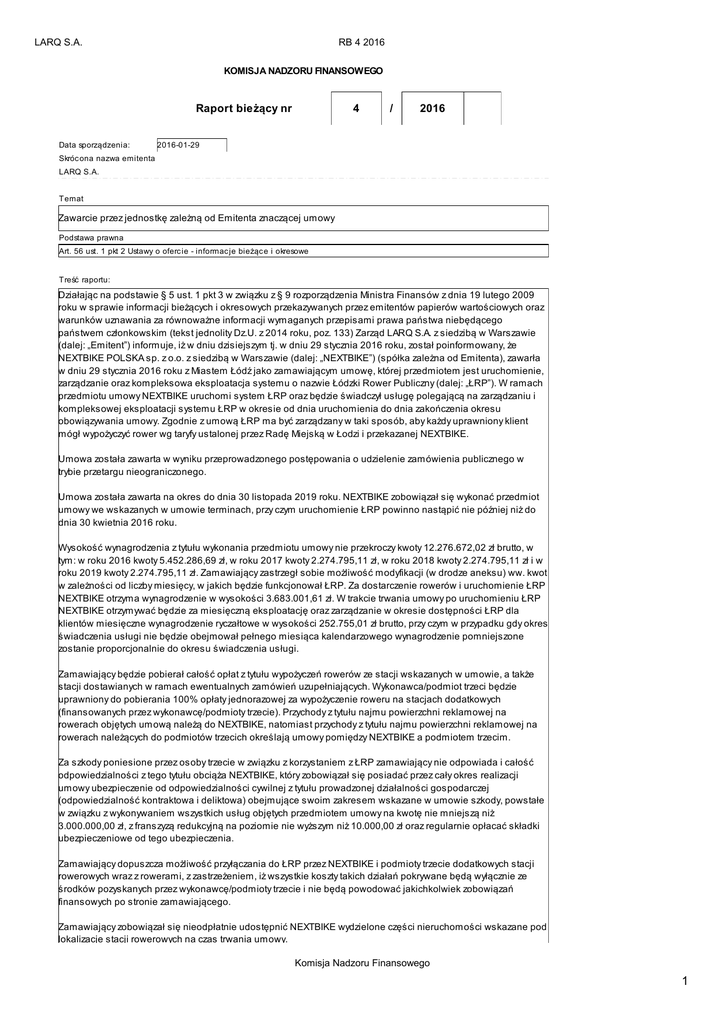 LARQ S.A. RB 4 2016 KOMISJA NADZORU FINANSOWEGO Raport bieżący nr Data sporządzenia: 4 / 2016 2016-01-29 Skróc ona nazwa emitenta LARQ S.A. Temat Zawarcie przez jednostkę zależną od Emitenta znaczącej umowy Podstawa prawna Art. 56 ust. 1 pkt 2 Ustawy o oferc ie - informac je bieżąc e i okresowe Treść raportu: Działając na podstawie § 5 ust. 1 pkt 3 w związku z § 9 rozporządzenia Ministra Finansów z dnia 19 lutego 2009 roku w sprawie informacji bieżących i okresowych przekazywanych przez emitentów papierów wartościowych oraz warunków uznawania za równoważne informacji wymaganych przepisami prawa państwa niebędącego państwem członkowskim (tekst jednolity Dz.U. z 2014 roku, poz. 133) Zarząd LARQ S.A. z siedzibą w Warszawie (dalej: „Emitent”) informuje, iż w dniu dzisiejszym tj. w dniu 29 stycznia 2016 roku, został poinformowany, że NEXTBIKE POLSKA sp. z o.o. z siedzibą w Warszawie (dalej: „NEXTBIKE”) (spółka zależna od Emitenta), zawarła w dniu 29 stycznia 2016 roku z Miastem Łódź jako zamawiającym umowę, której przedmiotem jest uruchomienie, zarządzanie oraz kompleksowa eksploatacja systemu o nazwie Łódzki Rower Publiczny (dalej: „ŁRP”). W ramach przedmiotu umowy NEXTBIKE uruchomi system ŁRP oraz będzie świadczył usługę polegającą na zarządzaniu i kompleksowej eksploatacji systemu ŁRP w okresie od dnia uruchomienia do dnia zakończenia okresu obowiązywania umowy. Zgodnie z umową ŁRP ma być zarządzany w taki sposób, aby każdy uprawniony klient mógł wypożyczyć rower wg taryfy ustalonej przez Radę Miejską w Łodzi i przekazanej NEXTBIKE. Umowa została zawarta w wyniku przeprowadzonego postępowania o udzielenie zamówienia publicznego w trybie przetargu nieograniczonego. Umowa została zawarta na okres do dnia 30 listopada 2019 roku. NEXTBIKE zobowiązał się wykonać przedmiot umowy we wskazanych w umowie terminach, przy czym uruchomienie ŁRP powinno nastąpić nie później niż do dnia 30 kwietnia 2016 roku. Wysokość wynagrodzenia z tytułu wykonania przedmiotu umowy nie przekroczy kwoty 12.276.672,02 zł brutto, w tym: w roku 2016 kwoty 5.452.286,69 zł, w roku 2017 kwoty 2.274.795,11 zł, w roku 2018 kwoty 2.274.795,11 zł i w roku 2019 kwoty 2.274.795,11 zł. Zamawiający zastrzegł sobie możliwość modyfikacji (w drodze aneksu) ww. kwot w zależności od liczby miesięcy, w jakich będzie funkcjonował ŁRP. Za dostarczenie rowerów i uruchomienie ŁRP NEXTBIKE otrzyma wynagrodzenie w wysokości 3.683.001,61 zł. W trakcie trwania umowy po uruchomieniu ŁRP NEXTBIKE otrzymywać będzie za miesięczną eksploatację oraz zarządzanie w okresie dostępności ŁRP dla klientów miesięczne wynagrodzenie ryczałtowe w wysokości 252.755,01 zł brutto, przy czym w przypadku gdy okres świadczenia usługi nie będzie obejmował pełnego miesiąca kalendarzowego wynagrodzenie pomniejszone zostanie proporcjonalnie do okresu świadczenia usługi. Zamawiający będzie pobierał całość opłat z tytułu wypożyczeń rowerów ze stacji wskazanych w umowie, a także stacji dostawianych w ramach ewentualnych zamówień uzupełniających. Wykonawca/podmiot trzeci będzie uprawniony do pobierania 100% opłaty jednorazowej za wypożyczenie roweru na stacjach dodatkowych (finansowanych przez wykonawcę/podmioty trzecie). Przychody z tytułu najmu powierzchni reklamowej na rowerach objętych umową należą do NEXTBIKE, natomiast przychody z tytułu najmu powierzchni reklamowej na rowerach należących do podmiotów trzecich określają umowy pomiędzy NEXTBIKE a podmiotem trzecim. Za szkody poniesione przez osoby trzecie w związku z korzystaniem z ŁRP zamawiający nie odpowiada i całość odpowiedzialności z tego tytułu obciąża NEXTBIKE, który zobowiązał się posiadać przez cały okres realizacji umowy ubezpieczenie od odpowiedzialności cywilnej z tytułu prowadzonej działalności gospodarczej (odpowiedzialność kontraktowa i deliktowa) obejmujące swoim zakresem wskazane w umowie szkody, powstałe w związku z wykonywaniem wszystkich usług objętych przedmiotem umowy na kwotę nie mniejszą niż 3.000.000,00 zł, z franszyzą redukcyjną na poziomie nie wyższym niż 10.000,00 zł oraz regularnie opłacać składki ubezpieczeniowe od tego ubezpieczenia. Zamawiający dopuszcza możliwość przyłączania do ŁRP przez NEXTBIKE i podmioty trzecie dodatkowych stacji rowerowych wraz z rowerami, z zastrzeżeniem, iż wszystkie koszty takich działań pokrywane będą wyłącznie ze środków pozyskanych przez wykonawcę/podmioty trzecie i nie będą powodować jakichkolwiek zobowiązań finansowych po stronie zamawiającego. Zamawiający zobowiązał się nieodpłatnie udostępnić NEXTBIKE wydzielone części nieruchomości wskazane pod lokalizacje stacji rowerowych na czas trwania umowy. Komisja Nadzoru Finansowego 1 LARQ S.A. lokalizacje stacji rowerowych na czas trwania umowy. RB 4 2016 Po zakończeniu realizacji umowy NEXTBIKE obowiązany jest usunąć elementy ŁRP z przestrzeni publicznej w terminie 30 dni od dnia wygaśnięcia umowy. W przypadku niewykonania tegoż obowiązku zamawiający jest uprawniony do zlecenia wykonania go podmiotowi trzeciemu na koszt i niebezpieczeństwo NEXTBIKE. Na żądanie zamawiającego NEXTBIKE zobowiązany jest sprzedać na rzecz zamawiającego cały system ŁRP wraz z oprogramowaniem lub wybrane przez zamawiającego poszczególne elementy systemu ŁRP za cenę brutto równą niezamortyzowanej części systemu ustalonej na dzień wygaśnięcia lub rozwiązania umowy, lecz nie niższą niż 1,00 zł brutto i nie wyższą od ich wartości rynkowej. Niezależnie na rzecz zamawiającego zostało zastrzeżone prawo pierwokupu w stosunku do wszystkich elementów tworzących system ŁRP sprzedawanych przez wykonawcę w okresie obowiązywania umowy oraz w okresie kolejnych 6 miesięcy od daty rozwiązania lub wygaśnięcia umowy. Prawo pierwokupu będzie realizowane 