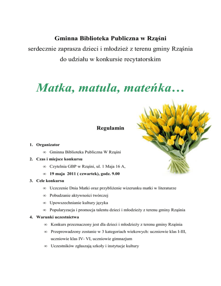 Gminna Biblioteka Publiczna w Rząśni serdecznie zaprasza dzieci i młodzież z terenu gminy Rząśnia do udziału w konkursie recytatorskim Matka, matula, mateńka… Regulamin 1. Organizator • Gminna Biblioteka Publiczna W Rząśni 2. Czas i miejsce konkursu • Czytelnia GBP w Rząśni, ul. 1 Maja 16 A, • 19 maja 2011 ( czwartek), godz. 9.00 3. Cele konkursu • Uczczenie Dnia Matki oraz przybliżenie wizerunku matki w literaturze • Pobudzanie aktywności twórczej • Upowszechnianie kultury języka • Popularyzacja i promocja talentu dzieci i młodzieży z terenu gminy Rząśnia 4. Warunki uczestnictwa • Konkurs przeznaczony jest dla dzieci i młodzieży z terenu gminy Rząśnia • Przeprowadzony zostanie w 3 kategoriach wiekowych: uczniowie klas I-III, uczniowie klas IV- VI, uczniowie gimnazjum • Uczestników zgłaszają szkoły i instytucje kultury • Każda szkoła może zgłosić 6 uczestników, pozostałe instytucje mogą zgłosić maksymalnie 3 osoby • Każdy z uczestników konkursu przygotowuje do recytacji wiersz lub fragment prozy poświęcony MATCE • Można zaprezentować własny utwór • Czas występu nie może przekroczyć 5 min. • Zgłoszenia do udziału w konkursie należy dostarczyć osobiście na załączonej karcie uczestnika do 7 maja 2011 do GBP w Rząśni Ul. 1 Maja 16 A , tel. 44 631 77 38 5. Jury \ nagrody • Komisję konkursową powołuje organizator • Ogłoszenie wyników odbędzie się po prezentacji wszystkich wierszy i dokonaniu oceny przez jury 19 maja 2011, natomiast wręczenie nagród i dyplomów 26 maja 2011 • Laureaci konkursu zaprezentują utwory podczas uroczystych obchodów Dnia Matki • Jury dokona oceny uczestników według kryteriów : dobór i znajomość tekstu, interpretacja utworu, ogólny wyraz artystyczny 6. Uwagi • Regulamin konkursu dostępny będzie w Internecie na stronach : www.gbprzasnia.pl oraz biblioteka-stroza.blog.onet.pl • Organizatorzy nie pokrywają kosztów podróży uczestników i ich opiekunów • Organizatorzy zastrzegają sobie prawo do fotografowania • Udział w konkursie jest równoznaczny z wyrażeniem zgody na publikowanie zdjęć i relacji na wyżej wymienionych stronach internetowych • Szczegółowe informacje udzielane będą w GBP w Rząśni oraz filiach : w Białej, w Kodraniu i Stróży • Kontakt GBP W Rząśni ul. 1 Maja 16A tel. 44 631 77 38 , e-mail: [email protected]