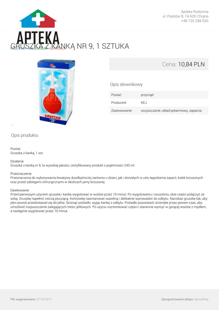 Apteka Rodzinna ul. Piastów 8, 74-500 Chojna +48 725 298 530 GRUSZKA Z KANKĄ NR 9, 1 SZTUKA Cena: 10,84 PLN Opis słownikowy Postać przyrząd Producent KEJ Zastosowanie oczyszczanie, układ pokarmowy, zaparcia Opis produktu Postać Gruszka z kanką, 1 szt. Działanie Gruszka z kanką nr 9, to wysokiej jakości, certyfikowany produkt o pojemności 240 ml. Przeznaczenie Przeznaczona do wykonywania lewatywy doodbytniczej zarówno u dzieci, jak i dorosłych w celu łagodzenia zaparć, kolek brzusznych oraz przed zabiegami chirurgicznymi w okolicach jamy brzusznej. Dawkowanie Przed pierwszym użyciem gruszkę i kankę wygotować w wodzie przez 10 minut. Po wygotowaniu i osuszeniu, obie części połączyć ze sobą. Gruszkę napełnić cieczą płuczącą. Końcówkę nasmarować wazeliną i delikatnie wprowadzić do odbytu. Naciskać gruszkę tak, aby płyn powoli przedostawał się do jelita. Ścisnąć pośladki, wyjąc kankę z odbytu. Pośladki pozostawić ściśnięte przez pewien czas, aby umożliwić rozpuszczenie zalegających treści jelitowych. Po użyciu rozmontować części i starannie wymyć w gorącej wodzie z mydłem, a następnie wygotować przez 10 minut. Plik wygenerowano: 07-03-2017 Powered by TCPDF (www.tcpdf.org) Oprogramowanie sklepu: AptusShop
