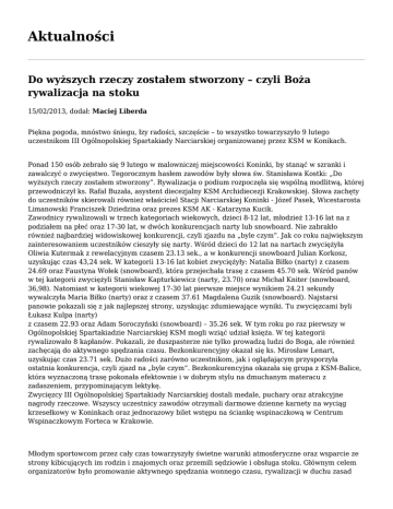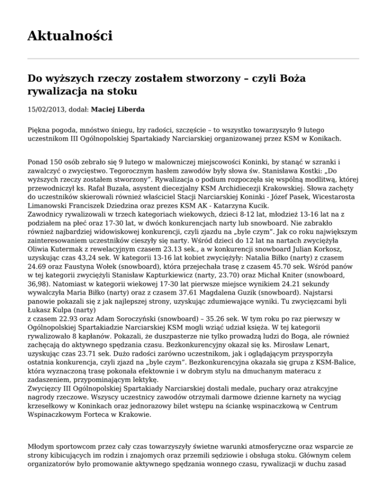 Aktualności Do wyższych rzeczy zostałem stworzony – czyli Boża rywalizacja na stoku 15/02/2013, dodał: Maciej Liberda Piękna pogoda, mnóstwo śniegu, łzy radości, szczęście – to wszystko towarzyszyło 9 lutego uczestnikom III Ogólnopolskiej Spartakiady Narciarskiej organizowanej przez KSM w Konikach. Ponad 150 osób zebrało się 9 lutego w malowniczej miejscowości Koninki, by stanąć w szranki i zawalczyć o zwycięstwo. Tegorocznym hasłem zawodów były słowa św. Stanisława Kostki: „Do wyższych rzeczy zostałem stworzony”. Rywalizacja o podium rozpoczęła się wspólną modlitwą, której przewodniczył ks. Rafał Buzała, asystent diecezjalny KSM Archidiecezji Krakowskiej. Słowa zachęty do uczestników skierowali również właściciel Stacji Narciarskiej Koninki - Józef Pasek, Wicestarosta Limanowski Franciszek Dziedzina oraz prezes KSM AK - Katarzyna Kucik. Zawodnicy rywalizowali w trzech kategoriach wiekowych, dzieci 8-12 lat, młodzież 13-16 lat na z podziałem na płeć oraz 17-30 lat, w dwóch konkurencjach narty lub snowboard. Nie zabrakło również najbardziej widowiskowej konkurencji, czyli zjazdu na „byle czym”. Jak co roku największym zainteresowaniem uczestników cieszyły się narty. Wśród dzieci do 12 lat na nartach zwyciężyła Oliwia Kutermak z rewelacyjnym czasem 23.13 sek., a w konkurencji snowboard Julian Korkosz, uzyskując czas 43,24 sek. W kategorii 13-16 lat kobiet zwyciężyły: Natalia Biłko (narty) z czasem 24.69 oraz Faustyna Wołek (snowboard), która przejechała trasę z czasem 45.70 sek. Wśród panów w tej kategorii zwyciężyli Stanisław Kapturkiewicz (narty, 23.70) oraz Michał Kniter (snowboard, 36,98). Natomiast w kategorii wiekowej 17-30 lat pierwsze miejsce wynikiem 24.21 sekundy wywalczyła Maria Biłko (narty) oraz z czasem 37.61 Magdalena Guzik (snowboard). Najstarsi panowie pokazali się z jak najlepszej strony, uzyskując zdumiewające wyniki. Tu zwycięzcami byli Łukasz Kulpa (narty) z czasem 22.93 oraz Adam Soroczyński (snowboard) – 35.26 sek. W tym roku po raz pierwszy w Ogólnopolskiej Spartakiadzie Narciarskiej KSM mogli wziąć udział księża. W tej kategorii rywalizowało 8 kapłanów. Pokazali, że duszpasterze nie tylko prowadzą ludzi do Boga, ale również zachęcają do aktywnego spędzania czasu. Bezkonkurencyjny okazał się ks. Mirosław Lenart, uzyskując czas 23.71 sek. Dużo radości zarówno uczestnikom, jak i oglądającym przysporzyła ostatnia konkurencja, czyli zjazd na „byle czym”. Bezkonkurencyjna okazała się grupa z KSM-Balice, która wyznaczoną trasę pokonała efektownie i w dobrym stylu na dmuchanym materacu z zadaszeniem, przypominającym lektykę. Zwycięzcy III Ogólnopolskiej Spartakiady Narciarskiej dostali medale, puchary oraz atrakcyjne nagrody rzeczowe. Wszyscy uczestnicy zawodów otrzymali darmowe dzienne karnety na wyciąg krzesełkowy w Koninkach oraz jednorazowy bilet wstępu na ściankę wspinaczkową w Centrum Wspinaczkowym Forteca w Krakowie. Młodym sportowcom przez cały czas towarzyszyły świetne warunki atmosferyczne oraz wsparcie ze strony kibicujących im rodzin i znajomych oraz przemili sędziowie i obsługa stoku. Głównym celem organizatorów było promowanie aktywnego spędzania wonnego czasu, rywalizacji w duchu zasad fair play oraz kontakt z Panem Bogiem i drugim człowiekiem. Udział w Spartakiadzie był bezpłatny, zapisać się mógł każdy amator, wypełniając formularz zgłoszeniowy na stronie KSM AK. Honorowym patronatem Spartakiadę objęli: Jego Eminencja Ksiądz Stanisław Kardynał Dziwisz, Metropolita Krakowski oraz Jan Puchała, Starosta Limanowski. Partnerem strategicznym imprezy oraz sponsorem była Stacja Narciarska Koninki na czele z jej właścicielem, Józefem Paskiem. Współorganizatorami i sponsorami nagród rzeczowych było: Starostwo Powiatowe w Limanowej, Decathlon, Miasto i Gmina Mszana Dolna wraz z Wójtem Bolesławem Żabą oraz Gmina Niedźwiedź. Patronat medialny nad III Ogólnopolską Spartakiadą Narciarską KSM objęli: portal Franciszkańska 3, Radio Plus, Gość Niedzielny, Przewodnik Katolicki oraz Katolicki Miesięcznik Studencki Tryby. red. Karolina Mazurkiewicz Rzecznik prasowy KSM Te. 793 508 500 zdjęcia