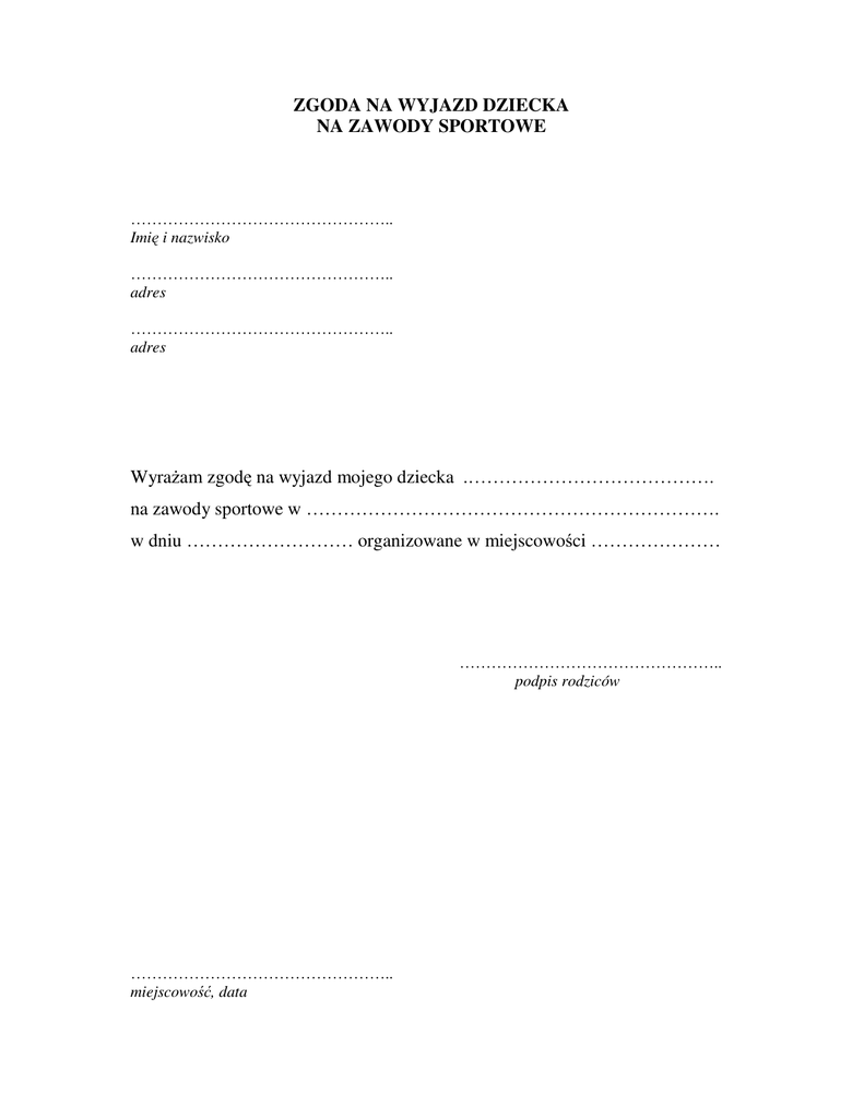 ZGODA NA WYJAZD DZIECKA NA ZAWODY SPORTOWE ………………………………………….. Imię i nazwisko ………………………………………….. adres ………………………………………….. adres Wyrażam zgodę na wyjazd mojego dziecka .…………………………………. na zawody sportowe w …………………………………………………………. w dniu ……………………… organizowane w miejscowości ………………… ………………………………………….. podpis rodziców ………………………………………….. miejscowość, data