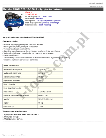 Informacje o produkcie Utworzono 07-03-2017 Metabo PROFI 320-10/100-3 - Sprężarka tłokowa Cena : 2.300,00 zł Sprężarka tłokowa Metabo Profi 320-10/100-3 Charakterystyka: ● ● ● ● ● ● ● Mobilne, dyspozycyjne olejowe sprężarki tłokowe Do wszystkich profesjonalnych zastosowań Termiczne zabezpieczenie silnika Osłonięty napęd pasowy, z dużymi kołami pełniącymi rolę wentylatora Wyłącznik ciśnieniowy z odciążającym zaworem rozruchowym Reduktor ciśnienia 2 manometry – wskazanie ciśnienia w zbiorniku i ciśnienia wyjściowego po redukcji Chłodnica wylotowa sprężonego powietrza co ● m .p l Nr katalogowy : 4116017797* Producent : Metabo Dostępność : Do wyczerpania zapasów Stan magazynowy : poniżej średniego Średnia ocena : brak recenzji Dane techniczne: wydajność efektywna 222 l/min 10 bar to ol ciśnienie maksymalne 320 l/min s. wydajność teoretyczna pojemność zbiornika 100 l ilość cylindrów 2 1 moc silnika 3.0 KM / 2.2 KW i- ilość stopni sprężania napięcie zasilania/częstotliwość 400/50 V/Hz wymiary 985x395x820 mm ciężar 69 kg GWARANCJA 2 lata Wyposażenie standardowe: 1. 2. 3. Sprężarka tłokowa Profi 320-10/100-3 Instrukcja obsługi Opakowanie: karton Wygenerowano w programie www.oscGold.com