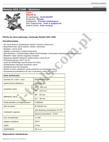Informacje o produkcie Utworzono 07-03-2017 Metabo KGS 216M - Ukośnica Cena : 888,00 zł Nr katalogowy : 0102160400* Producent : Metabo Dostępność : Produkt niedostępny Stan magazynowy : brak w magazynie Średnia ocena : brak recenzji m .p l Pilarka do cięcia kątowego i ukośnego Metabo KGS 216M Charakterystyka: ● ● ● ● ● ● ● ● ● ● ● Do cięcia drewna, powlekanych paneli i tworzyw sztucznych Bezproblemowe cięcia kątowe, ukośne i docinanie Wydajny, mocny silnik Stabilna, przenośna i trwała konstrukcja Stół obrotowy z ciśnieniowego odlewu aluminiowego z precyzyjną regulacją położeń kątowych Niewielki ciężar ułatwia wygodny transport Regulacja położeń kątowych stolika prawo / lewo do 47° Pochylanie głowicy od 0° do 45° Laser do dokładnego wyznaczania linii cięcia Zintegrowana regulacja wysokości cięcia Zabezpieczenie do transportu Worek na wióry zapewnia czyste powietrze na stanowisku pracy Łożyskowana prowadnica do cięć o szerokości maks. 305 mm co ● to ol Dane techniczne: s. ● wymiary dł. x szer. x wys. 820x543x355 mm powierzchnia odkładcza 364x700 mm wysokość cięcia i- głębokość cięcia 90 ° - 305 mm 45° - 215 mm 90° - 65 mm 45° - 36 mm liczba obrotów na biegu jałowym 5 000/min piła tarczowa Ø 216x30 mm możliwość regulacji stół obrotowy prawo/lewo 47°/47° głowica prawo/lewo - 0°/45° moc znamionowa 1,5 kW napięcie zasilania 230 V ciężar 14 kg GWARANCJA 36 m-cy Wyposażenie standardowe: Wygenerowano w programie www.oscGold.com 6. m .p l 5. co 4. s. 3. Pilarka do cięcia kątowego i ukośnego KGS 216 M Piła tarczowa z zębami przemiennymi z węglików spiekanych (40 zębów) Klucz do wymiany piły tarczowej Worek na wióry Instrukcja obsługi Opakowanie: karton to ol 2. i- 1.