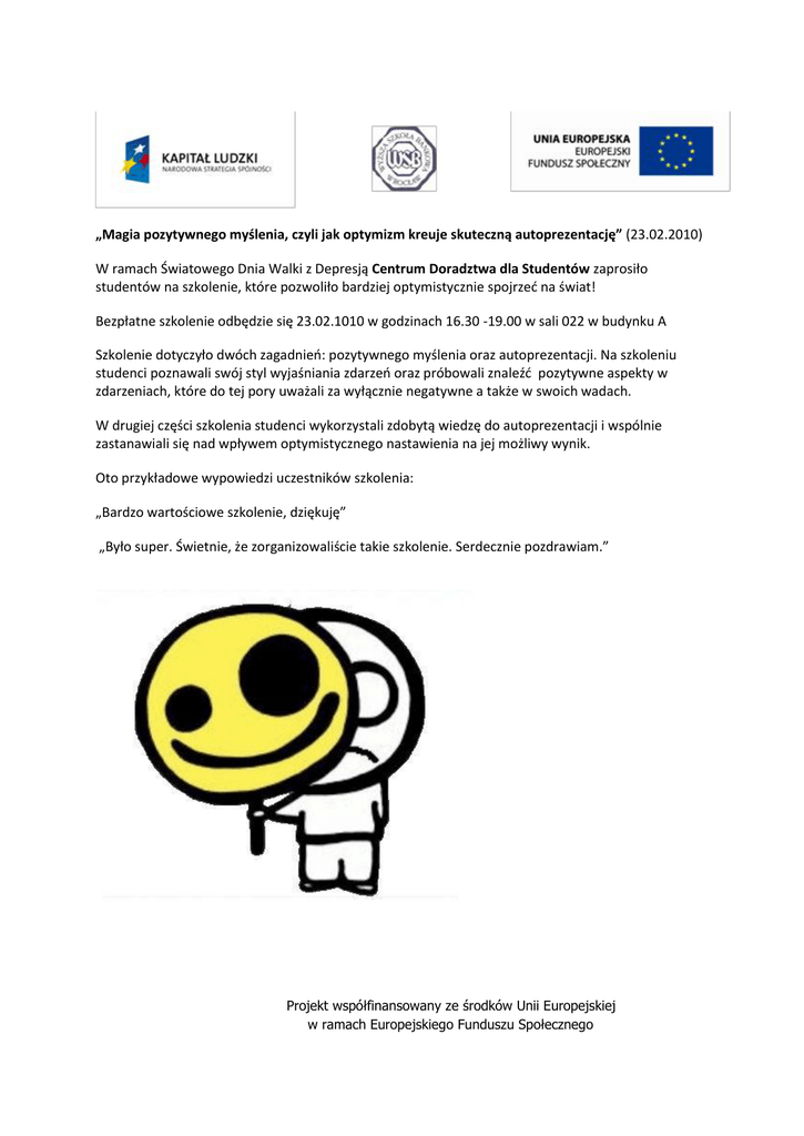 „Magia pozytywnego myślenia, czyli jak optymizm kreuje skuteczną autoprezentację” (23.02.2010) W ramach Światowego Dnia Walki z Depresją Centrum Doradztwa dla Studentów zaprosiło studentów na szkolenie, które pozwoliło bardziej optymistycznie spojrzed na świat! Bezpłatne szkolenie odbędzie się 23.02.1010 w godzinach 16.30 -19.00 w sali 022 w budynku A Szkolenie dotyczyło dwóch zagadnieo: pozytywnego myślenia oraz autoprezentacji. Na szkoleniu studenci poznawali swój styl wyjaśniania zdarzeo oraz próbowali znaleźd pozytywne aspekty w zdarzeniach, które do tej pory uważali za wyłącznie negatywne a także w swoich wadach. W drugiej części szkolenia studenci wykorzystali zdobytą wiedzę do autoprezentacji i wspólnie zastanawiali się nad wpływem optymistycznego nastawienia na jej możliwy wynik. Oto przykładowe wypowiedzi uczestników szkolenia: „Bardzo wartościowe szkolenie, dziękuję” „Było super. Świetnie, że zorganizowaliście takie szkolenie. Serdecznie pozdrawiam.” Projekt współfinansowany ze środków Unii Europejskiej w ramach Europejskiego Funduszu Społecznego