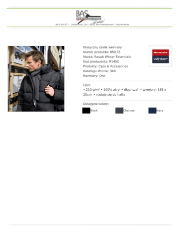 BAS SAFETY - Dorpstraat 104 - 6931 BM Westervoort - Netherlands Klasyczny szalik wełniany Numer produktu: 050.33 Marka: Result Winter Essentials Kod producenta: R145X Produkty: Caps & Accessories Katalogu stronie: 349 Rozmiary: One Opis: • 210 g/m² • 100% akryl • długi szal • wymiary: 165 x 20cm • nadaje się do haftu Dostępne kolory: Black Charcoal Navy