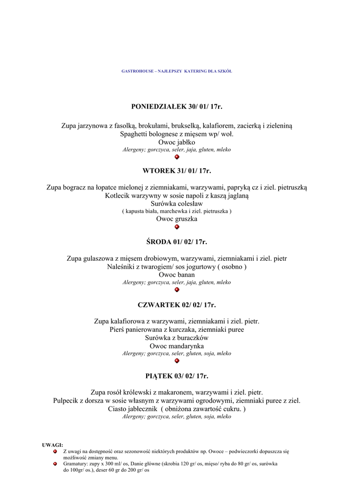 GASTROHOUSE – NAJLEPSZY KATERING DLA SZKÓŁ PONIEDZIAŁEK 30/ 01/ 17r. Zupa jarzynowa z fasolką, brokułami, brukselką, kalafiorem, zacierką i zieleniną Spaghetti bolognese z mięsem wp/ woł. Owoc jabłko Alergeny; gorczyca, seler, jaja, gluten, mleko WTOREK 31/ 01/ 17r. Zupa bogracz na łopatce mielonej z ziemniakami, warzywami, papryką cz i ziel. pietruszką Kotlecik warzywny w sosie napoli z kaszą jaglaną Surówka colesław ( kapusta biała, marchewka i ziel. pietruszka ) Owoc gruszka ŚRODA 01/ 02/ 17r. Zupa gulaszowa z mięsem drobiowym, warzywami, ziemniakami i ziel. pietr Naleśniki z twarogiem/ sos jogurtowy ( osobno ) Owoc banan Alergeny; gorczyca, seler, jaja, gluten, mleko CZWARTEK 02/ 02/ 17r. Zupa kalafiorowa z warzywami, ziemniakami i ziel. pietr. Pierś panierowana z kurczaka, ziemniaki puree Surówka z buraczków Owoc mandarynka Alergeny; gorczyca, seler, gluten, soja, mleko PIĄTEK 03/ 02/ 17r. Zupa rosół królewski z makaronem, warzywami i ziel. pietr. Pulpecik z dorsza w sosie własnym z warzywami ogrodowymi, ziemniaki puree z ziel. Ciasto jabłecznik ( obniżona zawartość cukru. ) Alergeny; gorczyca, seler, gluten, soja, mleko UWAGI: Z uwagi na dostępność oraz sezonowość niektórych produktów np. Owoce – podwieczorki dopuszcza się możliwość zmiany menu. Gramatury: zupy x 300 ml/ os, Danie główne (skrobia 120 gr/ os, mięso/ ryba do 80 gr/ os, surówka do 100gr/ os.), deser 60 gr do 200 gr/ os GASTROHOUSE – NAJLEPSZY KATERING DLA SZKÓŁ PONIEDZIAŁEK 06/ 02/ 17r. Zupa pomidorowa z zacierką, warzywami i ziel. pietr. Creps z żółtym serem i szynką królewską, sos tysiąca wysp ( majonez light ) Surówka z białej kapusty ogórka i kukurydzy Owoc jabłko Alergeny; gorczyca, seler, jaja, gluten, mleko WTOREK 07/ 02/ 17r. Zupa barszcz czerwony zabielany z warzywami i ziel. pietr. Pulpety drobiowe w sosie koperkowym, ziemniaki puree Surówka z marchewki Owoc gruszka Alergeny; gorczyca, seler, jaja, gluten, mleko ŚRODA 08/ 02/ 17r. Zupa wiejska z warzywami , ziemniakami mięso miel. wp. groszek i ziel. pietr Kopytka w sosie pieczeniowym, pałka z kurczaka, surówka z tartego kalafiora i marchewki Owoc banan Alergeny; gorczyca, seler, jaja, gluten, mleko CZWARTEK 09/ 02/ 17r. Zupa krem z zielonego groszku/ ZUPA SHREKA, ziemniakami i ziel. pietruszką Kotlecik zbójnicki w sosie letnim z kaszą jaglaną, Surówka z buraczków Owoc melon Alergeny; gorczyca, seler, gluten, soja, jaja PIĄTEK 10/ 02/ 17r. Zupa ogórkowa z ziemniakami, warzywami i ziel. pietruszką Medalion smażony z dorsza, ziemniaki puree z koperkiem, Marchewka got. z groszkiem Chrupki kukurydziane o smaku bananowym bez dodatku cukru Alergeny; gorczyca, seler, gluten, ryby, mleko, jaja UWAGI: Z uwagi na dostępność oraz sezonowość niektórych produktów np. Owoce – podwieczorki dopuszcza się możliwość zmiany menu. Gramatury: zupy x 300 ml/ os, Danie główne (skrobia 120 gr/ os, mięso/ ryba do 80 gr/ os, surówka do 100gr/ os.), deser 60 gr do 200 gr/ os GASTROHOUSE – NAJLEPSZY KATERING DLA SZKÓŁ PONIEDZIAŁEK 13/ 02/ 17r. Zupa zacierka babuni na grysiku z warzywami i ziel. pietr. Potrawka z kurczakiem , mięso duszone z warzywami i brązowym ryżem ( kukurydza, groszek, fasola szparagowa, marchewka ) Owoc jabłko Alergeny; gorczyca, seler, jaja, gluten, mleko WTOREK 14/ 02/ 17r. Delikatny żurek po staropolsku z warzywami, ziemniakami i ziel. Kotlecik pożarski w sosie koperkowym z ziemniakami puree Surówka colesław ( kapusta biała, marchewka i ziel. pietruszka ) Owoc gruszka Alergeny; gorczyca, seler, jaja, gluten, mleko, soja ŚRODA 15/ 02/ 17r. Zupa krupnik z warzywami na kości wędzonej wp. i ziel. pietr Pierogi z jabłkiem i brzoskwinią/ sos jogurtowy ( osobno ) Owoc banan Alergeny; gorczyca, seler, jaja, gluten, mleko CZWARTEK 16/ 02/ 17r. Zupa z czerwonej soczewicy z warzywami, ziemniakami, cz. papryką i ziel. pietruszką Roladka drobiowa z żurawiną w sosie śmietanowym, kasza pęczak Surówka z buraczków Owoc mandarynka Alergeny; gorczyca, gluten, seler, jaja, mleko PIĄTEK 17/ 02/ 17r. Zupa jarzynowa z fasolką, brokułami, brukselką, kalafiorem, zacierką i zieleniną Dorsz po grecku z warzywami, ziemniakami puree Marchewka duszona Ciastko marchewkowe ( obniżona zaw. Cukru ) Alergeny; ryby, guma guar, seler, jaja, gluten, mleko UWAGI: Z uwagi na dostępność oraz sezonowość niektórych produktów np. Owoce – podwieczorki dopuszcza się możliwość zmiany menu. Gramatury: zupy x 300 ml/ os, Danie główne (skrobia 120 gr/ os, mięso/ ryba do 80 gr/ os, surówka do 100gr/ os.), deser 60 gr do 200 gr/ os GASTROHOUSE – NAJLEPSZY KATERING DLA SZKÓŁ PONIEDZIAŁEK 20/ 02/ 17r. Zupa koperkowa z ryżem, warzywami i ziel. pietr Pierogi z mięsem z delikatną okrasą z cebulki, surówka z białej kapusty Owoc jabłko Alergeny; gorczyca, seler, jaja, gluten, mleko WTOREK 21/ 02/ 17r. Zupa krem z ziel. warzyw, ziemniakami i ziel. pietr. ( brokuły, szpinak, zielony groszek i ziel. pietruszka ) Gołąbek w sosie pomidorowym, ziemniaki puree Owoc gruszka Alergeny; gorczyca, seler, gluten, jaja, mleko ŚRODA 22/ 02/ 17r. Zupa wiejska z warzywami , ziemniakami mięso miel. wp. groszek i ziel. pietr Kluski leniwe z twarogiem/ sosem jogurtowo malinowym Owoc banan Alergeny; gorczyca, seler, gluten, jaja, mleko TŁUSTY CZWARTEK 23/ 02/ 17r. Zupa minestrone z czerw. papryki, pomidory pelatti, warzywami, ziemniakami i ziel. pietr. Duszona pierś z kurczaka z warzywami ala ratatuii, kasza pęczak ( bakłażan, cukinia, marchewka, pietruszka korzeń, papryka, pomidory pelatti, ziel. pietruszka ) Surówka z buraczków Ciastko pączek z cukrem pudrem Alergeny;, gluten, mleko, seler, jaja PIĄTEK 24/ 02/ 17r. Zupa marchwianka z warzywami, ziemniakami i zieloną pietruszką Paluszki rybne z fileta z mintaja, ziemniaki puree z ziel. koperkiem, Fasolka szparagowa Owoc mandarynka Alergeny; ryby, guma guar, seler, jaja, gluten, mleko UWAGI: Z uwagi na dostępno