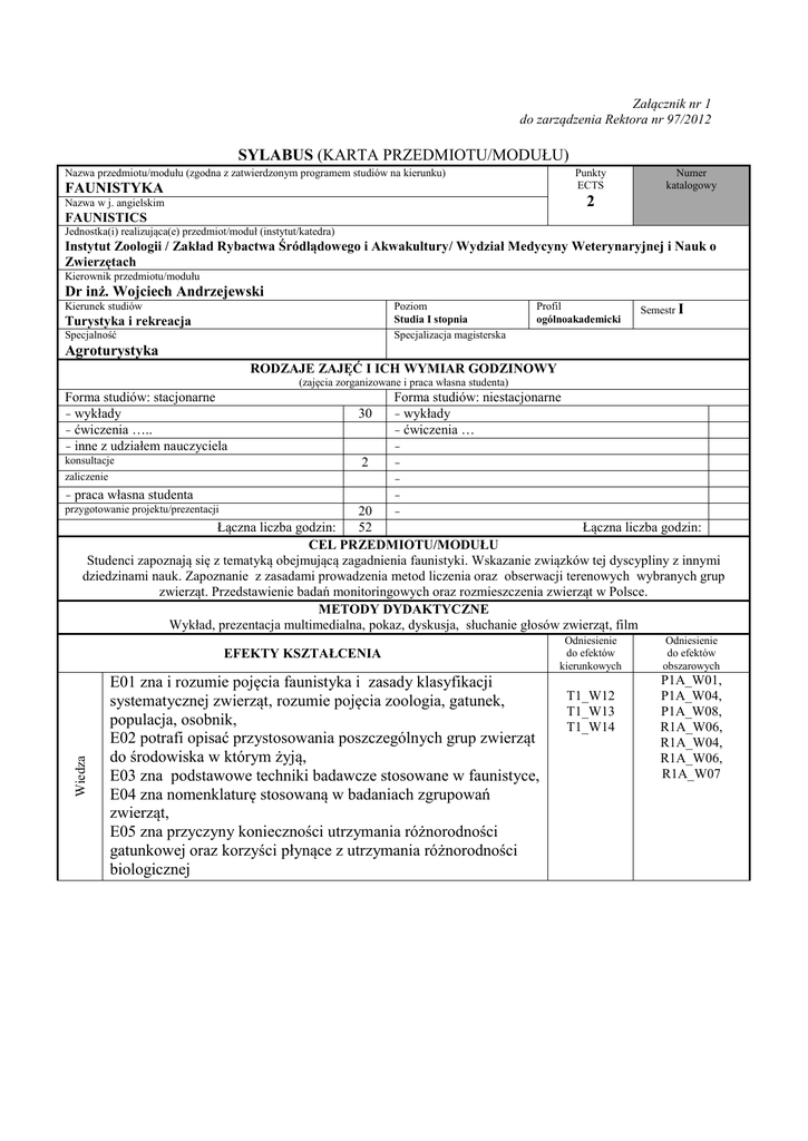 Załącznik nr 1 do zarządzenia Rektora nr 97/2012 SYLABUS (KARTA PRZEDMIOTU/MODUŁU) Nazwa przedmiotu/modułu (zgodna z zatwierdzonym programem studiów na kierunku) Punkty ECTS FAUNISTYKA Numer katalogowy 2 Nazwa w j. angielskim FAUNISTICS Jednostka(i) realizująca(e) przedmiot/moduł (instytut/katedra) Instytut Zoologii / Zakład Rybactwa Śródlądowego i Akwakultury/ Wydział Medycyny Weterynaryjnej i Nauk o Zwierzętach Kierownik przedmiotu/modułu Dr inż. Wojciech Andrzejewski Kierunek studiów Poziom Studia I stopnia Specjalizacja magisterska Turystyka i rekreacja Specjalność Profil ogólnoakademicki Semestr I Agroturystyka RODZAJE ZAJĘĆ I ICH WYMIAR GODZINOWY (zajęcia zorganizowane i praca własna studenta) Forma studiów: stacjonarne wykłady ćwiczenia ….. inne z udziałem nauczyciela konsultacje zaliczenie 30 2 praca własna studenta przygotowanie projektu/prezentacji Forma studiów: niestacjonarne wykłady ćwiczenia … 20 Łączna liczba godzin: 52 Łączna liczba godzin: CEL PRZEDMIOTU/MODUŁU Studenci zapoznają się z tematyką obejmującą zagadnienia faunistyki. Wskazanie związków tej dyscypliny z innymi dziedzinami nauk. Zapoznanie z zasadami prowadzenia metod liczenia oraz obserwacji terenowych wybranych grup zwierząt. Przedstawienie badań monitoringowych oraz rozmieszczenia zwierząt w Polsce. METODY DYDAKTYCZNE Wykład, prezentacja multimedialna, pokaz, dyskusja, słuchanie głosów zwierząt, film Wiedza EFEKTY KSZTAŁCENIA E01 zna i rozumie pojęcia faunistyka i zasady klasyfikacji systematycznej zwierząt, rozumie pojęcia zoologia, gatunek, populacja, osobnik, E02 potrafi opisać przystosowania poszczególnych grup zwierząt do środowiska w którym żyją, E03 zna podstawowe techniki badawcze stosowane w faunistyce, E04 zna nomenklaturę stosowaną w badaniach zgrupowań zwierząt, E05 zna przyczyny konieczności utrzymania różnorodności gatunkowej oraz korzyści płynące z utrzymania różnorodności biologicznej Odniesienie do efektów kierunkowych T1_W12 T1_W13 T1_W14 Odniesienie do efektów obszarowych P1A_W01, P1A_W04, P1A_W08, R1A_W06, R1A_W04, R1A_W06, R1A_W07 Umiejętności Kompetencje społeczne E06 potrafi oznaczać przynależność gatunkową, gromadzić i analizować dane o poszczególnych gatunkach zwierząt, E07 potrafi wykonać pomiary biometryczne zwierząt określa cechy charakterystyczne służące rozpoznawaniu wybranych gatunków, potrafi korzystać z kluczy w celu prawidłowego oznaczania gatunków E08 potrafi wykonać charakterystykę biologiczną populacji wybranych gatunków, E09 potrafi dokonać obserwacji i liczenia wybranych zwięrzat T1_U19 E10 potrafi współdziałać i pracować w grupie E11 rozumie potrzebę ciągłego uczenia się przez całe życie E12 wykazuje troskę o środowisko naturalne T1_K05 Metody weryfikacji efektów kształcenia Projekt semestralny P1A_U06, R1A_U05, R1A_U06, P1A_K01, P1A_K03, P1A_K04 P1A_K05, P1A_K07, R1A_K01, R1A_K04, R1A_K05 R1A_K07, S1A_K01, S1A_K04, S1A_K06, Numery efektów: E01,E02, E03, E04,E05,E06,E07 E08,E09,E10,E11,E12 TREŚCI KSZTAŁCENIA Wykłady: Definicje podstawowe: faunistyka, zoologia, systematyka, kategorie systematyczne. Historia i organizacja badań faunistycznych w Polsce. Omówienie nomenklatury stosowanej w badaniach zgrupowań zwierząt, parametry populacyjne. Omówienie podstawowych technik badawczych stosowanych w badaniach faunistycznych. Przedstawienie podstawowych metod określania liczebności populacji zwierząt z uwzględnieniem specyfiki poszczególnych grup systematycznych. Omówienie składu fauny charakterystycznej dla poszczególnych obszarów biogeograficznych, aktualny stan poznania bioróżnorodności rodzimej fauny i gatunków obcych. Metody inwentaryzacji wybranych gatunków mięczaków. Ogólne zasady wykrywania, obserwacji wybranych gatunków skorupiaków i owadów. Zasady obserwacji krajowych gatunków płazów i gadów (rozpoznawanie głosów). Monitoring faunistyczny: płazów i gadów, ryb, ptaków i ssaków. Prezentacja aparatury badawczej do prowadzenia monitoringu wód i ichtiofauny. Przedstawienie profesjonalnych metod obserwacji zwierząt uwzględniające normy prawne i etyczne. Zapoznanie z tropami i śladami wybranych zwierząt. Przedstawienie podstawowych zasad bezpieczeństwa pracy z poszczególnymi grupami zwierząt. Faunistyka jako dochodowa gałąź turystyki pozwalająca na zachowanie zasobów przyrodniczych oraz ich ochronę. Formy i kryteria zaliczenia przedmiotu/modułu Zaliczenie (projekt semestralny) Procentowy udział w końcowej ocenie 100% WYKAZ LITERATURY Literatura podstawowa : 1. Andrzejewski R., Weigel A. 2003. Różnorodność biologiczna Polski. Warszawa, NFOŚiGW. 2. Bogdanowicz W., Chudzicka E., Pilipiuk I. Skibińska E. (red.). 2004, 2007, 2009. Fauna Polski – Charakterystyka i wykaz gatunków. Tom I, II, III. Wyd. MiIZ PAN, Warszawa. 3. Głowaciński Z (red.). 2001. Polska czerwona księga zwierząt. Kręgowce. PWRiL, Warszawa. 4. Głowaciński Z. (red.). 2002. Czerwona lista zwierząt ginących i zagrożonych w Polsce. IOP PAN, Kraków., plus Suplement. 5. Głowaciński Z., H. Okarma, J. Pawłowski, W. Solarz (red.). 2011. Gatunki obce w faunie Polski. Wyd. IOP PAN w Krakowie. 6. 7. 8. 9. Heptel-Zawitkowska J.2011. Zoologia dla uczelni rolniczych. Wyd. PWN Warszawa. Klimaszewski K. 2013. Płazy i gady. Wyd. Mulitico. Warszawa. Ohnesorge G., Scheiba B., Uhlenhaut K., 2008. Ślady i tropy zwierząt. Wyd. Mulitico. Warszawa. Tomiałojć L., Stawarczyk T. 2003. Awifauna polski. Rozmieszczenie, liczebność i zmiany. Polskie Towarzystwo Przyjaciół Przyrody „Pro Natura”. Wrocław. 10. Wąsik S. 2011. Ssaki Polski od A do Ż. Multico. Warszawa. Literatura uzupełniająca : 1. Brylińska M. (red.). 2000. Ryby słodkowodne Polski. PWN, Warszawa. 2. Jakun M., Frugała-Selezniow,Woźniak M., Wiśniewska A.M., 2011.Ocena i ochrona bioróżnorodności wód. Wyd. UWM Olsztyn 3. Sikora A., Rohde Z., Gromadzki M.