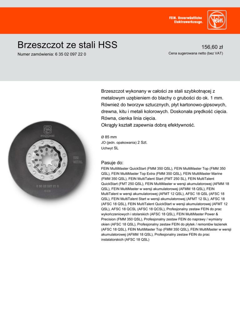 Brzeszczot ze stali HSS 156,60 zł Cena sugerowana netto (bez VAT) Numer zamówienia: 6 35 02 097 22 0 Brzeszczot wykonany w całości ze stali szybkotnącej z metalowym uzębieniem do blachy o grubości do ok. 1 mm. Również do tworzyw sztucznych, płyt kartonowo-gipsowych, drewna, kitu i metali kolorowych. Doskonała prędkość cięcia. Równa, cienka linia cięcia. Okrągły kształt zapewnia dobrą efektywność. Ø 85 mm JO (jedn. opakowania) 2 Szt. Uchwyt SL Pasuje do: FEIN MultiMaster QuickStart (FMM 350 QSL), FEIN MultiMaster Top (FMM 350 QSL), FEIN MultiMaster Top Extra (FMM 350 QSL), FEIN MultiMaster Marine (FMM 350 QSL), FEIN MultiTalent Start (FMT 250 SL), FEIN MultiTalent QuickStart (FMT 250 QSL), FEIN MultiMaster w wersji akumulatorowej (AFMM 18 QSL), FEIN MultiMaster w wersji akumulatorowej (AFMM 18 QSL), FEIN MultiTalent w wersji akumulatorowej (AFMT 12 QSL), AFSC 18 QSL (AFSC 18 QSL), FEIN MultiTalent Start w wersji akumulatorowej (AFMT 12 SL), AFSC 18 (AFSC 18 QSL), FEIN MultiTalent QuickStart w wersji akumulatorowej (AFMT 12 QSL), AFSC 18 QCSL (AFSC 18 QCSL), Profesjonalny zestaw FEIN do prac wykończeniowych i stolarskich (AFSC 18 QSL), FEIN MultiMaster Power & Precision (FMM 350 QSL), Profesjonalny zestaw FEIN do naprawy / wymiany okien (AFSC 18 QSL), Profesjonalny zestaw FEIN do płytek / remontów łazienek (AFSC 18 QSL), FEIN MultiMaster Top (FMM 350 QSL), FEIN MultiMaster w wersji akumulatorowej (AFMM 18 QSL), Profesjonalny zestaw FEIN do prac instalatorskich (AFSC 18 QSL)