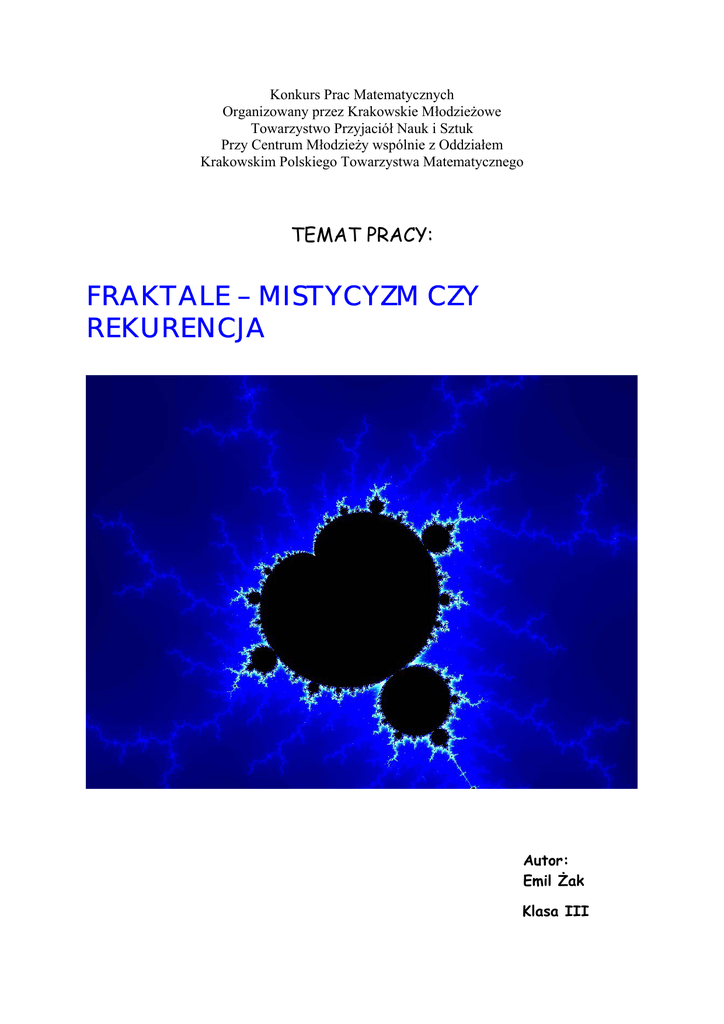 Konkurs Prac Matematycznych Organizowany przez Krakowskie Młodzieżowe Towarzystwo Przyjaciół Nauk i Sztuk Przy Centrum Młodzieży wspólnie z Oddziałem Krakowskim Polskiego Towarzystwa Matematycznego TEMAT PRACY: FRAKTALE – MISTYCYZM CZY REKURENCJA Autor: Emil Żak Klasa III Gimnazjum nr 1 w Skale SPIS TREŚCI I. Wstęp • Początek moich zainteresowań i definicja fraktala…… 2 Drzewko Pitagorasa • Definicja i powstawanie………………………………………………………… • Różne odmiany Drzewka Pitagorasa…………………………………… • Skala podobieństwa………………………………………………………………… • Zależności…………………………………………………………………………………… 6 8 9 12 III. Przykłady z literatury • Zbiór Cantora………………………………………………………………………… • Dywan Sierpińskiego……………………………………………………………… • Inne przykłady………………………………………………………………………… • Płatek Śniegu…………………………………………………………………………… • Trójkąt Sierpińskiego…………………………………………………………… • Piramida Sierpińskiego…………………………………………………………… 16 17 23 25 33 34 II. IV. Moje projekty • Trójkąty w trapezie……………………………………………………………… • „Oko krzyża”…………………………………………………………………………… • Gwiazda……………………………………………………………………………………… • Romb…………………………………………………………………………………………… • „Plaster miodu”………………………………………………………………………… 36 37 38 40 41 V. Fraktale a przyroda – odniesienie do przyrody……………………… 42 VI. Galeria fraktali………………………………………………………………………………… 50 VII. Literatura…………………………………………………………………………………………… 52 1 WSTĘP Nazwa „fraktal” jest nowa w języku matematyki, pochodzi od łacińskiego słowa fractus - 'złamany'. Figury będące fraktalami (bez ich nazywania) konstruowali dawno temu wybitni matematycy tacy jak: Peano, Hilbert, a zwłaszcza Sierpiński. Już Arystoteles wspominał o „figurach w figurach” czyli fraktalach, które do lat siedemdziesiątych XX wieku nie miały nazwy. Ta część geometrii zaczęła rozwijać się dopiero w poprzednim stuleciu. Najwybitniejszym znawcą fraktali i twórcą tego terminu jest matematyk i informatyk Benoit Mandelbrot, który w latach pięćdziesiątych, pracując dla amerykańskiej firmy komputerowej IBM dotarł do prac dwóch francuskich matematyków: Galstona Julli i Pierre’a Faton. Wykorzystując do badania ich prac komputery otrzymał zadziwiające wykresy, przerastające najśmielsze oczekiwania. Fantastyczne kształty niezależnie od powiększenia ukazywały coraz to nowe szczegóły. Były to fraktale – wprowadzone w latach siedemdziesiątych. Obecnie fraktale są powszechnie znane jako finezyjne wzory stojące na najwyższym poziomie artystycznym komputerów. Różnorodność kształtów i maleńkich elementów łatwo przyciąga wzrok przeciętnego człowieka. Jednak gdy popatrzymy na fraktal dłużej, wtedy zaczynamy dostrzegać coraz to nowe elementy, które wydają się ciągnąć w nieskończoność. Czy to jest możliwe? W jaki sposób powstają? To jest właśnie ich mistyczność, którą postaram się rozjaśnić. Moja przygoda z fraktalami zaczęła się w tym roku podczas przeglądania stron internetowych. Rozmaite kolory i kształty zafascynowały mnie tak bardzo, że postanowiłem napisać tę pracę. Zacznijmy od definicji fraktala: • Fraktale są figurami, w których część figury (fraktala) jest podobna do całości. • Fraktalem jest figura, która nie posiada całkowitego wymiaru. • Fraktal to zbiór o skomplikowanej budowie. Niezależnie od tego jak mały jego fragment będziemy oglądać - będzie on równie skomplikowany jak całość. • Wiele fraktali kryje w sobie zadziwiającą tajemnicę jaką jest ich 'nieskończone samopodobieństwo'. Oznacza to, że dowolnie mały jego kawałek, odpowiednio powiększony, przypomina do złudzenia cały zbiór lub jego znaczną część. • Jednocześnie fraktale mają prosty opis i często są otrzymywane przez powtarzanie nieskończenie wiele razy tej samej operacji, czyli są zapisane zależnością rekurencyjną. 2 Ciągle nie istnieje jeszcze ścisła definicja fraktala. Brakowało spójnej teorii opisującej wszystkie fraktale. Potrzebna ona była nie tylko matematykom, ale głównie naukom przyrodniczym i technicznym. W przyrodzie obiekty fraktalne występowały bardzo pospolicie: choćby liście, naczynia krwionośne, płuca, łańcuchy górskie, przekroje skał, chmury itp. Benoit Mandelbrot na Międzynarodowym Kongresie Matematyków w Warszawie w 1983 roku powiedział, że jest jeszcze za wcześnie na formułowanie ścisłej definicji fraktala, gdyż ciągle jeszcze nie rozumiemy dostatecznie głęboko istoty tego pojęcia. Lecz B. Mandelbrot, twierdził także, że fraktalem jest wszystko, natomiast figury typu prostokąt, koło, trójkąt są sztucznie wymyślone przez ludzi w celu uproszczenia opisu otaczającego nas świata. Twierdził on bowiem, że figury takie nie mają odpowiedników w rzeczywistości, gdyż są idealne pod względem kształtów, a jak wiemy materia składa się z atomów które nie mają idealnych kształtów, więc nic w przyrodzie nie jest idealne. Gdy popatrzymy na drzewa, chmury, linie górskich szczytó