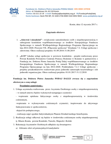 Fundacja im. Doktora Piotra Janaszka PODAJ DALEJ KRS 0000 197058 Adres: ul. Południowa 2A, 62-510 Konin Telefon: 63 211 22 19 e-mail: [email protected] FB/FundacjaPodajDalej Konto bankowe: Bank PKO BP, 55 1020 2746 0000 3102 0053 9650 www.podajdalej.org.pl Konin, dnia 12 stycznia 2017 r. Zapytanie ofertowe 1. „Aktywni i niezależni”– zwiększenie samodzielności osób z niepełnosprawnością w subregionie konińskim współfinansowanego ze środków Europejskiego Funduszu Społecznego w ramach Wielkopolskiego Regionalnego Programu Operacyjnego na lata 2014-2020. Priorytet VII „Włączenie społeczne” Działanie 7.2. Usługi społeczne i zdrowotne. Okres realizacji projektu: 01.09.2016-31.08.2019 2. „LUS” lokalne usługi społeczne w powiecie konińskim - projekt realizowany przez Powiat Koniński Powiatowe Centrum Pomocy Rodzinie w Koninie w partnerstwie z Fundacją im. Doktora Piotra Janaszka Podaj Dalej współfinansowanego ze środków Europejskiego Funduszu Społecznego w ramach Wielkopolskiego Regionalnego Programu Operacyjnego na lata 2014-2020. Poddziałania 7.2.1 Usługi społeczne – projekty pozakonkursowe realizowane przez jednostki samorządu terytorialnego i ich jednostki organizacyjne. Okres realizacji projektu: 01.01.2017-31.12.2018 . Fundacja im. Doktora Piotra Janaszka PODAJ DALEJ zwraca się z zapytaniem ofertowym o cenę usługi: Przedmiot zamówienia : 1. Usługa asystencka realizowana przez Asystenta Osobistego osoby z niepełnosprawnością – w ramach umowy będzie wykonywał następujące czynności: - wspieranie opiekuna faktycznego osoby z niepełnosprawnością w środowisku codziennym, -wspieranie w wykonywaniu codziennych czynności, inspirowanie do aktywnego funkcjonowania w społeczeństwie, -dojazd do podopiecznego, - realizacja zajęć zgodnie Indywidualnym Planem Działań każdego beneficjenta. 2. Realizacja usługi odbywać się będzie w środowisku codziennym osoby niepełnosprawnej tj. Miasto Konin, powiat Koniński, Turecki, Słupecki i Kolski 3. Rekrutacja Asystentów Osobistych odbędzie się dwuetapowo: a) Zebranie ofert od potencjalnych kandydatów b) Przeprowadzenie rozmów kwalifikacyjnych w celu zweryfikowania kompetencji pożądanych w pracy Asystenta Osobistego. 4. Zmawiający planuje zatrudnienie minimum 6 Asystentów osobistych. Wymiar pracy zostanie ustalony indywidualnie przy podpisywaniu umowy. Termin wykonania zamówienia: zgodnie z okresem realizacji projektu Wymagania w stosunku do Wykonawcy: • Minimum roczne doświadczenie w pracy z osobami z niepełnosprawnością (świadectwo pracy i/ lub referencje i/lub zaświadczenie o odbytym wolontariacie lub odbywanym wolontariacie i/lub nieformalnie, cv, list motywacyjny kandydata opisujący posiadane doświadczenie, referencje, polecenia) • Wykonawca realizuje zamówienie osobiście (osoba fizyczna lub osoba prowadząca jednoosobową działalność gospodarczą) • Oferent powinien przygotować ofertę na formularzu załączonym do niniejszego zapytania załącznik nr 1. oraz załączyć CV wraz listem motywacyjnym • Z możliwości realizowania zamówienia wykluczeni są Wykonawcy powiązani osobowo lub kapitałowo z Zamawiającym lub z osobami upoważnionymi do zaciągania zobowiązań w imieniu Zamawiającego czynności związane z przygotowaniem procedury wyboru Wykonawcy, w szczególności poprzez: - uczestnictwo w spółce jako wspólnik spółki cywilnej lub spółki osobowej - posiadanie udziałów lub co najmniej 10% akcji, - pełnienie funkcji członka organu nadzorczego lub zarządzającego, prokurenta, pełnomocnika, - pozostawanie w związku małżeńskim, w stosunku pokrewieństwa lub powinowactwa w linii prostej, bocznej drugiego stopnia lub w stosunku przysposobienia, opieki lub kurateli. Do oferty należy dołączyć Oświadczenie o braku powiązań osobowych i kapitałowych – Załącznik nr 2. Płatności: Płatności na rzecz Wykonawcy będą realizowane w odstępach miesięcznych po zrealizowaniu usługi dla kolejnych beneficjentów zgodnie z harmonogramem na podstawie wystawionego rachunku lub faktury po potwierdzeniu przez zamawiającego wykonania usługi. Kryteria wyboru wykonawcy Kryterium wyboru najkorzystniejszej oferty będzie cena rozumiana jako cena jednostkowa brutto za jedną godzinę fizyczną usługi oraz doświadczenie wykonawcy (60%/40%) 1. Cena - 60 pkt. Oferta z najniższą ceną otrzyma maksymalną liczbę punktów w ramach kryterium. Zastosowany wzór do obliczenia punktowego: Ocena oferty = ż x 60pkt Gdzie: Cena najniższa – najniższa wartość brutto spośród ofert nieodrzuconych Cena badana- wartość brutto oferty badanej 2. Doświadczenie w latach (max. 40 pkt.) do 1 roku – 10 pkt. od 1 roku do 3 lat – 20 pkt. powyżej 3 lat – 40 pkt. Zamawiający zastrzega sobie prawo do negocjacji cen. Miejsce oraz termin składania ofert: Oferta powinna być przesłana za pośrednictwem: poczty elektronicznej na adres [email protected], przesłana pocztą lub dostarczona osobiście na adres: Fundacja im. Doktora Piotra Janaszka PODAJ DALEJ, ul. Południowa 2 A, 62-510 Konin, do dnia 19.01.2017 do godz. 13.00 (liczy się data wpływu). Oferty złożone po terminie, lub na innym druku, niekompletne lub nie spełniające stawianych wymagań nie będą rozpatrywane. Oferent może przed upływem terminu składania ofert zmienić lub wycofać swoją ofertę. Informacje dotyczące wyboru najkorzystniejszej oferty: O wyborze najkorzystniejszej oferty Zamawiający zawiadomi tylko wybranego oferenta za pośrednictwem poczty elektronicznej i/lub telefonicznie. Dodatkowych informacji udziela: Karol Włodarczyk pod nr. telefonu 63 211 22 19. 1. Przedstawione zapytanie nie stanowi oferty w myśl art. 66 Kodeksu Cywilnego, jak również nie jest ogłoszeniem w rozumieniu ustawy Prawo zamówień publicznych. 2. Umowa z wykonawcą zostanie podpisana w przypadku dostępności środków i podpisanej umowy na wykonanie WRPO Załącznik nr 1 