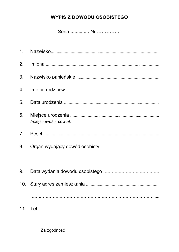 WYPIS Z DOWODU OSOBISTEGO Seria .............. Nr …………… 1. Nazwisko............................................................................................ 2. Imiona ................................................................................................. 3. Nazwisko panieńskie ....................................................................... 4. Imiona rodziców ............................................................................... 5. Data urodzenia ................................................................................. 6. Miejsce urodzenia ............................................................................ (miejscowość, powiat) 7. Pesel ................................................................................................... 8. Organ wydający dowód osobisty ……………………………….….. .…………………………………………………………………………........ 9. Data wydania dowodu osobistego …………………………….…… 10. Stały adres zamieszkania .............................................................. ……………………………………………………………………………...... 11. Tel ....................................................................................................... Za zgodność