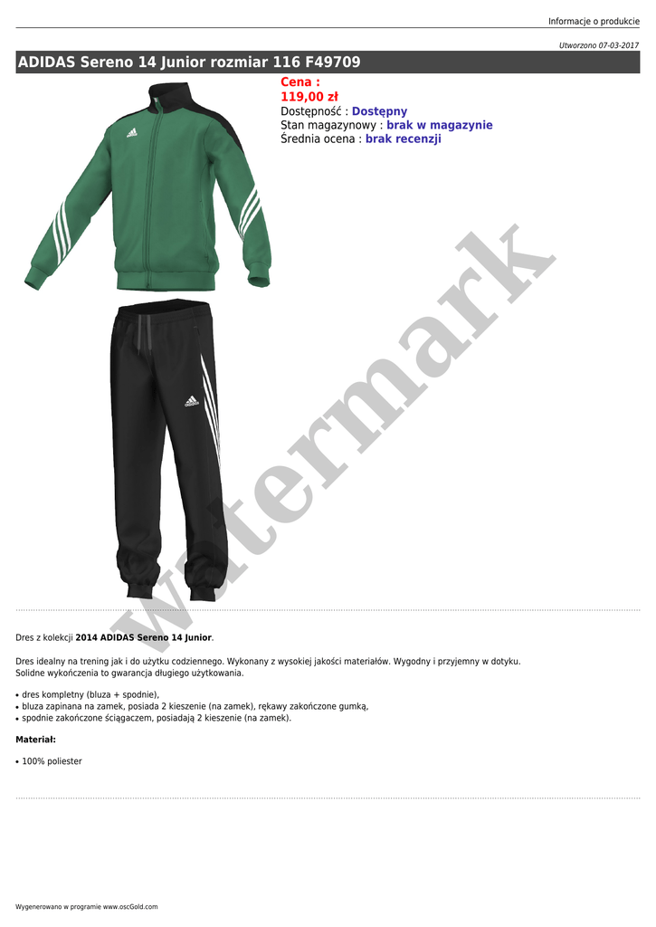 Informacje o produkcie Utworzono 07-03-2017 ADIDAS Sereno 14 Junior rozmiar 116 F49709 Cena : 119,00 zł w at er m ar k Dostępność : Dostępny Stan magazynowy : brak w magazynie Średnia ocena : brak recenzji Dres z kolekcji 2014 ADIDAS Sereno 14 Junior. Dres idealny na trening jak i do użytku codziennego. Wykonany z wysokiej jakości materiałów. Wygodny i przyjemny w dotyku. Solidne wykończenia to gwarancja długiego użytkowania. ● ● ● dres kompletny (bluza + spodnie), bluza zapinana na zamek, posiada 2 kieszenie (na zamek), rękawy zakończone gumką, spodnie zakończone ściągaczem, posiadają 2 kieszenie (na zamek). Materiał: ● 100% poliester Wygenerowano w programie www.oscGold.com