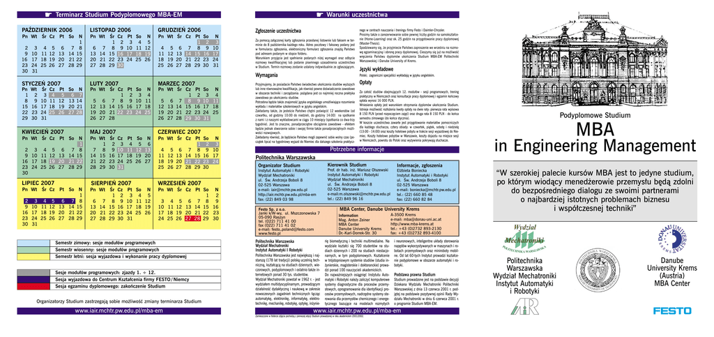 ☛ Terminarz Studium Podyplomowego MBA-EM PAèDZIERNIK 2006 Pn Wt Âr Cz Pt So 2 9 16 23 30 3 4 5 6 7 10 11 12 13 14 17 18 19 20 21 24 25 26 27 28 31 LISTOPAD 2006 N 1 8 15 22 29 Wt 2 9 16 23 30 Âr 3 10 17 24 31 Cz 4 11 18 25 Pt 5 12 19 26 So 6 13 20 27 6 7 13 14 20 21 27 28 Âr 1 8 15 22 29 Cz 2 9 16 23 30 Pt 3 10 17 24 GRUDZIE¡ 2006 So N 4 5 11 12 18 19 25 26 Pn Wt Âr Cz Pt 1 4 5 6 7 8 11 12 13 14 15 18 19 20 21 22 25 26 27 28 29 Zg∏oszenie uczestnictwa So 2 9 16 16 23 30 N 3 10 17 24 31 Za pomocà za∏àczonej karty zg∏oszenia przes∏anej listownie lub faksem w terminie do 8 paêdziernika ka˝dego roku. Adres pocztowy i faksowy podany jest w formularzu zg∏oszenia, elektroniczny formularz zg∏oszenia znajdà Paƒstwo pod adresem podanym w stopce folderu. Warunkiem przyj´cia jest spe∏nienie podanych ni˝ej wymagaƒ oraz odbycie rozmowy kwalifikacyjnej lub podanie pisemnego uzasadnienia uczestnictwa w Studium. Termin rozmowy zostanie ustalony indywidualnie ze zg∏aszajàcym. Wymagania STYCZE¡ 2007 Pn 1 8 15 22 29 Pn Wt ☛ Warunki uczestnictwa N 7 14 21 28 LUTY 2007 MARZEC 2007 Pn Wt Pn Wt Âr Cz 1 5 6 7 8 12 13 14 15 19 20 21 22 26 27 28 29 5 6 12 13 19 20 26 27 Âr Cz Pt So N 1 2 3 4 7 8 9 10 11 14 15 16 17 18 21 22 23 24 25 28 KWIECIE¡ 2007 MAJ 2007 Pn Wt Âr Cz Pt So N 1 2 3 4 5 6 7 8 9 10 11 12 13 14 15 16 17 18 19 20 21 22 23 24 25 26 27 28 29 30 Pn Wt 1 7 8 14 15 21 22 28 29 LIPIEC 2007 SIERPIE¡ 2007 Pn Wt Âr Cz Pt So N 1 2 3 4 5 6 7 8 9 10 11 12 13 14 15 16 17 18 19 20 21 22 23 24 25 26 27 28 29 30 31 Pn Wt Âr 1 6 7 8 13 14 15 20 21 22 27 28 29 Âr 2 9 16 23 30 Pt 2 9 16 23 30 So N 3 4 10 11 17 18 24 25 31 CZERWIEC 2007 Cz 3 10 17 24 31 Cz 2 9 16 23 30 Pt 4 11 18 25 Pt 3 10 17 24 31 So N 5 6 12 13 19 20 26 27 Pn Wt Âr Cz Pt 1 4 5 6 7 8 11 12 13 14 15 18 19 20 21 22 25 26 27 28 29 So N 2 3 9 10 16 17 23 24 30 WRZESIE¡ 2007 So N 4 5 11 12 18 19 25 26 Pn Wt Âr Cz Pt So N 1 2 3 4 5 6 7 8 9 10 11 12 13 14 15 16 17 18 19 20 21 22 23 24 25 26 27 28 29 30 Semestr zimowy: sesje modu∏ów programowych Semestr wiosenny: sesje modu∏ów programowych Semestr letni: sesja wyjazdowa i wykonanie pracy dyplomowej Sesje modu∏ów programowych: zjazdy 1. ÷ 12. Sesja wyjazdowa do Centrum Kszta∏cenia firmy FESTO / Niemcy Sesja egzaminu dyplomowego: zakoƒczenie Studium Organizatorzy Studium zastrzegajà sobie mo˝liwoÊç zmiany terminarza Studium www.iair.mchtr.pw.edu.pl/mba-em nego w centrach nauczania i treningu firmy Festo i Daimler-Chrysler. Prosimy tak˝e o zarezerwowanie sobie pewnej liczby godzin na samokszta∏cenie (Home-Learning) oraz ok. 25 godzin na przygotowanie pracy dyplomowej (Master-Thesis). Spodziewamy si´, ˝e przyjmiecie Paƒstwo zaproszenie we wrzeÊniu na rozmow´ egzaminacyjnà i obron´ pracy dyplomowej. Cieszymy si´ ju˝ na mo˝liwoÊç wr´czenia Paƒstwu dyplomów ukoƒczenia Studium MBA-EM Politechniki Warszawskiej i Danube University of Krems. J´zyki wyk∏adowe Polski; zagraniczni specjaliÊci wyk∏adajà w j´zyku angielskim. Przyjmujemy, ˝e posiadacie Paƒstwo Êwiadectwo ukoƒczenia studiów wy˝szych lub inne równowa˝ne kwalifikacje, jak równie˝ pewne doÊwiadczenie zawodowe w obszarze techniki i zarzàdzania: po˝àdana jest co najmniej roczna praktyka zawodowa po ukoƒczeniu studiów. Potrzebna b´dzie tak˝e znajomoÊç j´zyka angielskiego umo˝liwiajàca rozumienie wyk∏adu i materia∏ów szkoleniowych w j´zyku angielskim. Zak∏adamy tak˝e, ˝e jesteÊcie Paƒstwo ch´tni poÊwi´ciç 12 weekendów (od czwartku, od godziny 10:00 do niedzieli, do godziny 14:00) na spotkanie z nami i z naszymi wyk∏adowcami w ciàgu 10 miesi´cy (spotkania co dwa-trzy tygodnie). Jest to znaczne, ponadprzeci´tne obcià˝enie zawodowe - efektem b´dzie jednak stworzenie sobie i swojej firmie tak˝e ponadprzeci´tnych mo˝liwoÊci rozwojowych. Zak∏adamy równie˝, ˝e b´dziecie Paƒstwo mogli zapewniç sobie wolny czas (poczàtek lipca) na tygodniowy wyjazd do Niemiec dla dalszego szkolenia praktycz- Op∏aty Za ca∏oÊç studiów obejmujàcych 12. modu∏ów - sesji programowych, trening praktyczny w Niemczech oraz konsultacje pracy dyplomowej i egzamin koƒcowy op∏ata wynosi 16 000 PLN. Wniesienie op∏aty jest warunkiem otrzymania dyplomów ukoƒczenia Studium. Istnieje mo˝liwoÊç roz∏o˝enia kwoty op∏aty na dwie raty: pierwsza rata wpisowa 8 150 PLN (przed rozpocz´ciem zaj´ç) oraz druga rata 8 150 PLN - do koƒca semestru zimowego (do koƒca stycznia). W koszcie uczestnictwa zawarte jest przygotowanie materia∏ów pomocniczych dla ka˝dego s∏uchacza, cztery obiady: w czwartek, piàtek, sobot´ i niedziel´ (13:00 - 14:00) oraz koszty hotelowe pobytu w trakcie sesji wyjazdowej do Niemiec. Koszty hotelowe pobytów w Warszawie, koszty dojazdu na miejsce sesji w Niemczech, powrotu do Polski oraz wy˝ywienia pokrywajà s∏uchacze. Potrzebne informacje Podyplomowe Studium MBA in Engineering Management Politechnika Warszawska Organizator Studium Kierownik Studium Informacje, zg∏oszenia Instytut Automatyki i Robotyki Wydzia∏ Mechatroniki ul. Âw. Andrzeja Boboli 8 02-525 Warszawa e-mail: [email protected] http://iair.mchtr.pw.edu.pl/mba-em fax: (22) 849 03 98 Prof. dr hab. in˝. Mariusz Olszewski Instytut Automatyki i Robotyki Wydzia∏ Mechatroniki ul. Âw. Andrzeja Boboli 8 02-525 Warszawa e-mail:[email protected] tel.: (22) 849 96 16 El˝bieta Boniecka Instytut Automatyki i Robotyki ul. Âw. Andrzeja Boboli 8 02-525 Warszawa e-mail: [email protected] tel.: (22) 660 85 48 fax: (22) 660 82 84 Festo Sp. z o.o. Janki k/W-wy, ul. Mszczonowska 7 05-090 Raszyn tel. (022) 711 41 00 fax (022) 711 41 02 e-mail: [email protected] www.festo.pl Politechnika Warszawska Wydzia∏ Mechatroniki Instytut Automatyki I Robotyki Politechnika Warszawska jest najwi´kszà i najstarszà (178 lat tradycji) polskà uczelnià technicznà, kszta∏càcà na studiach dziennych, wieczorowych, podyplomowych i ostatnio tak˝e internetowych ponad 