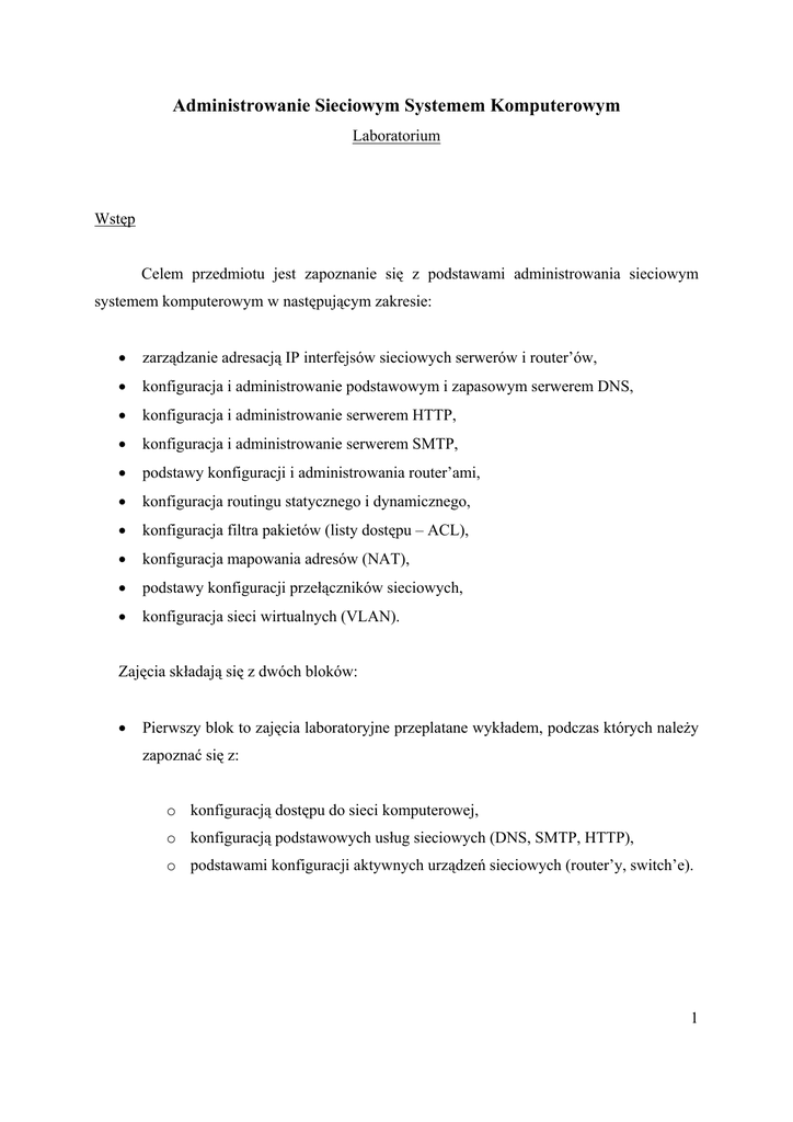 Administrowanie Sieciowym Systemem Komputerowym Laboratorium Wstęp Celem przedmiotu jest zapoznanie się z podstawami administrowania sieciowym systemem komputerowym w następującym zakresie: • zarządzanie adresacją IP interfejsów sieciowych serwerów i router’ów, • konfiguracja i administrowanie podstawowym i zapasowym serwerem DNS, • konfiguracja i administrowanie serwerem HTTP, • konfiguracja i administrowanie serwerem SMTP, • podstawy konfiguracji i administrowania router’ami, • konfiguracja routingu statycznego i dynamicznego, • konfiguracja filtra pakietów (listy dostępu – ACL), • konfiguracja mapowania adresów (NAT), • podstawy konfiguracji przełączników sieciowych, • konfiguracja sieci wirtualnych (VLAN). Zajęcia składają się z dwóch bloków: • Pierwszy blok to zajęcia laboratoryjne przeplatane wykładem, podczas których należy zapoznać się z: o konfiguracją dostępu do sieci komputerowej, o konfiguracją podstawowych usług sieciowych (DNS, SMTP, HTTP), o podstawami konfiguracji aktywnych urządzeń sieciowych (router’y, switch’e). 1 • Drugi blok to zajęcia w formie projektu, podczas których zadaniem jest zaprojektowanie i zbudowanie sieci rozległej korporacji składającej się z dwóch albo trzech firm/oddziałów w następującym zakresie: o podłączenie firmy/oddziału do Internetu, o wyodrębnienie w sieci strefy zdemilitaryzowanej (DMZ) oraz strefy chronionej „zaporą ogniową” (FW) z translacją adresów (NAT), o połączenie firm/oddziałów prywatną siecią korporacyjną, o konfiguracja i uruchomienie podstawowych usług sieciowych: ! DNS, ! HTTP, ! SMTP, o zaprojektowanie oraz implementacja polityki bezpieczeństwa w każdej firmie/oddziale. Niniejsza instrukcja jest dostępna w Internecie pod adresem: http://www.ee.pw.edu.pl/~grzegorz/ASSK 2 Zadania szczegółowe: Przed rozpoczęciem wykonywania ćwiczeń z użyciem SO UNIX należy zapoznać się z dokumentacją do systemu SUN Solaris 9. Dokumentacja dostępna jest na następujących stronach: http://docs.sun.com/app/docs/prod/solaris http://www.unixgeeks.org/files/Free-Solaris-Ebook.zip http://www.ee.pw.edu.pl/~grzegorz/UNIX/sasg_pl.pdf http://www.ee.pw.edu.pl/~grzegorz/UNIX/solsysadmin.pdf I. konfiguracja dostępu do sieci komputerowej w SO UNIX (SUN Solaris) Celem ćwiczenia jest zapoznanie się ze sposobem konfiguracji dostępu do sieci w SO UNIX. W ramach ćwiczenia należy skonfigurować system operacyjny tak, aby mógł swobodnie komunikować się z siecią lokalna i Internetem za pomocą zarówno adresów IP, jak i nazw. Ćwiczenie obejmuje następujące czynności do wykonania: • konfiguracja i diagnostyka interfejsów sieciowych, • konfiguracja i diagnostyka routingu, • konfiguracja i diagnostyka systemu nazw. Ćwiczenie należy wykonać zgodnie z instrukcją, zamieszczoną na stronie: http://www.ee.pw.edu.pl/~grzegorz/SK-LAB/sk.doc Uwaga: Instrukcję do ćwiczenia należy wydrukować! Podczas wykonywania ćwiczenia nie będzie dostępu do Internetu. Dodatkowe informacje można znaleźć w literaturze: http://www.unixgeeks.org/files/Free-Solaris-Ebook.zip (rozdz. 16) http://www.ee.pw.edu.pl/~grzegorz/UNIX/solsysadmin.pdf (rozdz. 8) 3 II. konfiguracja podstawowych usług sieciowych • DNS Dla wskazanej przez prowadzącego domeny należy skonfigurować i uruchomić główny oraz zapasowy serwer DNS. Przed wykonaniem ćwiczenia należy zapoznać się z następującą dokumentacją: http://docs.sun.com/app/docs/doc/806-4075 http://www.sun.com/bigadmin/features/articles/intro_dns.html http://www.adminschoice.com/docs/domain_name_service.htm http://www.boran.com/security/sp/bind9_20010430.html http://www.tldp.org/HOWTO/DNS-HOWTO.html http://everythingsolaris.org/articles/dfd/index.html http://www.unixgeeks.org/files/Free-Solaris-Ebook.zip (rozdz. 29) Sposób wykonania ćwiczenia: 1. Ćwiczenie wykonywane jest w parach. 2. Każda z osób konfiguruje podstawowy serwer DNS dla swojej domeny oraz serwer zapasowy dla domeny sąsiada. 2.1. Utworzenie pliku /etc/named.conf dla konfiguracji typu „forwarder” 2.2. Wskazanie w pliku /etc/resolv.conf lokalnego serwera DNS jako serwera domyślnego i sprawdzenie poprawności rozwiązywania nazw (ping, www, nslookup) 2.3. Uzupełnienie pliku /etc/named.conf o konfigurację serwera domeny podstawowej, utworzenie plków i sprawdzenie poprawności działania 2.4. Uzupełnienie pliku /etc/named.conf o konfigurację serwera zapasowego dla domeny sąsiada i sprawdzenie poprawności działania 3. Po sprawdzeniu poprawności działania serwera, należy dokonać nowych wpisów do bazy i sprawdzić widoczność oraz poprawność tych wpisów na innych hostach. 4 • HTTP Bazując na skonfigurowanym wcześniej serwerze DNS, należy skonfigurować i uruchomić serwer HTTP dla wskazanej domeny w konfiguracji podstawowej oraz w konfiguracji z serwerami wirtualnymi. Stosowna dokumentacja znajduje się na stronie: http://httpd.apache.org/docs/1.3/ Tematyka zajęć nie przewiduje rozbudowy funkcjonalności serwera HTTP, chyba że w wyniku sprawnego wykonywania ćwiczeń pojawi się wystarczająca rezerwa czasowa. Informacje dotyczące rozbudowy serwera HTTP można znaleźć na stronie: http://www.apache.org/ Minimalny zakres zadań do wykonania podczas ćwiczenia przewiduje uruchomienie podstawowego serwera HTTP oraz dwóch serwerów wirtualnych, tak aby każdy z tych serwerów dostępny był w Internecie pod własnym, jednoznacznym adresem. • SMTP Dla tej samej domeny należy skonfigurować i uruchomić serwer poczty elektronicznej. http://docs.sun.com/app/docs/doc/817-1717 5 III. konfiguracja aktywnych urządzeń sieciowych • inicjacja router’a, • konfiguracja i diagnostyka interfejsów sieciowych, • routing statyczny, • routing dynamiczny (RIPv.2), • listy dostepu (ACL), • mapowanie adresów sieciowych (NAT), • inicjacja switch’a • konfiguracja i diagnostyka interfejsów sieciowych, • sieci wi
