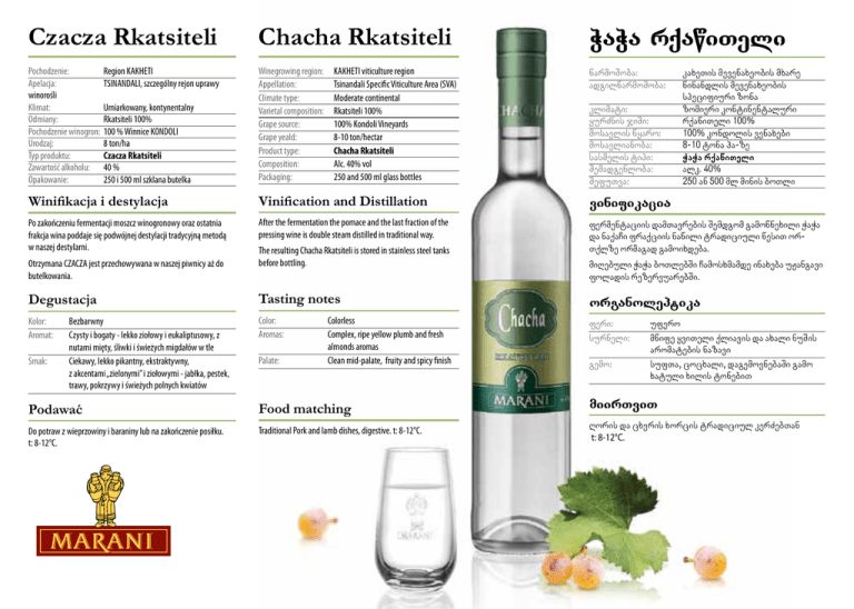 Czacza Rkatsiteli Chacha Rkatsiteli WaWa rqawiTeli Pochodzenie: Region KAKHETI Apelacja: TSINANDALI, szczególny rejon uprawy winorośli Klimat: Umiarkowany, kontynentalny Odmiany: Rkatsiteli 100% Pochodzenie winogron: 100 % Winnice KONDOLI Urodzaj: 8 ton/ha Typ produktu: Czacza Rkatsiteli Zawartość alkoholu: 40 % Opakowanie: 250 i 500 ml szklana butelka Winegrowing region: Appellation: Climate type: Varietal composition: Grape source: Grape yeald: Product type: Composition: Packaging: warmoSoba: adgilwarmoSoba: klimati: yurZnis jiSi: mosavlis wyaro: mosavlianoba: sasmelis tipi: Semadgenloba: SefuTva: Winifikacja i destylacja Vinification and Distillation Po zakończeniu fermentacji moszcz winogronowy oraz ostatnia frakcja wina poddaje się podwójnej destylacji tradycyjną metodą w naszej destylarni. After the fermentation the pomace and the last fraction of the pressing wine is double steam distilled in traditional way. Otrzymana CZACZA jest przechowywana w naszej piwnicy aż do butelkowania. KAKHETI viticulture region Tsinandali Specific Viticulture Area (SVA) Moderate continental Rkatsiteli 100% 100% Kondoli Vineyards 8-10 ton/hectar Chacha Rkatsiteli Alc. 40% vol 250 and 500 ml glass bottles The resulting Chacha Rkatsiteli is stored in stainless steel tanks before bottling. kaxeTis mevenaxeobis mxare winandlis mevenaxeobis specifiuri zona zomieri kontinentaluri rqawiTeli 100% 100% kondolis venaxebi 8-10 tona ha-ze WaWa rqawiTeli alk. 40% 250 an 500 ml minis boTli vinifikacia fermentaciis damTavrebis Semdgom gamownexili WaWa da naqaCi fraqciis nawili tradiciuli wesiT or Tqlze ormagad gamoixdeba. miRebuli WaWa boTlebSi Camosxmamde inaxeba uJangavi foladis rezervuarebSi. Degustacja Tasting notes Kolor:Bezbarwny Aromat: Czysty i bogaty - lekko ziołowy i eukaliptusowy, z nutami mięty, śliwki i świeżych migdałów w tle Smak: Ciekawy, lekko pikantny, ekstraktywny, z akcentami „zielonymi” i ziołowymi - jabłka, pestek, trawy, pokrzywy i świeżych polnych kwiatów Color:Colorless Aromas: Complex, ripe yellow plumb and fresh almonds aromas Palate: Clean mid-palate, fruity and spicy finish feri: surneli: gemo: Podawać Food matching miirTviT Do potraw z wieprzowiny i baraniny lub na zakończenie posiłku. t: 8-12°C. Traditional Pork and lamb dishes, digestive. t: 8-12°C. Roris da cxvris xorcis tradiciul kerZebTan t: 8-12°C. organoleptika ufero mwife yviTeli qliavis da axali nuSis aromatebis nazavi sufTa, cocxali, dagemovnebaSi gamo xatuli xilis tonebiT