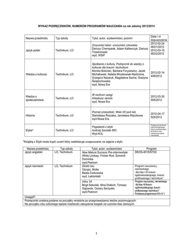 WYKAZ PODRĘCZNIKÓW, NUMERÓW PROGRAMÓW NAUCZANIA na rok szkolny 2013/2014 Nazwa przedmiotu Typ szkoły Język polski Technikum, LO Data i nr dopuszczenia 2012-02-24 Zrozumieć tekst –zrozumieć człowieka 463/1/2012 Dariusz Chemparek, Adam Kalbarczyk, Dariusz 2012-03-15 Trześniowski 463/2/2012 wyd. WSiP Tytuł, autor, wydawnictwo, poziom Wiedza o kulturze Technikum. LO Spotkania z kulturą. Podręcznik do wiedzy o kulturze dla liceum i technikum Monika Bokiniec, Barbara Forysiewicz, Jacek 2012-02-14 Michałowski, Natalia Mrozkowiak-Nastrożna, 449/2012 Grzegorz Nazaruk, Magdalena Sacha, Grażyna Świętochowska wyd. Nowa Era Wiedza o społeczeństwie Technikum, LO W centrum uwagi Arkadiusz Janicki wyd. Nowa Era 2012-03-30 505/2012 Historia Technikum, LO Poznać przeszłość. Wiek XX pod red. Stanisława Roszaka, Jarosława Kłaczkowa wyd.Nowa Era 2012-04-17 525/2012 Technikum, LO Pogadanki z etyki Andrzej Szostek MIC Wyd.KUL Podręcznik dla liceum ogólnokształcącego, liceum profilowanego i technikum oraz zasadniczej szkoły zawodowej Etyka* *Książkę z Etyki może kupić uczeń który zadeklaruje uczęszczanie na zajęcia z etyki. Nazwa przedmiotu Język angielski Typ szkoły LO, Technikum Język niemiecki LO, Technikum Tytuł, autor, wydawnictwo New Matura Success Pre-intermediate White Lindsay, Fricker Rod, Szmerdt Dominika wyd.Pearson Direkt neu Giorgio, Motta Beata Ćwikowska wyd. Lektorklett Infos 1A Birgit Sekulski, Nina Drabich, Tomasz Gajownik, Cezary Serzysko wyd.Pearson Program DKOS-4015/57/02 Program nauczania j. niemieckiego dla klas I-III liceum ogólnokształcącego, liceum profilowanego i technikum” Program nauczania j. niemieckiego dla klas I-III liceum ogólnokształcącego, liceum profilowanego i technikum” Podstawa programowa IV0 i IV 1 Uwaga!!! Podręczniki zostaną podane na początku września po przeprowadzeniu testów poziomujących. Na początku roku szkolnego będzie możliwość zakupienia książek od uczniów klas starszych. 1 Nazwa przedmiotu Typ szkoły Tytuł, autor, wydawnictwo, poziom Geografia wszystkie ponadgimnazjalne Chemia wszystkie ponadgimnazjalne Biologia wszystkie ponadgimnazjalne Fizyka wszystkie ponadgimnazjalne Matematyka liceum i technikum Edukacja dla bezpieczeństwa podręcznik dla szkół ponadgimnazjalnych „Oblicza geografi” R.Uliszak, K.Wiederman Nowa Era Poziom podstawowy „To jest chemia” R.Hassa,A.Mrzigod, J.Mrzigod Nowa Era Poziom podstawowy „Biologia na casie” E.Bonar, W.Krzeszowiec-Jeleń, S.Czachorowski Nowa Era Poziom podstawowy "Świat fizyki. Podręcznik dla szkół ponadgimnazjalnych. Zakres podstawowy" Zamkor Poziom podstawowy MATEMATYKA. Zakres podstawowy i rozszerzony Nowa Era Typ szkoły Systemy operacyjne Urządzenia techniki komputerowej Diagnostyka i naprawa urządzeń techniki komputerowej Technikum Technik informatyk klasy 1-2 Typ szkoły Systemy operacyjne i sieci Technik informatyk komputerowe klasa 1, klasa 2 14.02.2012 MEN 450/2012 08.12.2012 MEN 394/2012 360/1/2011 24.08.2011 426/2012 Informatyka dla szkół ponadgimnazjalnych – zakres podstawowy, Grażyna Koba, MIGRA Nazwa przedmiotu Nazwa przedmiotu 03.02.2012 MEN 438/2012 Krok przedsiębiorczości Zbigniew Makieła, Tomasz Rachwał Nowa Era Poziom podstawowy technikum Data i nr dopuszczenia 31.01.2012 MEN433/2012 Żyje i działam bezpiecznie Poziom podstawowy Jarosław Słoma Nowa Era podręcznik dla szkół Podstawy ponadgimnazjalnych przedsiębiorczości Informatyka Nr programu 29.02.2012 467/2012 Symbole cyfrowe zawodów: 311408 311204 351203 351103 311930 536/2012 Tytuł Kwalifikacja E-12 Montaż i eksploatacja komputerów osobistych oraz urządzeń peryferyjnych. Tomasz Kowalski wyd. Helion Nr programu Symbole cyfrowe zawodów: 351203 Data i nr dopuszczenia Tytuł, autor, wydawnictwo, poziom Nr programu Systemy operacyjne i sieci komputerowe. Część 1, 2 Krzysztof Pytel Sylwia Osetek, WSiP 312[01]/T,SP/MENiS/2004.06.14 2010 2 Nazwa przedmiot Typ szkoły Rysunek techniczny Technologia robót murarskich i tynkarskich Tytuł podręcznika Autor Wydawnictwo „Rysunek techniczny budowlany” „Murarstwo i tynkarstwo. Materiały.” „Murarstwo i tynkarstwo. Roboty murarskie.” Tadeusz Maj Edward Szymański Włodzimierz Martinek, Nabi Ibadov Włodzimierz Martinek, Nabi Ibadov Włodzimierz Martinek, Nabi Ibadov Tadeusz Maj WSiP WSiP „Murarstwo i tynkarstwo. Roboty tynkarskie.” Organizacja robót budowlanych Technikum – technik budownictwa „Murarstwo i tynkarstwo. Odbiory, naprawy i rozliczenia.” „Organizacja i przygotowanie budowy.” „Organizacja i technologia robót stanu surowego.” „Organizacja i technologia robót wykończeniowych.” „Utrzymanie obiektów budowlanych.” „Organizacja robót rozbiórkowych.” Nr programu Symbole cyfrowe zawodów: 311204 WSiP Tadeusz Maj Tadeusz Maj Tadeusz Maj Tadeusz Maj Podręczniki z przedmiotów zawodowych dla klas pierwszych w związku z wprowadzaniem nowej podstawy programowej zostaną podane na początku roku szkolnego. Zatwierdzono przez Radę Pedagogiczną dnia 13.06.2013r. 3