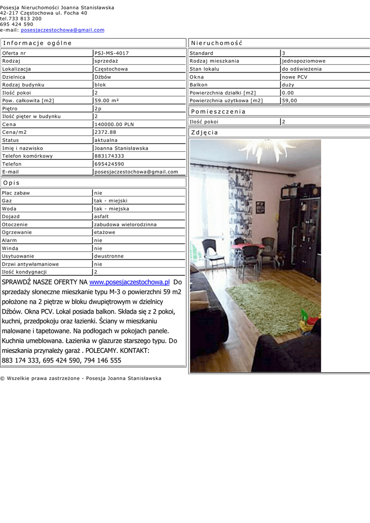 Posesja Nieruchomości Joanna Stanisławska 42-217 Częstochowa ul. Focha 40 tel.733 813 200 695 424 590 e-mail: [email protected] Informacje ogólne Nieruchomość Oferta nr PSJ-MS-4017 Standard 3 Rodzaj sprzedaż Rodzaj mieszkania jednopoziomowe Lokalizacja Częstochowa Stan lokalu do odświeżenia Dzielnica Dźbów Okna nowe PCV Rodzaj budynku blok Balkon duży Ilość pokoi 2 Powierzchnia działki [m2] 0.00 Pow. całkowita [m2] 59.00 m² Powierzchnia użytkowa [m2] 59,00 Piętro 2p Ilość pięter w budynku 2 Cena 140000.00 PLN Cena/m2 2372.88 Status aktualna Imię i nazwisko Joanna Stanisławska Telefon komórkowy 883174333 Telefon 695424590 E-mail [email protected] Opis Plac zabaw nie Gaz tak - miejski Woda tak - miejska Dojazd asfalt Otoczenie zabudowa wielorodzinna Ogrzewanie etażowe Alarm nie Winda nie Usytuowanie dwustronne Drzwi antywłamaniowe nie Ilość kondygnacji 2 SPRAWDŹ NASZE OFERTY NA www.posesjaczestochowa.pl Do sprzedaży słoneczne mieszkanie typu M-3 o powierzchni 59 m2 położone na 2 piętrze w bloku dwupiętrowym w dzielnicy Dźbów. Okna PCV. Lokal posiada balkon. Składa się z 2 pokoi, kuchni, przedpokoju oraz łazienki. Ściany w mieszkaniu malowane i tapetowane. Na podłogach w pokojach panele. Kuchnia umeblowana. Łazienka w glazurze starszego typu. Do mieszkania przynależy garaż . POLECAMY. KONTAKT: 883 174 333, 695 424 590, 794 146 555 © Wszelkie prawa zastrzeżone - Posesja Joanna Stanisławska Pomieszczenia Ilość pokoi Zdjęcia 2
