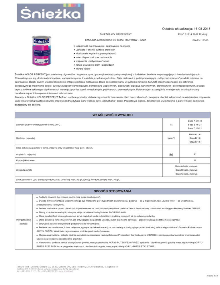 Ostatnia aktualizacja: 13-08-2013 ŚNIEŻKA KOLOR PERFEKT PN-C 81914:2002 Rodzaj I EMULSJA LATEKSOWA DO ŚCIAN I SUFITÓW – BAZA PN-EN 13300 odporność na zmywanie i szorowanie na mokro Zawiera Teflon® surface protector ŚNIEŻKA PERFEKT LATEKSOWA (ETYKIETA UNIWERSALNA) BAZA doskonałe krycie i superwydajność nie chlapie podczas malowania zapewnia „oddychanie” ścian łatwe usuwanie plam i zabrudzeń trwałe kolory Śnieżka KOLOR PERFEKT jest zawiesiną pigmentów i wypełniaczy w dyspersji wodnej żywicy akrylowej z dodatkiem środków wspomagających i uszlachetniających. Charakteryzuje się: doskonałym kryciem, wydajnością oraz trwałością uzyskanego koloru. Daje matowe i w pełni pozwalające „oddychać ścianom” powłoki odporne na szorowanie. Dzięki swoim właściwościom nie chlapie podczas malowania. Baza po skolorowaniu w systemie Śnieżka KOLOR przeznaczona jest do ochronno dekoracyjnego malowania ścian i sufitów z zapraw cementowych, cementowowapiennych, gipsowych, gipsowokartonowych, drewnianych i drewnopochodnych, a także tapet z włókna szklanego użytkowanych wewnątrz pomieszczeń mieszkalnych, publicznych, przemysłowych. Polecana jest szczególnie w miejscach, w których ściany narażone są na intensywne ścieranie i zabrudzenia. Zawarty w Śnieżka KOLOR PERFEKT Teflon surface protector ułatwia czyszczenie i usuwanie plam oraz zabrudzeń, zwiększa również odporność na wielokrotne zmywanie. Zapewnia wysoką trwałość powłoki oraz swobodną dyfuzję pary wodnej, czyli „oddychanie” ścian. Pozostawia piękne, dekoracyjne wykończenie a przy tym jest całkowicie bezpieczny dla zdrowia. WŁAŚCIWOŚCI WYROBU Baza A 30-40 Lepkość (kubek cylindryczny Ø 6 mm), 20°C [s] Baza B 15-21 Baza C 15-21 Baza A 1,6 Gęstość, najwyżej [g/cm³] Baza B 1,6 Baza C 1,6 Czas schnięcia powłoki w temp. 20±2°C przy wilgotności wzg. pow. 55±5% 2 [h] stopień 3, najwyżej Krycie jakościowe II Baza A biała, matowa Wygląd powłoki Baza B biała, matowa Baza C biała, matowa Limit zawartości LZO dla tego produktu: kat. (A/a/FW), max. 30 g/L (2010). Produkt zawiera max. 30 g/L. SPOSÓB STOSOWANIA Podłoże powinno być mocne, suche, bez kurzu i zatłuszczeń. Świeże tynki cementowowapienne mogą być malowane po 4 tygodniach sezonowania, gipsowe – po 2 tygodniach, tzw. „suche tynki” – po wyschnięciu, przeszlifowaniu i odpyleniu. Trwałe, malowane po raz pierwszy lub pomalowane na bardzo intensywny kolor podłoża zaleca się wcześniej pomalować emulsją podkładową Śnieżka GRUNT. Plamy z zacieków wodnych, nikotyny, oleju zamalować farbą Śnieżka ZACIEKIPLAMY. Stare powłoki farb klejowych usunąć, zmyć i spłukać wodą z dodatkiem środków myjących aż do odsłonięcia tynku. Przygotowanie podłoża Stare powłoki z farb emulsyjnych, źle przylegające do podłoża usunąć, a jeśli się mocno trzymają – przemyć wodą z dodatkiem detergentów. Zmywane powłoki starych farb pozostawić do wyschnięcia. Podłoża mocno chłonne, luźno związane, sypiące się i skredowane (tzn. zostawiające ślady pyłu po potarciu dłonią) zaleca się pomalować Gruntem Polimerowym ACRYL PUTZ®. Właściwie zagruntowane podłoże powinno być matowe. Miejsca zagrzybione, pokryte pleśnią, oczyścić mechanicznie i zdezynfekować Preparatem Grzybobójczym VIDARON, pamiętając równocześnie o konieczności usunięcia przyczyny powstawania grzybów. Nierówności podłoża zaleca się wyrównać gotową masą szpachlową ACRYLPUTZ® FS20 FINISZ, spękania i ubytki uzupełnić gotową masą szpachlową ACRYL PUTZ® FX23 FLEX lub w przypadku większych nierówności – sypką masą szpachlową ACRYLPUTZ® ST10 START. Strona 1 z 3 Baza nie jest wyrobem gotowym do użycia, wymaga uprzedniego zabarwienia w systemie kolorowania. Farbę przed malowaniem dokładnie wymieszać. Przed dozowaniem pigmentu opakowanie odwrócić deklem do dołu – zapewni to równomierne wymieszanie produktu. Do farby nie dodawać wapna, kredy, bieli tytanowej, ani nie mieszać z innymi farbami. Farby z różnych partii produkcyjnych wymieszać razem przed ich użyciem. Przygotowanie ŚNIEŻKA PERFEKT LATEKSOWA (ETYKIETA UNIWERSALNA) BAZA Przed przystąpieniem do malowania należy sprawdzić na małym fragmencie zgodność koloru. wyrobu Przed przystąpieniem do malowania większej płaszczyzny przygotować wystarczającą ilość farby – w celu zapewnienia jednolitego efektu kolorystycznego, zaleca się farby z różnych partii produkcyjnych lub różnych wielkości opakowań wymieszać razem. Do pierwszego malowania świeżych niegruntowanych podłoży zaleca się rozcieńczyć farbę, w zależności od chłonności podłoża dodając do 20% wody. Na zagruntowane podłoże nakładać farbę nierozcieńczoną. Do malowania tapet z włókna szklanego(w zależności od ich struktury) dopuszczalne jest 10procentowe rozcieńczenie produktu. Malować wewnątrz pomieszczeń w temperaturze otoczenia i podłoża od +10°C do +30°C. Nakładać pędzlem, wałkiem lub natryskiem dwie warstwy farby – warstwę drugą po wyschnięciu poprzedniej tj. po około 24 h. Malowanie Narzędzia po zakończeniu prac malarskich umyć w wodzie. Pełne właściwości wytrzymałościowe powłoka uzyskuje po 28 dniach. W czasie prac malarskich i po ich zakończeniu pomieszczenie wietrzyć do zaniku zapachu. UWAGI Przechowywać i magazynować w szczelnie zamkniętych pojemnikach. PARAMETRY MALOWANIA DLA POSZCZEGÓLNYCH METOD PARAMETRY MALOWANIA METODY lepkość farby dodatek rozcieńczalnika średnica dyszy pistoletu ciśnienie natrysku [s] [%] [mm] [MPa] postać handlowa - - - 2 postać handlowa - 0,43÷0,66 20÷21 1-2 zalecana ilość warstw MALOWANIA Pędzel, wałek Natrysk hydrodynamiczny* * natrysk wykonany na urządzeniach firmy Graco, model 395 ST PRO OKRES PRZYDATNOŚCI: 48 miesięcy od daty produkcji TEMPERATURA PRZECHOWYWANIA: od +5ºC do +30ºC puszki metalowe: OPAKOWA