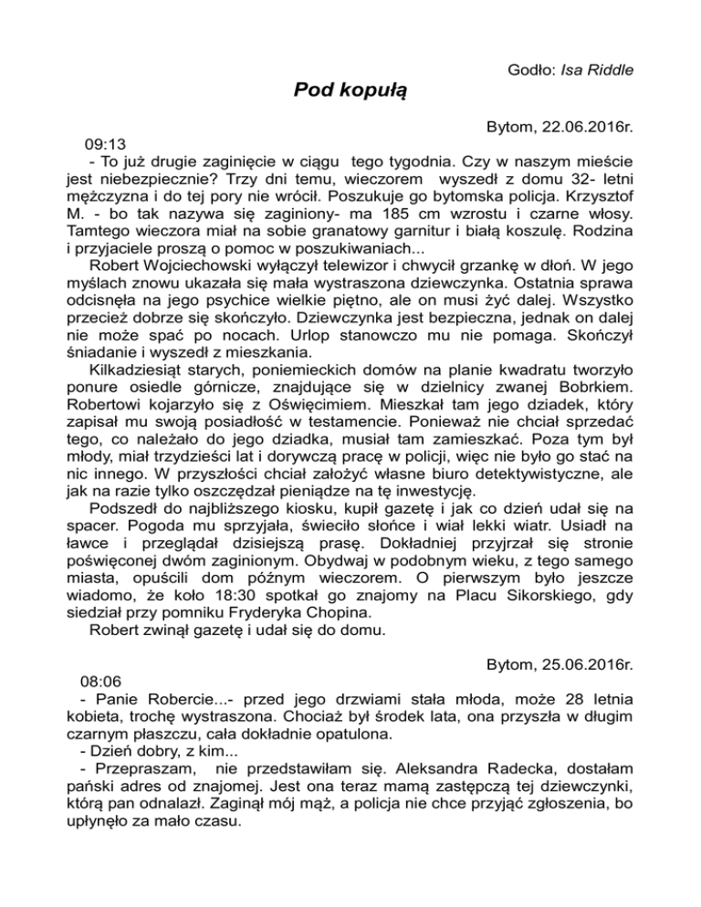 Godło: Isa Riddle Pod kopułą Bytom, 22.06.2016r. 09:13 - To już drugie zaginięcie w ciągu tego tygodnia. Czy w naszym mieście jest niebezpiecznie? Trzy dni temu, wieczorem wyszedł z domu 32- letni mężczyzna i do tej pory nie wrócił. Poszukuje go bytomska policja. Krzysztof M. - bo tak nazywa się zaginiony- ma 185 cm wzrostu i czarne włosy. Tamtego wieczora miał na sobie granatowy garnitur i białą koszulę. Rodzina i przyjaciele proszą o pomoc w poszukiwaniach... Robert Wojciechowski wyłączył telewizor i chwycił grzankę w dłoń. W jego myślach znowu ukazała się mała wystraszona dziewczynka. Ostatnia sprawa odcisnęła na jego psychice wielkie piętno, ale on musi żyć dalej. Wszystko przecież dobrze się skończyło. Dziewczynka jest bezpieczna, jednak on dalej nie może spać po nocach. Urlop stanowczo mu nie pomaga. Skończył śniadanie i wyszedł z mieszkania. Kilkadziesiąt starych, poniemieckich domów na planie kwadratu tworzyło ponure osiedle górnicze, znajdujące się w dzielnicy zwanej Bobrkiem. Robertowi kojarzyło się z Oświęcimiem. Mieszkał tam jego dziadek, który zapisał mu swoją posiadłość w testamencie. Ponieważ nie chciał sprzedać tego, co należało do jego dziadka, musiał tam zamieszkać. Poza tym był młody, miał trzydzieści lat i dorywczą pracę w policji, więc nie było go stać na nic innego. W przyszłości chciał założyć własne biuro detektywistyczne, ale jak na razie tylko oszczędzał pieniądze na tę inwestycję. Podszedł do najbliższego kiosku, kupił gazetę i jak co dzień udał się na spacer. Pogoda mu sprzyjała, świeciło słońce i wiał lekki wiatr. Usiadł na ławce i przeglądał dzisiejszą prasę. Dokładniej przyjrzał się stronie poświęconej dwóm zaginionym. Obydwaj w podobnym wieku, z tego samego miasta, opuścili dom późnym wieczorem. O pierwszym było jeszcze wiadomo, że koło 18:30 spotkał go znajomy na Placu Sikorskiego, gdy siedział przy pomniku Fryderyka Chopina. Robert zwinął gazetę i udał się do domu. Bytom, 25.06.2016r. 08:06 - Panie Robercie...- przed jego drzwiami stała młoda, może 28 letnia kobieta, trochę wystraszona. Chociaż był środek lata, ona przyszła w długim czarnym płaszczu, cała dokładnie opatulona. - Dzień dobry, z kim... - Przepraszam, nie przedstawiłam się. Aleksandra Radecka, dostałam pański adres od znajomej. Jest ona teraz mamą zastępczą tej dziewczynki, którą pan odnalazł. Zaginął mój mąż, a policja nie chce przyjąć zgłoszenia, bo upłynęło za mało czasu. - Proszę wejść- przepuścił kobietę w drzwiach- herbaty? - Nie, dziękuję. Proszę mi pomóc- powiedziała błagalnym głosem. Posadził ją w fotelu, a sam usiadł na kanapie. Wyciągnął kartkę i zaczął pisać. - Kiedy go pani widziała ostatnio? - Wczoraj trochę się pokłóciliśmy, nawet bardzo. To było koło 18- tej, kiedy wyszedł i trzasnął drzwiami. - Proszę pani mamy 8 rano. Minęło 14 godzin. Może się upił i gdzieś zasnął, albo poszedł gdzieś do znajomych czy rodziny. - Wszystkich obdzwoniłam, nigdzie go nie ma. On taki nie jest- kobieta wyraźnie się obruszyła. - Jest pani młoda, niedługo jesteście małżeństwem. Skąd to pani może wiedzieć? - On jest porządnym człowiekiem. Dba o swój wizerunek. Musiało stać się coś złego, że nie wrócił. - Już dobrze. Ile ma lat? Jak wygląda? Jakieś inne dane? Jego numer telefonu? - Bartłomiej Radecki, 34 lata. Tu jest jego zdjęcie i wizytówka- kobieta podała mu teczkę. Robert dokładnie przyjrzał się zdjęciu. Kojarzył skądś tę twarz. Wizytówka potwierdziła jego przypuszczenia. To był mecenas. Już kiedyś widział tego człowieka na rozprawie w sądzie. Jego klient wtedy przegrał i trafił do więzienia na kilka lat. Może chciał się zemścić? - W co był ubrany, gdy wyszedł z domu? - Przyszedł z pracy i nawet się nie przebrał. To był garnitur, ale nie wiem jaki. - Miał jakieś ulubione miejsce albo... - Tak, uwielbia chodzić do opery. Mówi, że to go uspokaja, ale tam by chyba nie poszedł. - Nigdy nic nie wiadomo. Spróbuję się czegoś dowiedzieć, ale nic nie obiecuję- kobieta wyciągnęła kopertę w jego stronę- Nie trzeba- dodał. 13:28 Robert przekroczył próg Komendy Miejskiej Policji w Bytomiu. Bez zastanowienia podążył do gabinetu komendanta. Zapukał do drzwi i nie czekając na zaproszenie, wtargnął do środka. - Chcę przejąć sprawę tajemniczych zaginień…- zaczął, łapiąc oddech. - Robert – powiedział zdziwiony jego wizytą komendant- przecież jesteś na urlopie. Martwiliśmy się o twoje zdrowie. Nie możesz wziąć tej sprawy. - Myślę, że przez poprowadzenie nowej sprawy, łatwiej zapomnę o poprzedniej. Poza tym, nie widzisz, że sobie nie radzicie? Trzy osoby zaginęły w ciągu dwóch tygodni… - Dwie osoby…- poprawił go komendant - Trzy. Dziś rano przyszła do mnie żona Bartłomieja Radeckiego, tego adwokata z urzędu. Pomyśl sobie, że wczoraj wyszedł z domu około 18- tej i do teraz nie wrócił. Minęło jednak tylko 14 godzin, więc nie chcieliście przyjąć tego zgłoszenia. - To, że wszystkie osoby giną w podobnych okolicznościach nic nie znaczy. Może to tylko przypadek… - Zatem chcę przyjrzeć się bliżej tym przypadkom. Udostępnij mi kartoteki dwóch pozostałych zaginionych. - Robercie, tymi przypadkami, dla twojej wiadomości, zajmuje się kto inny. Gdy uznam za słuszne przydzielić ci jakąś sprawę, na pewno to zrobię. Jak na razie odmawiam- komendant starał się mówić to wszystko spokojnie. Zależało mu na współpracy tak zdolnego detektywa, lecz nie mógł pozwolić, by jego koledzy pracowali w stresie. Robert zrozumiał, że nic tu nie załatwi. Wyszedł z gabinetu z oschłym „Do widzenia” i spróbował działać inaczej. Jak gdyby nigdy nic, udał się do sekretariatu. Przy biurku siedziała miła i młoda policjantka. Ostatnio detektyw mało czasu spęd