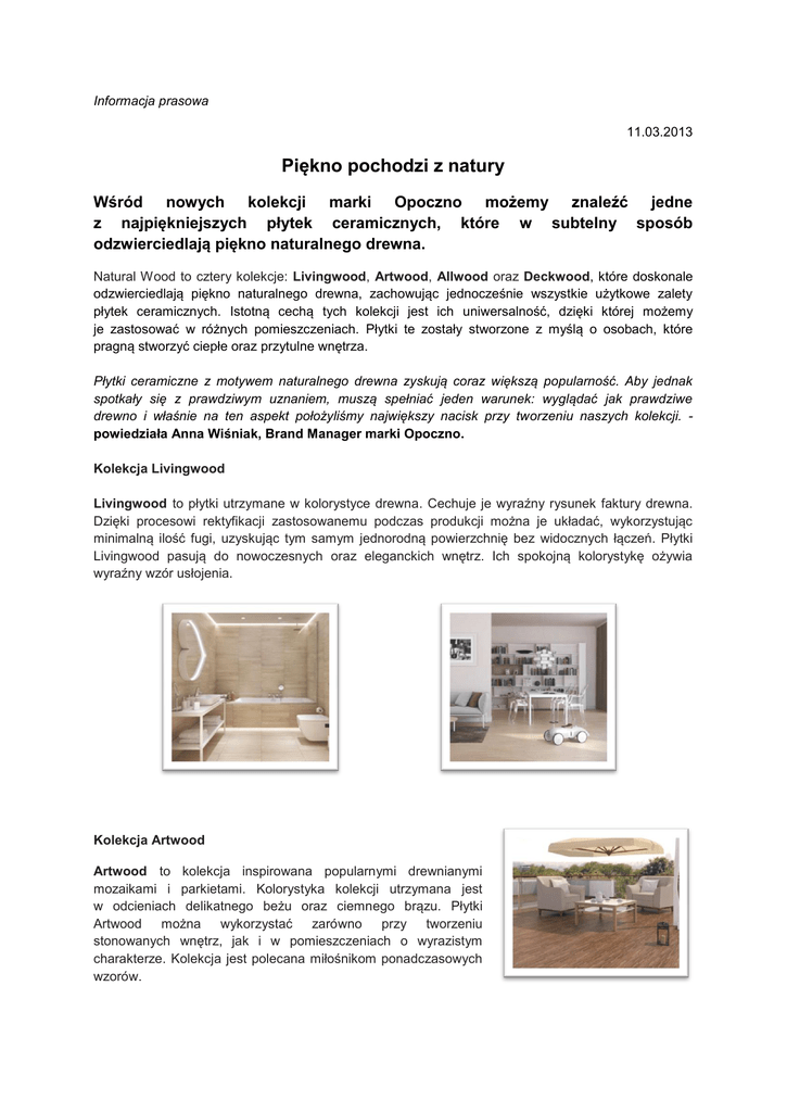 Informacja prasowa 11.03.2013 Piękno pochodzi z natury Wśród nowych kolekcji marki Opoczno możemy znaleźć jedne z najpiękniejszych płytek ceramicznych, które w subtelny sposób odzwierciedlają piękno naturalnego drewna. Natural Wood to cztery kolekcje: Livingwood, Artwood, Allwood oraz Deckwood, które doskonale odzwierciedlają piękno naturalnego drewna, zachowując jednocześnie wszystkie użytkowe zalety płytek ceramicznych. Istotną cechą tych kolekcji jest ich uniwersalność, dzięki której możemy je zastosować w różnych pomieszczeniach. Płytki te zostały stworzone z myślą o osobach, które pragną stworzyć ciepłe oraz przytulne wnętrza. Płytki ceramiczne z motywem naturalnego drewna zyskują coraz większą popularność. Aby jednak spotkały się z prawdziwym uznaniem, muszą spełniać jeden warunek: wyglądać jak prawdziwe drewno i właśnie na ten aspekt położyliśmy największy nacisk przy tworzeniu naszych kolekcji. powiedziała Anna Wiśniak, Brand Manager marki Opoczno. Kolekcja Livingwood Livingwood to płytki utrzymane w kolorystyce drewna. Cechuje je wyraźny rysunek faktury drewna. Dzięki procesowi rektyfikacji zastosowanemu podczas produkcji można je układać, wykorzystując minimalną ilość fugi, uzyskując tym samym jednorodną powierzchnię bez widocznych łączeń. Płytki Livingwood pasują do nowoczesnych oraz eleganckich wnętrz. Ich spokojną kolorystykę ożywia wyraźny wzór usłojenia. Kolekcja Artwood Artwood to kolekcja inspirowana popularnymi drewnianymi mozaikami i parkietami. Kolorystyka kolekcji utrzymana jest w odcieniach delikatnego beżu oraz ciemnego brązu. Płytki Artwood można wykorzystać zarówno przy tworzeniu stonowanych wnętrz, jak i w pomieszczeniach o wyrazistym charakterze. Kolekcja jest polecana miłośnikom ponadczasowych wzorów. Kolekcja Allwood Allwood idealnie odwzorowuje strukturę i barwę naturalnego drewna: tekowego, sosny, dębu oraz orzecha. Jasne płytki imitujące sosnę nadadzą wnętrzu lekkości i przestronności, zaś ciemniejsze, utrzymane w kolorystyce drewna tekowego i orzecha mogą znakomicie podkreślać egzotyczny charakter pomieszczenia. Kolekcje Allwood możemy również wykorzystać do aranżacji pomieszczeń na zewnątrz. Kolekcja Deckwood Deckwood to wyjątkowa kolekcja płytek o strukturalnej powierzchni, która wyglądem i fakturą nawiązuje do tarasowych desek ryflowanych. Charakteryzują się doskonałymi właściwościami antypoślizgowymi. Wyjątkowo dobrze sprawdzają się na zewnątrz budynków np. tworząc podłogę na tarasach. Kolekcja Deckwood prezentuje się interesująco, przyciąga uwagę i zachowuje trwałość niezależnie od warunków pogodowych.