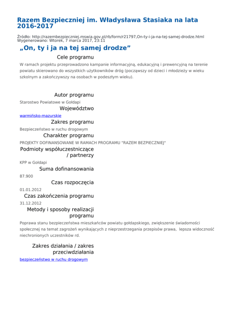 Razem Bezpieczniej im. Władysława Stasiaka na lata 2016-2017 Źródło: http://razembezpieczniej.mswia.gov.pl/rb/form/r21797,On-ty-i-ja-na-tej-samej-drodze.html Wygenerowano: Wtorek, 7 marca 2017, 23:11 „On, ty i ja na tej samej drodze” Cele programu W ramach projektu przeprowadzono kampanie informacyjną, edukacyjną i prewencyjną na terenie powiatu skierowano do wszystkich użytkowników dróg (począwszy od dzieci i młodzieży w wieku szkolnym a zakończywszy na osobach w podeszłym wieku). Autor programu Starostwo Powiatowe w Gołdapi Województwo warmińsko-mazurskie Zakres programu Bezpieczeństwo w ruchu drogowym Charakter programu PROJEKTY DOFINANSOWANE W RAMACH PROGRAMU "RAZEM BEZPIECZNIEJ" Podmioty współuczestniczące / partnerzy KPP w Gołdapi Suma dofinansowania 87.900 Czas rozpoczęcia 01.01.2012 Czas zakończenia programu 31.12.2012 Metody i sposoby realizacji programu Poprawa stanu bezpieczeństwa mieszkańców powiatu gołdapskiego, zwiększenie świadomości społecznej na temat zagrożeń wynikających z nieprzestrzegania przepisów prawa, lepsza widoczność niechronionych uczestników rd. Zakres działania / zakres przeciwdziałania bezpieczeństwo w ruchu drogowym