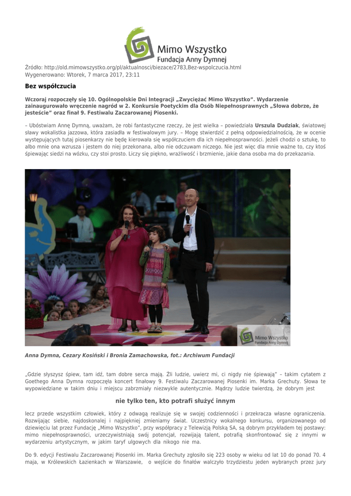Źródło: http://old.mimowszystko.org/pl/aktualnosci/biezace/2783,Bez-wspolczucia.html Wygenerowano: Wtorek, 7 marca 2017, 23:11 Bez współczucia Wczoraj rozpoczęły się 10. Ogólnopolskie Dni Integracji „Zwyciężać Mimo Wszystko”. Wydarzenie zainaugurowało wręczenie nagród w 2. Konkursie Poetyckim dla Osób Niepełnosprawnych „Słowa dobrze, że jesteście” oraz finał 9. Festiwalu Zaczarowanej Piosenki. – Ubóstwiam Annę Dymną, uważam, że robi fantastyczne rzeczy, że jest wielka – powiedziała Urszula Dudziak, światowej sławy wokalistka jazzowa, która zasiadła w festiwalowym jury. – Mogę stwierdzić z pełną odpowiedzialnością, że w ocenie występujących tutaj piosenkarzy nie będę kierowała się współczuciem dla ich niepełnosprawności. Jeżeli chodzi o sztukę, to albo mnie ona wzrusza i jestem do niej przekonana, albo nie odczuwam niczego. Nie jest więc dla mnie ważne to, czy ktoś śpiewając siedzi na wózku, czy stoi prosto. Liczy się piękno, wrażliwość i brzmienie, jakie dana osoba ma do przekazania. Anna Dymna, Cezary Kosiński i Bronia Zamachowska, fot.: Archiwum Fundacji „Gdzie słyszysz śpiew, tam idź, tam dobre serca mają. Źli ludzie, uwierz mi, ci nigdy nie śpiewają” – takim cytatem z Goethego Anna Dymna rozpoczęła koncert finałowy 9. Festiwalu Zaczarowanej Piosenki im. Marka Grechuty. Słowa te wypowiedziane w takim dniu i miejscu zabrzmiały niezwykle autentycznie. Mądrzy ludzie twierdzą, że dobrym jest nie tylko ten, kto potrafi służyć innym lecz przede wszystkim człowiek, który z odwagą realizuje się w swojej codzienności i przekracza własne ograniczenia. Rozwijając siebie, najdoskonalej i najpiękniej zmieniamy świat. Uczestnicy wokalnego konkursu, organizowanego od dziewięciu lat przez Fundację „Mimo Wszystko”, przy współpracy z Telewizją Polską SA, są dobrym przykładem tej postawy: mimo niepełnosprawności, urzeczywistniają swój potencjał, rozwijają talent, potrafią skonfrontować się z innymi w wydarzeniu artystycznym, w jakim taryf ulgowych dla nikogo nie ma. Do 9. edycji Festiwalu Zaczarowanej Piosenki im. Marka Grechuty zgłosiło się 223 osoby w wieku od lat 10 do ponad 70. 4 maja, w Królewskich Łazienkach w Warszawie, o wejście do finałów walczyło trzydziestu jeden wybranych przez jury wokalistów. Dwunastu z nich wystąpiło w sobotę na krakowskim Rynku. Kiedy wybrzmiał festiwalowy hymn, czyli radosne i energetyzujące „Assa Tadarassa”, na scenie pod Ratuszem pojawiła się Irena Santor, opiekunka artystyczna wszystkich edycji konkursu, a także tegoroczni jurorzy: Urszula Dudziak, Jacek Cygan, Jerzy Stuhr, Zbigniew Preisner, Jan Kanty Pawluśkiewicz, Adam Sztaba, Ewa Błaszczyk, Marek Piekarczyk, Monika Kuszyńska i Magdalena Waligórska (sekretarz). Pośród głośnego aplauzu publiczności każdy wypuścił z dłoni białego gołębia. Publiczność nie zawiodła, fot.: Archiwum Fundacji – Niech piosenka, jak te ptaki, poszybuje w przestworza, niech uwolni w nas radość, obali wszelkie bariery, da nam nowe siły i rozjaśnia nasz świat – powiedziała Irena Santor. Podczas tegorocznego koncertu finaliści Festiwalu Zaczarowanej Piosenki mierzyli się z utworami, do których słowa napisał Jacek Cygan. Współautor przeboju Eurowizji „To nie ja!” przewodniczył także składowi jury. Dwunastce wokalistów z niepełnosprawnościami towarzyszyły na scenie gwiazdy: Katarzyna Groniec, Kayah, Anna Ozner, Ryszard Rynkowski, Grzegorz Turnau i Mrozu. Koncert rozpoczęli piosenkarze do lat 16. Tę część finału Anna Dymna poprowadziła z Cezarym Kosińskim. – Jestem tu dlatego, że swojej popularności uwielbiam używać również do fajnych spraw – wyznała Kayah. – Podczas prób z Julią i Michałem Wiśniewskim usłyszałam, że ci ludzie są bardzo muzykalni. Myślę, że, pracując nad sobą, mogą osiągnąć sukces. Talent jest talentem, muzykalność – muzykalnością. Nic innego nie wchodzi w grę. Tego rodzaju festiwal nie tylko staje się szansą dla młodych ludzi z niepełnosprawnościami fizycznymi, ale uczy też empatii, której nam, Polakom, brakuje. Cieszę się ogromnie, że tu jestem. Mówiąc szczerze Julka i Michał śpiewają czyściej niż niejeden znany wokalista – 12-letnia Julia Bagińska ze Stróżów, w duecie z Kayah, wykonała „Śpij, kochanie, śpij”, solo: „Wszystkie dzieci nasze są” – 13-letnia Viktoria Pongowska z Ostrowca Świętokrzyskiego zaśpiewała, w duecie z Mrozu, „1000 metrów”, solo: „Dary losu” – 14-letnia Sandra Chorąży ze Szczecina, w duecie z Grzegorzem Turnauem, wykonała „Lirykę”, solo: „Jawę” – 14-letnia Aleksandra Orłowska z Krupskiego Młyna, w duecie z Anną Ozner zaśpiewał „Do przodu żyj”, solo: „Zakazany owoc” – 16-letnia Ilona Kałuża z Rypina, w duecie z Katarzyną Groniec, wykonała „Szyby”, solo: „Śpiewająco” – 14-letni Roland Świstek z Płotów, w duecie z Ryszardem Rynkowskim, zaśpiewał „Dziewczyny lubią brąz”, solo: „Inny nie będę” Werdykt co do trzeciego i drugiego miejsca nie był jednogłośny. Jednak nikt z jurorów nie miał wątpliwości, komu należy przyznać pierwszą nagrodę. Zwycięzcą 9. Festiwalu Zaczarowanej Piosenki im. Marka Grechuty w kategorii do 16. roku życia został Roland Świstek. Drugie miejsce przyznano Ilonie Kałuży, trzecie – Sandrze Chorąży. – Roland był rewelacyjny – stwierdziła, nie kryjąc wzruszenia, Joanna Lalek, jedna z nauczycielek śpiewu, która dla finalistów festiwalu prowadziła tygodniowe warsztaty wokalne poprzedzające koncert. – Chłonął cudownie interpretację utworów. Jako osoba niewidoma, doskonale na przykład zrozumiał słowo „jasnoniebieski” – jako synonim określeń „czysty”, „niewinny”, „anielski”, „dobry”… To było dla mnie zupełnie wyjątkowe doświadczenie. Wzruszenia i dumy nie krył także Rys