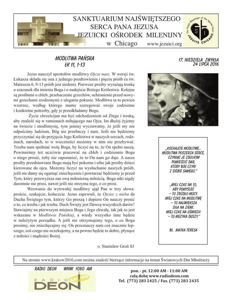 SANKTUARIUM NAJŚWIĘTSZEGO SERCA PANA JEZUSA JEZUICKI OŚRODEK MILENIJNY w Chicago www.jezuici.org Modlitwa Pańska Łk 11, 1-13 Jezus nauczył apostołów modlitwy Ojcze nasz. W wersji św. Łukasza składa się ona z jednego pozdrowienia i pięciu próśb (u św. Mateusza 6, 9-13 próśb jest siedem). Pierwsze prośby wyrażają troskę o szacunek dla imienia Boga i o nadejście Bożego Królestwa. Kolejne są prośbami o chleb, przebaczenie grzechów, uchronienie przed nowymi grzechami zrodzonymi z ulegania pokusie. Modlitwa ta to pewien wzorzec, według którego mamy szeregować swoje codzienne i konkretne potrzeby, gdy je przedkładamy Bogu. Życie chrześcijan ma być odchodzeniem od Złego i troską, aby znaleźć się w ramionach miłującego nas Ojca. Im dłużej żyjemy na świecie i modlimysię, tym jaśniej wyczuwamy, że jeśli my nie odpuścimy ludziom, Bóg nie przebaczy i nam. Jeśli nie będziemy przyczyniać się do przyjęcia Jego Królestwa w naszych sercach, rodzinach, narodach, to w wieczności możemy w nim nie przebywać. Trzeba nam spełniać wolę Boga, by liczyć na to, że On spełni naszą. Powinniśmy też uczciwie pracować na chleb i codziennie Boga o niego prosić, żeby nie zapomnieć, że to On nam go daje. A nasze prośby przedstawiane Bogu mają być pokorne i ufne jak prośby dzieci kierowane do ojca. Możemy liczyć na wysłuchanie naszych próśb, jeśli nie damy się ogarnąć zniechęceniu i powtarzać będziemy je przed Tym, który przewyższa nas swą miłosierną miłością. Boga nikt nigdy daremnie nie prosi, nawet jeśli nie otrzyma tego, o co prosi. Wezwanie do wytrwałej modlitwy ujął Pan w trzy słowa: proście, szukajcie, kołaczcie. Jezus zapewnił, że Ojciec z nieba da Ducha Świętego tym, którzy Go proszą i dopiero On nauczy prosić o to, co trzeba i jak trzeba. Duch Święty jest Dawcą wszystkich darów! Stawiajmy na pierwszym miejscu Boga i Jego chwałę, tak jak to jest wskazane w Modlitwie Pańskiej, a wtedy wszystko inne będzie w należytym porządku. A jeśli nie otrzymujemy tego, o co Boga prosimy, nie zniechęcajmy się. On przeznaczy nam coś znacznie lepszego, coś czego nie oczekujemy, a na pewno będzie to dobre, płynące z miłości i mądrości Bożej. 17. Niedziela zwykła 24 lipca 2016 ,,Kochajcie modlitwę... modlitwa poszerza serce, czyniąc je zdolnym pomieścić dar, który Bóg czyni z siebie samego.” ,,Miej czas na to, aby pomyśleć – to źródło mocy. Miej czas na modlitwę – to największa siła na ziemi. Miej czas na uśmiech – to muzyka duszy.” bł. Matka Teresa o. Stanisław Groń SJ Na stronie www.krakow2016.com można znaleźć bierzące informacje na temat Światowych Dni Młodzieży RADIO DEON WNWI 1080 AM pon. - pt. 12:00 AM - 11:00 AM całą dobę www.radiodeon.com Tel. (773) 283 2425 / Fax. (773) 283 2435 PORZĄDEK MSZY ŚWIĘTYCH Poniedziałek - pi¹tek: 8:00, 18:00, 19:00 I piątek miesiąca: 8:00, 18:00 i 19:00 Środa: 19:00 - nowenna do Matki Bożej Nieustającej Pomocy Sobota: 8:00 i 19:00 , tylko w I sobotę miesiąca o 17:00 dla chorych, Niedziela: 8:00 (radiowa), 9:30, 11:00, 13:00, 19:00, 20:30 -=- SpowiedŸ św.: od poniedziałku do soboty - 7:30 i 18:30, w niedzielę - pó³ godziny przed ka¿d¹ Msz¹ Œwiêt¹, W 1. pi¹tek miesi¹ca - od 17:30 do 20:00 Adoracja Najświętszego Sakramentu - od poniedziałku do czwartku - od 18:30 do 19:00 Sanktuarium Najświętszego Serca Pana Jezusa Jezuicki Ośrodek Milenijny 5835 W. Irving Park Rd.; Chicago, IL 60634, tel. 773 777 7000 fax 773 427 0126 www.jezuici.org e-mail: [email protected] Audycje Radia DEON: tel. 773 283 2425 Fax. 773 283 2435 www. radiodeon.com e-mail: [email protected] Biuro czynne: od poniedziałku do soboty: 8:30 - 9:00, 15:30 - 20:30 niedziela: 8:30 - 15:00 Biblioteka czynna: niedziela: 10:30 - 14:30 Kawiarenka czynna: niedz.: 10:00 - 15:00 Sacred Heart Mission House 4105 N. Avers Ave., Chicago, IL 60618 tel. 773 588 74 76; fax 773 588 65 17 Rektor Sanktuarium i Przełożony Jezuitów o. Tomasz Oleniacz , SJ (773-588-7476 - ext. 224) o. Józef Birecki, SJ (773-777-7000 - ext. 121) o. Jerzy Mordarski, SJ (773-588-7476 - ext. 234) o. Jerzy Karpiński, SJ (773-588-7476 - ext. 237) o. Paweł Witon, SJ (773-588-7476 - ext. 227) br. Adam Poręba, SJ (773-777-7000 - ext. 122) Wszelkie ofiary i donacje prosimy kierowaæ na adres Sanktuarium. Donacje s¹ wolne od podatku i mo¿na je odpisywaæ przy rozliczeniu z IRS. TRANSMISJE RADIOWE I INTERNETOWE  w internecie pod adresem: http://75.145.184.1/polishmass  niedziela: godz 8:00, Radio WCEV 1450 Codziennie przez całą dobę: Kamera internetowa z Sanktuarium (obraz i dźwięk; używać Internet Explorer): www.jezuici.org - link „Transmisje na żywo” – wpisać jako użytkownik i hasło: 5835 INTENCJE MSZY ŚWIĘTYCH Niedziela, 24 VII 8:00 + Helena Piątek 9:30 Zbiorowa 11:00 + Władysław Nowak w 24. rocznicę śmierci oraz za zmarłych z tej rodziny 13:00 zmarli z rodziny Ziemian 19:00 Zbiorowa 20:30 o błogosławieństwo Boże i opiekę Matki Najświętszej, zdrowie i 7 darów Ducha Św. dla syna Krzysia Poniedziałek, 25 VII - św. Jakuba Apostoła 8:00 + Krzysztof Gajderowicz w dniu imienin o spokój jego duszy 18:00 o wyzwolenie z nałogu palenia papierosów dla syna 19:00 Zbiorowa Wtorek, 26 VII - świętych Joachima i Anny, rodziców NMP 8:00 + Anna Nowik, + Wiktor Nowik, + Henryk Nowik 18:00 z okazji imienin córki Anny o mądrosć, zdrowie, 7 darów Ducha Św., błogosławieństwo Boże i opiekę Matki Najświętszej 19:00 Zbiorowa Środa, 27 VII 8:00 za Dobroczyńców Jezuickiego Ośrodka Milenijnego 18:00 + Jan Petryszak w 2. rocznicę śmierci 19:00 Zbiorowa Czwartek, 28 VII 8:00 o zdrowie, błogosławieństwo Boże i opiekę Matki Najświętszej dla Anieli i rodziną 18:00 + Władysław Ledwoń 19:00 Zbiorowa Piątek, 29 VII 8:00 o zdrowie i Boże błogosławieństwo dla syna Kazia Kucmierz z okazji urodzi 18:00 + Anna Ptasński w rocznicę śmi