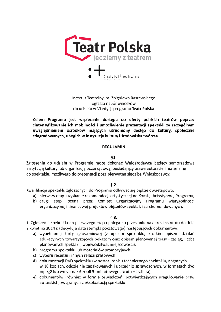 Instytut Teatralny im. Zbigniewa Raszewskiego ogłasza nabór wniosków do udziału w VI edycji programu Teatr Polska Celem Programu jest wspieranie dostępu do oferty polskich teatrów poprzez zintensyfikowanie ich mobilności i umożliwienie prezentacji spektakli ze szczególnym uwzględnieniem ośrodków mających utrudniony dostęp do kultury, społecznie zdegradowanych, ubogich w instytucje kultury i środowiska twórcze. REGULAMIN §1. Zgłoszenia do udziału w Programie może dokonać Wnioskodawca będący samorządową instytucją kultury lub organizacją pozarządową, posiadający prawa autorskie i materialne do spektaklu, możliwego do prezentacji poza pierwotną siedzibą Wnioskodawcy. § 2. Kwalifikacja spektakli, zgłoszonych do Programu odbywać się będzie dwuetapowo: a) pierwszy etap: uzyskanie rekomendacji artystycznej od Komisji Artystycznej Programu, b) drugi etap: ocena przez Komitet Organizacyjny Programu wiarygodności organizacyjnej i finansowej projektów objazdów spektakli zarekomendowanych. § 3. 1. Zgłoszenie spektaklu do pierwszego etapu polega na przesłaniu na adres Instytutu do dnia 8 kwietnia 2014 r. (decyduje data stempla pocztowego) następujących dokumentów: a) wypełnionej karty zgłoszeniowej (z opisem spektaklu, krótkim opisem działań edukacyjnych towarzyszących pokazom oraz opisem planowanej trasy - zasięg, liczba planowanych spektakli, województwa, miejscowości), b) programu spektaklu lub materiałów promocyjnych c) wyboru recenzji i innych relacji prasowych, d) dokumentacji DVD spektaklu (w postaci zapisu technicznego spektaklu, nagranych w 10 kopiach, oddzielnie zapakowanych i uprzednio sprawdzonych, w formatach dvd mpeg2 lub wmv oraz 6 kopii 5- minutowego skrótu – trailera), e) dokumentów (również w formie oświadczeń) potwierdzających uregulowanie praw autorskich, związanych z eksploatacją spektaklu. f) dokumentów potwierdzające status prawny Wnioskodawcy (aktualny odpis z właściwego rejestru). 2. Jeden Wnioskodawca może zgłosić w jednej edycji Programu tylko jeden spektakl. 3. Ocena formalna zgłoszeń: a) zgłoszenia oceniane są pod względem formalnym przez Instytut Teatralny b) zgłoszenia, w których stwierdzono błędy formalne nie podlegają ocenie Komisji Artystycznej c) błąd formalny występuje, gdy zaistnieje jedna z niżej wymienionych okoliczności: - zgłoszenie nie spełnienia wymogów z par. 1, - nadesłanie zgłoszenia po terminie par. 3.1, - niezałączenie do zgłoszenia dokumentacji DVD spektaklu par. 3.1.d, - zgłoszenie przez jednego Wnioskodawcę więcej niż 1 spektaklu par. 3.2, - nadesłanie zgłoszenia, które było już raz rozpatrywane przez Komisję Artystyczną w poprzednich edycjach programu. 1. 2. 3. 4. 5. 6. § 4. Komisja Artystyczna decyduje o wydaniu rekomendacji artystycznej do 9 maja 2014 roku. Komisja Artystyczna może również wskazać spektakle poza konkursem, których udział w Programie zdaniem Komisji pozytywnie wpłynie na wartość artystyczną i merytoryczną Programu. Spektakle wskazane przez Komisję Artystyczną, które przystąpią do Programu, kwalifikowane są do udziału w trybie przewidzianym w par. 5. Spektakle, które uzyskają rekomendację artystyczną oraz spektakle wskazane przez Komisję Artystyczną przechodzą do drugiego etapu kwalifikacji i zwane są dalej spektaklami zarekomendowanymi. Rekomendacja artystyczna nie jest równoznaczna z uzyskaniem dotacji w drugim etapie Kwalifikacji. Od decyzji Komisji Artystycznej nie przysługuje odwołanie. Lista zarekomendowanych przez Komisję Artystyczną spektakli zostanie opublikowana na stronie internetowej programu. § 5. 1. Drugi etap kwalifikacji odbywa się na podstawie przedstawionego przez Wnioskodawcę wniosku - projektu i kosztorysu objazdu spektaklu zarekomendowanego. 2. Termin zgłaszania projektów objazdów spektakli zarekomendowanych mija 10 czerwca 2014 roku (decyduje data stempla pocztowego). Wniosek należy również przesłać na adres mailowy: [email protected]. 3. Objazd spełniać musi następujące warunki: a) w jego ramach spektakl zarekomendowany musi być zaprezentowany w nie mniej niż w 5 miejscowościach, w których nie ma teatrów instytucjonalnych (państwowych lub samorządowych) poza miejscowością, będącą siedziba Wnioskodawcy, b) objazd musi się rozpocząć po 24 lipca, a zakończyć do 30 listopada 2014 roku, c) prezentacje spektakli odbywają się w godzinach wieczornych, od godz. 18.00, a spektakle adresowane do dzieci nie wcześniej niż od godz. 16.00, d) jednego dnia mogą odbywać się nie więcej niż 2 powtórzenia spektaklu zarekomendowanego, w przypadku dwukrotnej prezentacji, jedna z nich może odbyć się przed godz. 18.00 (a w przypadku spektakli adresowanych do dzieci przed godz. 16.00), e) objazd nie obejmuje prezentacji w ramach festiwali i przeglądów, f) w każdym miejscu prezentacji spektaklowi muszą towarzyszyć działania edukacyjne. 4. Projekt objazdu, zgłoszony do drugiego etapu kwalifikacji zawierać musi: a) wypełniony wniosek zawierający: - opis celów, grup docelowych, - opis środowisk, z przybliżoną oceną liczby widzów wraz z jednostkową ceną biletów; - dokładny plan dzienny objazdu z terminami i lokalizacjami poszczególnych spektakli; - imienną listą wykonawców i ilościową pracowników technicznych i organizacyjnych, uczestniczących w objeździe, z określeniem funkcji wykonywanych w trakcie objazdu; - plan promocji objazdu; - oświadczenie wnioskodawcy o posiadaniu zasobów rzeczowych i kadrowych zapewniających prawidłowe wykonanie zadania; Do wniosku należy dołączyć: a) dokładną zbilansowaną kalkulację objazdu z uwzględnieniem wszystkich kosztów oraz źródeł finansowania, w tym szacowanych wpływów z biletów, dodatkowej pomocy finansowej od partnerów lokalnych oraz kwotowym określeniem oczekiwanej dotacji w ramach programu Teatr Polska w formie: - Preliminarza kosztów projektu – (załącznik nr