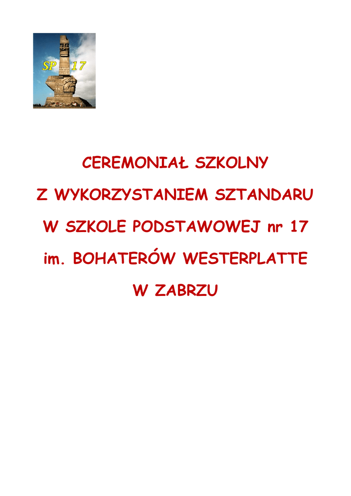 CEREMONIAŁ SZKOLNY Z WYKORZYSTANIEM SZTANDARU W SZKOLE PODSTAWOWEJ nr 17 im. BOHATERÓW WESTERPLATTE W ZABRZU Wstęp Zgodnie z zapisem znajdującym się we wstępie do Ustawy z dnia 7 września 1991r. o systemie oświaty: „Kształcenie i wychowanie słuŜy rozwijaniu u młodzieŜy poczucia odpowiedzialności, miłości do Ojczyzny oraz poszanowania dla polskiego dziedzictwa kulturowego, przy jednoczesnym otwarciu na wartości kultur Europy i świata. Szkoła winna zapewnić kaŜdemu uczniowi warunki niezbędne do jego rozwoju, przygotować go do wypełniania obowiązków rodzinnych i obywatelskich w oparciu o zasady solidarności, demokracji, tolerancji, sprawiedliwości wolności” oraz artykułem 4 Ustawy, gdzie czytamy: „Nauczyciel w swoich działaniach dydaktycznych, wychowawczych i opiekuńczych ma obowiązek kierowania się dobrem uczniów, troską o ich zdrowie, postawy moralne i obywatelskie z poszanowaniem godności osobistej ucznia” – celowym wydaje się zdefiniowanie i określenie we współczesnej szkole najwaŜniejszych pojęć oraz zachowań uczniów tworzących ceremoniał szkolny. Ceremoniał szkolny to opis sposobów przeprowadzania najwaŜniejszych uroczystości szkolnych z udziałem sztandaru szkoły, to równieŜ zbiór zasad zachowania się młodzieŜy w trakcie uroczystości szkolnych. § 1 CEREMONIAŁ Ceremoniał szkolny Szkoły Podstawowej nr 17 im. Bohaterów Westerplatte w Zabrzu jest opisem uroczystości z udziałem sztandaru szkolnego. NaleŜą do nich ślubowania, obchody świąt państwowych oraz uroczystości środowiskowe. Stanowi integralną część z tradycjami szkoły oraz przyjętym harmonogramem uroczystości szkolnych. Ceremoniał szkolny jest waŜnym elementem szkolnego programu wychowawczego. Nawiązuje on bowiem do tradycji szkoły, a takŜe wzbogaca treści słuŜące kształceniu emocjonalnego stosunku do symboli narodowych i Ojczyzny. Kształtuje w uczniach postawy patriotyczne i uczy szacunku do tradycji narodu polskiego i jego symboli. Szkoła Podstawowa nr 17 w Zabrzu Strona 2 Sztandar, na którym widnieje nazwa szkoły i jej imię, uczy godnej postawy i zobowiązuje do przejmowania zasad postępowania Patrona Szkoły – Bohaterów Westerplatte: - ludzi prawych, uczciwych, patriotów, - honorowych, wypełniających przysięgę Ŝołnierską, - gotowych do najwyŜszej ofiary w imię miłości do Ojczyzny. § 2 SYMBOLE SZKOLNE Do najwaŜniejszych symboli szkolnych będziemy zaliczać: godło logo szkoły, sztandar szkoły. Godło – logo szkoły – jest znakiem rozpoznawczym szkoły. NaleŜy je eksponować podczas uroczystości, na dyplomach, oficjalnych pismach urzędowych szkoły, znaczkach, identyfikatorach itp. Sztandar szkoły to prostokątny płat tkaniny obszyty złotą frędzlą. Prawa strona jest w barwach narodowych z umieszczonym centralnie godłem narodowym. Na lewej stronie płata w kolorze niebieskim znajduje się wizerunek patrona szkoły – Pomnik Bohaterów Westerplatte, wokół którego zamieszczony jest wyszyty srebrną nitką napis z nazwą i imieniem szkoły. Sztandar powinien uczestniczyć w najwaŜniejszych uroczystościach szkolnych, poza szkołą na zaproszenie innych szkół, instytucji oraz uroczystościach państwowych, regionalnych, kościelnych. Dla społeczności szkolnej sztandar szkolny jest symbolem Polski – Narodu – Małej Ojczyzny, jaką jest szkoła j jej najbliŜsze środowisko. Uroczystości z udziałem sztandaru wymagają zachowania powagi poszanowania w trakcie jego prezentacji. Szkoła Podstawowa nr 17 w Zabrzu Strona 3 Przechowanie, transport i przygotowanie sztandaru do prezentacji wymagają właściwych postaw jego poszanowania. Sztandar jest przechowywany na terenie szkoły w zamkniętej gablocie. Rangę sztandaru podnosi ceremonia jego poświęcenia w listopadzie 1990r., dzięki czemu ma ona wymiar nie tylko świecki, ale równieŜ religijny. § 3 POCZET SZTANDAROWY – INSYGNIA POCZTU Sztandarem szkoły opiekuje się poczet sztandarowy z wyznaczonym opiekunem sztandaru przez dyrektora szkoły spośród członków Rady Pedagogicznej. Jest to dla wyznaczonych uczniów niezwykły honor i zaszczyt. Uczestnictwo w poczcie sztandarowym to najbardziej honorowa funkcja w szkole, dlatego w jego składzie powinni znaleźć się uczniowie o nienagannej postawie i godni takiego szacunku. Skład osobowy pocztu sztandarowego tworzą: - chorąŜy – sztandarowy – uczeń - asysta – dwie uczennice Kandydatury składu pocztu sztandarowego oraz składu zastępczego są przedstawione przez wychowawców klas piątych przy współpracy z opiekunem Samorządu Uczniowskiego. Skład pocztu sztandarowego naleŜy przedstawić i zatwierdzić na czerwcowej Radzie Pedagogicznej. O wyborze uczniów do pocztu sztandarowego powiadamia się ich rodziców/ opiekunów prawnych specjalnym listem okolicznościowym. Kadencja pocztu sztandarowego trwa jeden rok – począwszy od przekazania sztandaru w dniu uroczystego zakończenia roku szkolnego. Po zakończeniu kadencji uczniom wręczane są pamiątkowe dyplomy, a ich nazwiska wpisuje się do kroniki szkolnej. Szkoła Podstawowa nr 17 w Zabrzu Strona 4 Decyzją Rady Pedagogicznej uczniowie mogą zostać odwołani ze składu pocztu sztandarowego. W takim przypadku dokonuje się wyboru uzupełniającego. ChorąŜy i asysta powinni być ubrani odświętnie: - uczeń – garnitur lub ciemne spodnie, biała koszula, ciemne obuwie, - uczennice – białe bluzki, ciemne spódnice tej samej długości, ciemne pełne obuwie. Insygnia pocztu sztandarowego: - biało-czerwone szarfy przewieszone przez prawe ramię, zwrócone kolorem białym w stronę kołnierza, spięte na lewym biodrze, - białe rękawiczki. Insygnia pocztu sztandarowego przechowywane są w sekretariacie. § 4 UDZIAŁ SZTANDARU W UROCZYSTOŚCIACH Na terenie szkoły sztandar bierze udział w uroczystościach: - ślubowania klas pierwszych, - uroczystego zakończenie roku szkolnego z poŜegnaniem absolwent