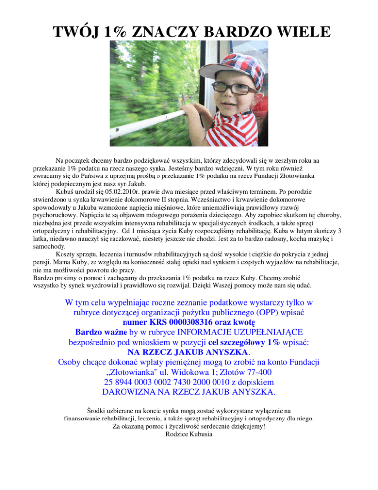 TWÓJ 1% ZNACZY BARDZO WIELE Na pocz tek chcemy bardzo podzi kowa wszystkim, którzy zdecydowali si w zeszłym roku na przekazanie 1% podatku na rzecz naszego synka. Jeste my bardzo wdzi czni. W tym roku równie zwracamy si do Pa stwa z uprzejm pro b o przekazanie 1% podatku na rzecz Fundacji Złotowianka, której podopiecznym jest nasz syn Jakub. Kubu urodził si 05.02.2010r. prawie dwa miesi ce przed wła ciwym terminem. Po porodzie stwierdzono u synka krwawienie dokomorowe II stopnia. Wcze niactwo i krwawienie dokomorowe spowodowały u Jakuba wzmo one napi cia mi niowe, które uniemo liwiaj prawidłowy rozwój psychoruchowy. Napi cia te s objawem mózgowego pora enia dzieci cego. Aby zapobiec skutkom tej choroby, niezb dna jest przede wszystkim intensywna rehabilitacja w specjalistycznych rodkach, a tak e sprz t ortopedyczny i rehabilitacyjny. Od 1 miesi ca ycia Kuby rozpocz li my rehabilitacj . Kuba w lutym sko czy 3 latka, niedawno nauczył si raczkowa , niestety jeszcze nie chodzi. Jest za to bardzo radosny, kocha muzyk i samochody. Koszty sprz tu, leczenia i turnusów rehabilitacyjnych s do wysokie i ci kie do pokrycia z jednej pensji. Mama Kuby, ze wzgl du na konieczno stałej opieki nad synkiem i cz stych wyjazdów na rehabilitacje, nie ma mo liwo ci powrotu do pracy. Bardzo prosimy o pomoc i zach camy do przekazania 1% podatku na rzecz Kuby. Chcemy zrobi wszystko by synek wyzdrowiał i prawidłowo si rozwijał. Dzi ki Waszej pomocy mo e nam si uda . W tym celu wypełniaj c roczne zeznanie podatkowe wystarczy tylko w rubryce dotycz cej organizacji po ytku publicznego (OPP) wpisa numer KRS 0000308316 oraz kwot Bardzo wa ne by w rubryce INFORMACJE UZUPEŁNIAJ CE bezpo rednio pod wnioskiem w pozycji cel szczegółowy 1% wpisa : NA RZECZ JAKUB ANYSZKA. Osoby chc ce dokona wpłaty pieni nej mog to zrobi na konto Fundacji „Złotowianka” ul. Widokowa 1; Złotów 77-400 25 8944 0003 0002 7430 2000 0010 z dopiskiem DAROWIZNA NA RZECZ JAKUB ANYSZKA. rodki uzbierane na koncie synka mog zosta wykorzystane wył cznie na finansowanie rehabilitacji, leczenia, a tak e sprz t rehabilitacyjny i ortopedyczny dla niego. Za okazan pomoc i yczliwo serdecznie dzi kujemy! Rodzice Kubusia
