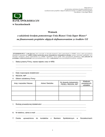 Załącznik nr 4 do Instrukcja udzielania kredytów pomostowych na finansowanie projektów objętych dofinansowaniem ze środków Unii Europejskiej Unia Biznes i Unia Super Biznes BANK SPÓŁDZIELCZY w Szczekocinach Wniosek o udzielenie kredytu pomostowego Unia Biznes/ Unia Super Biznes* na finansowanie projektów objętych dofinansowaniem ze środków UE ....................................................................................................................................................... ....................................................................................................................................................... ........................................................................................................................................................................................................... .(WNIOSKODAWCA - osoba fizyczna: imię i nazwisko, nr dowodu tożsamości, adres zamieszkania, nr PESEL, nazwa i adres prowadzonej działalności gospodarczej; spółka cywilna, partnerska, jawna, komandytowa, komandytowo-akcyjna: imiona i nazwiska wspólników, nr-y dowodów tożsamości, adresy zamieszkania, nr-y PESEL wspólników, nazwa spółki, adres prowadzenia działalności; inne jednostki nie posiadające osobowości prawnej: nazwa przedsiębiorstwa, adres, osoby prawne: nazwa przedsiębiorstwa/firma, siedziba). 1. Status prawny Firmy, nazwa rejestru oraz nr KRS: ............................................................................................................................................................ ............................................................................................................................................................ ............................................................................................................................................................ 2. Data rozpoczęcia działalności: ............................................................................................... 3. REGON, NIP: ........................................................................................................................ 4. Główni udziałowcy Firmy: Imię i nazwisko/ Nazwa 5. Adres/ Siedziba Nr dowodu tożsamości, PESEL/ REGON, NIP Wielkość posiadanych udziałów Rodzaj prowadzonej działalności: ......................................................................................... ................................................................................................................................................ ................................................................................................................................................ 6. Nr telefonu, adres e-mail ……...……………………………………………………………. ……………………………………………………………………………………………… 7. Osoba upoważniona do kontaktów z Bankiem Spółdzielczym w …………………………….………………………………………………………………… 1 Szczekocinach: 8. Wnioskuję/emy* o udzielenie kredytu w wysokości ........................................ (słownie złotych:.................................................................................................................................), na okres od......................................do ......................................., w tym karencja w spłacie kapitału w części uzupełniającej* ……………………………miesięcy. 9. Przeznaczeniem Kredytu będzie pokrycie kosztów realizacji projektu zatytułowanego .................................................................................................................................. .............,który opisany został w załączniku do niniejszego wniosku o udzielenie kredytu pomostowego oraz w skierowanym do ……………………………………………. …… (wpisać nazwę Instytucji Wdrażającej lub Pośredniczącej II stopnia) wniosku o dofinansowanie. Projekt realizowany będzie w ramach Programu: ………………………………………… (wpisać nazwę Programu) …………………………………………………………………………………….. 1. Działanie/ Poddziałanie (wpisać nazwę działania) ……….................................. 2. Działanie/ Poddziałanie (wpisać nazwę działania) ………………………............. 10. Całkowity koszt realizacji projektu zgodnie z pkt ………… Wniosku o dofinansowanie realizacji projektu wynosi .....................zł (słownie zł. ………………………..................), w tym wartość wydatków/ kosztów* kwalifikowanych, określonych w pkt ……… ww. Wniosku wynosi …................. zł (słownie złotych: .....................................................). 11. Wydatki/ koszty* kwalifikowane określone w pkt. ……. stanowią ……. % całkowitych kosztów realizacji projektu. 12. Wartość dofinansowania, o które aplikuję/emy, zgodnie z Wnioskiem o dofinansowanie, wynosi ................. zł (słownie złotych: ........................................................), co stanowi …….. % kosztów kwalifikowanych przedsięwzięcia, a wartość wnioskowanego kredytu stanowi……. .% wartości wnioskowanego wsparcia. 13. Wysokość środków uzyskanych w ciągu ostatnich 3 lat w ramach pomocy państwa poprzez mój/nasz* udział w programach wsparcia finansowego ze środków krajowych, jednostek samorządu terytorialnego, zagranicznych lub innych form wsparcia publicznego (zgodnie z pkt…… wniosku o dofinansowanie)* wynosiła: ……..……………………..zł. 14. Deklaruję/my* udział własny w finansowaniu projektu w kwocie ……………. zł., co pokrywa ……… % jego całkowitego przewidywanego kosztu. 15. Wnioskowany kredyt w kwocie …………………….. zł ob