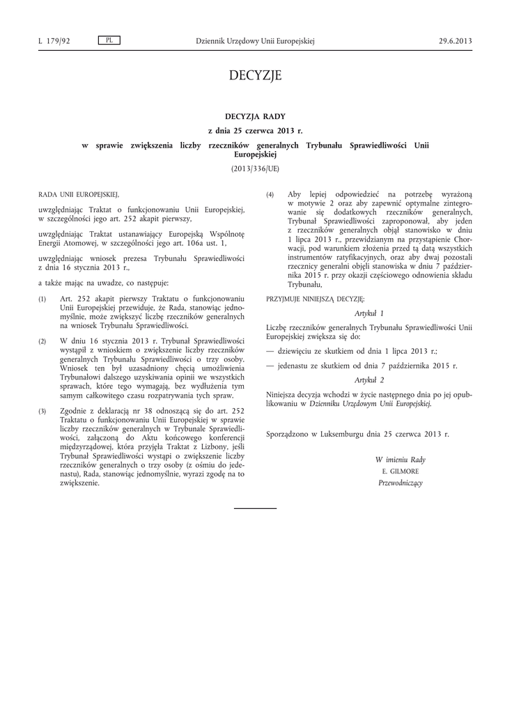 Decyzja Rady 2013-336 - liczba rzecznikow generalnych TSUE