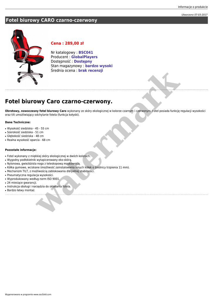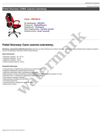 Informacje o produkcie Utworzono 07-03-2017 Fotel biurowy CARO czarno-czerwony Cena : 289,00 zł er m ar k Nr katalogowy : BSC041 Producent : GlobalPlayers Dostępność : Dostępny Stan magazynowy : bardzo wysoki Średnia ocena : brak recenzji Fotel biurowy Caro czarno-czerwony. Obrotowy, nowoczesny fotel biurowy Caro wykonany ze skóry ekologicznej w kolorze czarnym i czerwonym. Fotel posiada funkcję regulacji wysokości oraz tilt umożliwiający odchylanie fotela (funkcja kołyski). Dane Techniczne: ● ● ● ● Wysokość siedziska - 45 - 55 cm Szerokość siedziska - 51 cm Głębokość siedziska - 48 cm Realna wysokość oparcia - 68 cm Pozostałe informacje: ● ● ● ● ● ● ● ● w ● Fotel wykonany z miękkiej skóry ekologicznej w dwóch kolorach. Wygodny podłokietnik wytapicerowany eko-skórą. Nylonowa, gwieździsta noga z teleskopową maskownicą. Kółka gumowe, wciskane (możliwość zainstalowania innych kółek o średnicy trzpienia 11 mm). Mechanizm TILT, z możliwością zablokowania dla pełnej stabilności. Pneumatyczna regulacja wysokości. Wyprodukowany według norm ISO 9001. 24 miesiące gwarancji. Instrukcja obsługi i narzędzia do składania fotela. Bardzo łatwy montaż. at ● Wygenerowano w programie www.oscGold.com