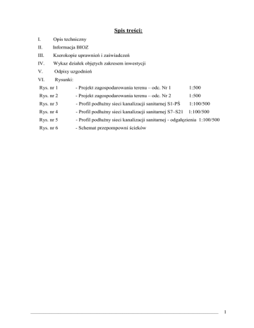 Spis treści: I. Opis techniczny II. Informacja BIOZ III. Kserokopie uprawnień i zaświadczeń IV. Wykaz działek objętych zakresem inwestycji V. Odpisy uzgodnień VI. Rysunki: Rys. nr 1 - Projekt zagospodarowania terenu – odc. Nr 1 1:500 Rys. nr 2 - Projekt zagospodarowania terenu – odc. Nr 2 1:500 Rys. nr 3 - Profil podłużny sieci kanalizacji sanitarnej S1-PŚ 1:100/500 Rys. nr 4 - Profil podłużny sieci kanalizacji sanitarnej S7–S21 1:100/500 Rys. nr 5 - Profil podłużny sieci kanalizacji sanitarnej - odgałęzienia 1:100/500 Rys. nr 6 - Schemat przepompowni ścieków ________________________________________________________________________________________ 1 I. Opis techniczny do projektu budowlano-wykonawczego sieci kanalizacji sanitarnej dla zabudowy mieszkaniowej zlokalizowanej w miejscowości Pasłęk, ul. Kolonia Zdroje. 1. Cel i zakres opracowania Celem opracowania jest przedstawienie technicznych możliwości budowy odcinka sieci kanalizacji sanitarnej dla potrzeb zabudowy mieszkaniowej zlokalizowanej w miejscowości Pasłęk, ul. Kolonia Zdroje. Zakresem swym opracowanie obejmuje: • kanalizację sanitarną o średnicach 200 x 5,9 mm z rur PVC o długości 277,00 mb • kanalizację sanitarną o średnicach 160 x 4,7 mm z rur PVC o długości 93,60 mb • kolektor tłoczny o średnicy: - • 90 mm PE PN 10 - 307,70 mb przepompownia ścieków – 1 szt. 2. Podstawa opracowania 2.1. Zlecenie Inwestora. 2.2. Warunki techniczne wydane przez PUW-K w Pasłęku – Jednostka Operatorska sp. z o.o. 2.3. Mapy syt.- wys. 1:500 do celów projektowych 2.4. Uzgodnienia branżowe 2.5. Wizja w terenie 2.6. Miejscowy Plan Zagospodarowania Przestrzennego południowej części Pasłęka - uchwała nr VI/58/10 Rady Miejskiej w Pasłęku z dnia 09 lipca 2010 r. ( Dziennik Urzędowy Województwa Warmińsko - Mazurskiego Nr 3, poz. 36 z dnia 13 stycznia 2011 r.). 3. Opis projektowanego rozwiązania 3.1. Kanalizacja sanitarna grawitacyjna Ścieki sanitarne z zabudowy mieszkaniowej odprowadzane będą do istniejącej tłocznej kanalizacji sanitarnej ∅ 90 mm w ul. Polnej w Pasłęku. Sieć kanalizacji sanitarnej projektuje się z rur PVC grubościennych gładkich o ściance litej (SN=8kN/m2) o średnicach 160 x 4,7 mm i 200 x 5,9 mm produkowanych zgodnie z normą PN-EN-1401: 2009. Studnie kanalizacyjne wg PN-EN 1917:2004 z kręgów betonowych z betonu C40/50 o nasiąkliwości do 5%, mrozoodporności F150 i stopniu wodoszczelności W8 o średnicy 1,0 m lub 1,20 m łączonych na uszczelki gumowe i pasty poślizgowej z monolitycznym dnem z kinetą wykonanym w całości z betonu samozagęszczalnego (beton w całym przekroju elementu powinien być zwarty i jednorodny – również w kinecie). Studnie zaopatrzyć we ________________________________________________________________________________________ 2 włazy żeliwne klasy D400 z zabezpieczeniem przed obrotem oraz stopnie złazowe fabrycznie osadzone. Studnie rewizyjne betonowe ze względu na lokalizację w ciągach jezdnych wyposażyć w płyty nastudzienne posadowione na betonowych pierścieniach odciążających. Studnie kanalizacyjne tworzywowe o średnicy 425 mm wykonać z włazami żeliwnymi typu A15 ( teren zielony). Na kolektorze przed przepompownią ścieków PŚ , zamontować zasuwę nożową lub z miękkim uszczelnieniem DN200 w wykonaniu „dla ścieków”. Kanały układać na podsypce piaskowej grubości 15 cm z obsypką po obu stronach rurociągu i nad rurociągiem min. 30 cm. Grunt pod podstawy studni należy zagęścić do wskaźnika Is > 0.98, moduł odkształcenia wtórnego do pierwotnego dla tego gruntu nie może być większy od 2,2. Projektowane przewody w ciągach jezdnych w 100 % obsypać piaskiem. Przy wykonywaniu zasypek w pasie drogowym należy: - nie używać do zasypek gleby, - górną warstwę na głębokości 1,0 m występującą bezpośrednio pod konstrukcją jezdni wykonać z gruntów sypkich i zagęścić do Is > 0,98. W przypadku wystąpienia w wykopach gruntów słabonośnych, dno pod rurociągi należy wzmocnić za pomocą podłoża żwirowo-piaskowego lub tłuczniowo-piaskowego pogłębiając wykop o 30 cm poniżej projektowanych rzędnych posadowienia. Wzmocnienie podłoża na odcinkach pod złączami rur należy wykonać po próbie szczelności odcinka kanału. Na podsypkę, zasypkę, i obsypkę zastosować materiał odpowiadający normie PN-EN 12620+A1:2008. 3.2. Kolektor tłoczny Projektowany kolektor tłoczny wykonać z rur 90 mm PE PN 10 produkowanych zgodnie z normą PN - EN 12201: 2004. W wykopie otwartym nad kolektorem tłocznym układać taśmę ostrzegawczą z drutem identyfikacyjnym. Po wykonaniu kolektor tłoczny poddać próbie ciśnieniowej zgodnie z PN - EN 805:2002. Nowy kolektor tłoczny włączyć do istniejącej kanalizacji tłocznej za pomocą trójnika DN80 z zasuwą. Kolektor tłoczny układać na podsypce piaskowej grubości 15 cm z obsypką piaskiem po obu stronach rurociągu i nad rurociągiem min.30 cm. Projektowane przewody zlokalizowane w działkach drogowych 100 % obsypać piaskiem. Przy wykonywaniu zasypek w pasie drogowym należy: - nie używać do zasypek gleby, - górną warstwę na głębokości 1,0 m występującą bezpośrednio pod konstrukcją jezdni ________________________________________________________________________________________ 3 wykonać z gruntów sypkich i zagęścić do Is > 0,98. W przypadku wystąpienia w wykopach gruntów słabonośnych, dno pod rurociągi należy wzmocnić za pomocą podłoża żwirowo-piaskowego lub tłuczniowo-piaskowego pogłębiając wykop o 30 cm poniżej projektowanych rzędnych posadowienia. Wzmocnienie podłoża na odcinkach pod złączami rur należy wykonać po próbie szczelności odcinka kanału. Na podsypkę, zasypkę, i obsypkę zastosować materiał odpowiadający normie PN-EN 12620+A1:2008. 3.3. Przepompownia ścieków Na trasie projektowanego systemu kanalizacji sanitarnej projektuje się jedną przepompownie śc