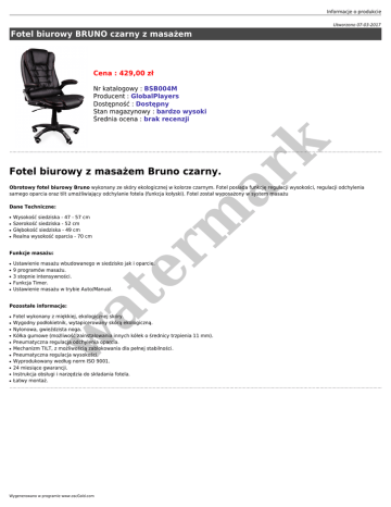 Informacje o produkcie Utworzono 07-03-2017 Fotel biurowy BRUNO czarny z masażem Cena : 429,00 zł er m ar k Nr katalogowy : BSB004M Producent : GlobalPlayers Dostępność : Dostępny Stan magazynowy : bardzo wysoki Średnia ocena : brak recenzji Fotel biurowy z masażem Bruno czarny. Obrotowy fotel biurowy Bruno wykonany ze skóry ekologicznej w kolorze czarnym. Fotel posiada funkcję regulacji wysokości, regulacji odchylenia samego oparcia oraz tilt umożliwiający odchylanie fotela (funkcja kołyski). Fotel został wyposażony w system masażu Dane Techniczne: ● ● ● ● Wysokość siedziska - 47 - 57 cm Szerokość siedziska - 52 cm Głębokość siedziska - 49 cm Realna wysokość oparcia - 70 cm Funkcje masażu: ● ● ● ● Ustawienie masażu wbudowanego w siedzisko jak i oparcie. 9 programów masażu. 3 stopnie intensywności. Funkcja Timer. Ustawienie masażu w trybie Auto/Manual. at ● Pozostałe informacje: ● ● ● ● ● ● ● ● ● ● Fotel wykonany z miękkiej, ekologicznej skóry. Wygodny podłokietnik, wytapicerowany skórą ekologiczną. Nylonowa, gwieździsta noga. Kółka gumowe (możliwość zainstalowania innych kółek o średnicy trzpienia 11 mm). Pneumatyczna regulacja odchylenia oparcia. Mechanizm TILT, z możliwością zablokowania dla pełnej stabilności. Pneumatyczna regulacja wysokości. Wyprodukowany według norm ISO 9001. 24 miesiące gwarancji. Instrukcja obsługi i narzędzia do składania fotela. Łatwy montaż. w ● Wygenerowano w programie www.oscGold.com
