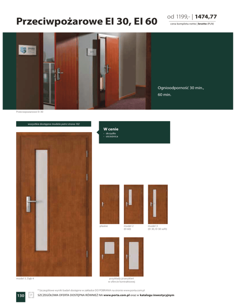od 1199,- | 1474,77 Przeciwpożarowe EI 30, EI 60 cena kompletu netto | brutto (PLN) Ognioodporność 30 min., 60 min. Przeciwpożarowe EI 30 wszystkie dostępne modele patrz strona 102 W cenie • skrzydło • ościeżnica płaskie model 3, Dąb 4 model 2 (EI 60) model 3 (EI 30, EI 30 soft) przykłady przeszkleń w ofercie kontraktowej * Szczegółowe wyniki badań dostępne w zakładce DO POBRANIA na stronie www.porta.com.pl 130 SZCZEGÓŁOWA OFERTA DOSTĘPNA RÓWNIEŻ NA www.porta.com.pl oraz w katalogu inwestycyjnym PROJEKT Okleina Okleina Portasynchro Portasynchro 3D 3D (płaskie) NOWOŚĆ NOWY Akacja Srebrna Dąb Szkarłatny Dąb Ciemny Wenge White MODELE Portadecor, Portasynchro 3D NOWY Sosna Norweska NOWOŚĆ Dąb Malibu Dąb Skandynawski NOWY Dąb Klasyczny NOWY Dąb Syberyjski Orzech Nugat* Nugat Ciemny * do wyczerpania zapasów Okleina Okleina CPL CPL HQ HQ 0,2 0,2 lub 0,7 mm (płaskie) Biały Dąb Milano 1 Popielaty Euroinvest Antracyt HPL/CPL Buk Porta Dąb Milano 2 Dąb Milano 4 Dąb Milano 5 NOWOŚĆ NOWY Struktura Biały* NOWY Struktura Ciemny NOWY NOWY Beton Jasny Piaskowiec Mahoń Orzech Modena 1 Orzech Orzech Modena 2 NOWY Beton Ciemny pełne CPL 0,7 mm (EI 30 SOFT CPL 0,2) model 2 (tylko EI 60) / model 3 (tylko EI 30, CPL 0,7, EI 30 SOFT CPL 0,2) EI 30 soft*** z ościeżnicą MDF stałą 1349 | 1659,27 1909 | 2348,07 EI 30 z ościeżnicą metalową* 1339 | 1646,97 1999 | 2458,77 EI 30 z ościeżnicą MDF stałą** 1669 | 2052,87 2459 | 3024,57 EI 30 z ościeżnicą MDF regulowaną** 2169 | 2667,87 2819 | 3467,37 EI 60 z ościeżnicą metalową* 1689 | 2077,47 2749 | 3381,27 EI 60 z ościeżnicą drewnianą** 2209 | 2717,07 3269 | 4020,87 pełne model 2 (tylko EI 60) / model 3 (tylko EI 30) EI 30 z ościeżnicą metalową* 1639 | 2015,97 2349 | 2889,27 EI 30 z ościeżnicą MDF stałą** 2159 | 2655,57 2869 | 3528,87 EI 30 z ościeżnicą MDF regulowaną** 2789 | 3430,47 3499 | 4303,77 EI 60 z ościeżnicą metalową* 1989 | 2446,47 3209 | 3947,07 EI 60 z ościeżnicą drewnianą** 2559 | 3147,57 3779 | 4648,17 *, ** – patrz Dopłaty Okleina Okleina Naturalna Naturalna Standard Standard (płaskie i z ramkami) Dąb 2 1799 | 2212,77 MODELE Okleiny naturalne* Orzech Bielony * kolor dostępny wyłącznie z ościeżnicą metalową Dąb 1 120 - 200 1199 | 1474,77 NOWY Dąb Południowy Okleina Drewnopodobna PCV (płaskie i frezowane/OFFICE) Dąb Złoty 60 - 100 model 3 MODELE Okleiny CPL HQ i drewnopodobn NOWY Dąb Kalifornia Sa, Sm pełne EI 30 soft*** z ościeżnicą MDF stałą Okleina OkleinaPortaperfect Portaperfect3D 3D(płaskie) Dąb Hawana EI 60 CENNIK NETTO | BRUTTO PLN KOLORYSTYKA Akacja Miodowa EI 30 Dąb 3 Dąb 4 Dąb 5 *** Dąb 6 – szczegółowe informacje znajdują się w katalogu inwestycyjnym oraz na stronie www.porta.com.pl Dąb Biały (RAL 9016) Okleina NaturalnaSelect Select (płaskie) Okleina Naturalna Dąb Dąb Bielony Wenge Orzech Amerykański Orzech Ciemny Orzech Classic Okleina NaturalnaSatin Satin (płaskie) Okleina Naturalna Tabacco Mocca Nero UWAGA! Wszystkie okleiny naturalne możliwe do wykonania w pionowym lub poziomym układzie usłojenia (dotyczy skrzydła). AKCESORIA • • • • • • Trzy (EI 30) lub cztery (EI 30 soft, EI 60) zawiasy Zamek dostosowany pod wkładkę patentową Szyba przeźroczysta ognioodporna (stała szerokość, niezależna od rozmiaru skrzydła) Uszczelka puchnąca pod wpływem wysokiej temperatury w skrzydle Uszczelka progowa ruchoma w skrzydle Ościeżnica z uszczelką ognioodporną OŚCIEŻNICE • Ościeżnica stała MDF EI30 100 mm i regulowana (min. 160 mm) (EI 30, EI 30 SOFT) wyposażona w zawiasy regulowane – obiektowe dla EI 30 i czopowe regulowane dla EI 30 SOFT. • Ościeżnica drewniana 100 mm (EI 60) wykonana z trójwarstwowej klejonki sosnowej, wyposażona w zawiasy czopowe regulowane. • Ościeżnica metalowa kątowa o szerokości profilu 100 mm. Wykonana z blachy stalowej, dwustronnie ocynkowanej „ogniowo”, o grubości 1,5 mm. Wyposażona we wzmocnienie pod samozamykacz, dyble montażowe oraz zawiasy trójelementowe. • Ościeżnica PROJEKT, PROJEKT PREMIUM (str. 172) DOPŁATY • • • • • • • • • • • • • • • • • • • rozmiar „100” klamka z szyldem * pokrycie okleiną naturalną satin ** pokrycie okleiną naturalną satin NOWOŚĆ – nowe kolory w okleinie CPL 0,2 mm i 0,7 mm ramka 1 (na 1 stronę, na dwie strony cena x 2) ramka 2 (na 1 stronę, na dwie strony cena x 2) ramka 3 (na 1 stronę, na dwie strony cena x 2) ramka 4 (na 1 stronę, na dwie strony cena x 2) UWAGA! wzory ramek, patrz str. 107 intarsje srebrne w okleinach syntetycznych (na 1 stronę, na dwie strony cena x 2) intarsje srebrne w okleinach naturalnych na 1 stronę, na dwie strony cena x 2) PROMOCJA – intarsje srebrne lub czarne wyłącznie dla kolekcji frezowane OFFICE – dotyczy modeli 6–9 ćwierćwałek, listwy maskujące profil ościeżnicy metalowej od 80 do 100 mm rozszerzenie profilu ościeżnicy metalowej od 101 do 150 mm rozszerzenie profilu ościeżnicy metalowej od 151 do 270 mm rozszerzenie profilu ościeżnicy metalowej od 271 do 390 mm 50 | 61,50 (str. 176) 75 | 92,25 100 | 123,00 49 | 60,27 150 | 184,50 224 | 275,52 320 | 393,60 410 | 504,30 18 | 22,14 38 | 46,74 0 zł (od str. 180) bez dopłaty 75 | 92,25 151 | 185,73 226 | 277,98 131 EI 30, EI 60 UWAGI • EI30 - Aprobata Techniczna nr AT-15-3575/2015 i Certyfikat Zgodności nr ITB-0567/W, ITB Warszawa. • EI60 - Aprobata Techniczna AT-15-6103/2013 i Certyfikat Zgodności nr ITB-1762/W, ITB Warszawa. • W celu spełnienia warunków Aprobaty Technicznej do drzwi o odporności ogniowej należy stosować samozamykacz. • Drzwi ogniowe należy wyposażyć w szyldy z klamką z rdzeniem stalowym. • Klasa izolacyjności akustycznej Rw = 32 dB (zakres 32 ÷ 36 dB). • Wymiar „60” nie dostępny dla kolekcji frezowane OFFICE. Minimalna szerokość skrzydeł z ramkami: ramka 1 – 444 mm, ramka 2 – 644 mm, ra