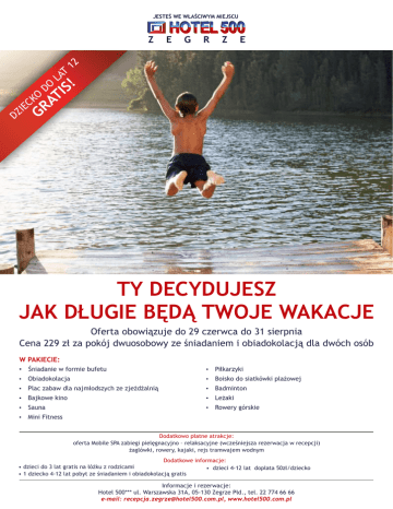 JESTEŚ WE WŁAŚCIWYM MIEJSCU Z DO T LA E G R Z E 12 ! IS O T CK A E R I DZ G TY DECYDUJESZ JAK DŁUGIE BĘDĄ TWOJE WAKACJE Oferta obowiązuje do 29 czerwca do 31 sierpnia Cena 229 zł za pokój dwuosobowy ze śniadaniem i obiadokolacją dla dwóch osób W PAKIECIE: ź Śniadanie w formie bufetu ź Piłkarzyki ź Obiadokolacja ź Boisko do siatkówki plażowej ź Plac zabaw dla najmłodszych ze zjeżdżalnią ź Badminton ź Bajkowe kino ź Leżaki ź Sauna ź Rowery górskie ź Mini Fitness Dodatkowo płatne atrakcje: oferta Mobile SPA zabiegi pielęgnacyjno – relaksacyjne (wcześniejsza rezerwacja w recepcji) żaglówki, rowery, kajaki, rejs tramwajem wodnym Dodatkowe informacje: • dzieci do 3 lat gratis na łóżku z rodzicami • dzieci 4-12 lat dopłata 50zł/dziecko • 1 dziecko 4-12 lat pobyt ze śniadaniem i obiadokolacją gratis Informacje i rezerwacje: Hotel 500*** ul. Warszawska 31A, 05-130 Zegrze Płd., tel. 22 774 66 66 e-mail: [email protected], www.hotel500.com.pl