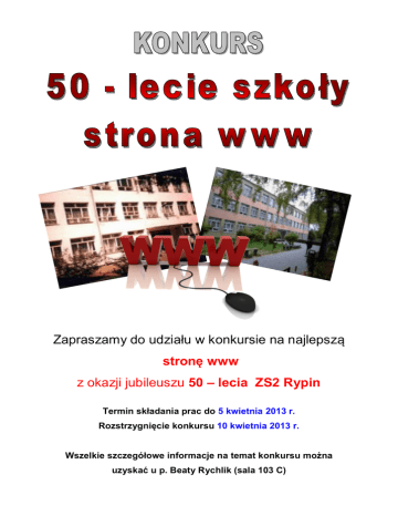 Zapraszamy do udziału w konkursie na najlepszą stronę www z okazji jubileuszu 50 – lecia ZS2 Rypin Termin składania prac do 5 kwietnia 2013 r. Rozstrzygnięcie konkursu 10 kwietnia 2013 r. Wszelkie szczegółowe informacje na temat konkursu można uzyskać u p. Beaty Rychlik (sala 103 C) Regulamin konkursu na najlepszą stronę www z okazji jubileuszu 50 – lecia ZS2 Rypin Termin składania prac do 5 kwietnia 2013 r. Rozstrzygnięcie konkursu 10 kwietnia 2013 r. 1. Konkurs na najlepszą stronę WWW z okazji jubileuszu 50-lecia ZS2 Rypin jest organizowany przez Zespół Szkół nr 2 w Rypinie (nauczyciel odpowiedzialny za przeprowadzenie konkursu – Beata Rychlik). 2. W konkursie mogą brać udział uczniowie, rodzicie uczniów, absolwenci, pracownicy ZS2 Rypin lub inne osoby związane z miastem Rypin. 3. Strona www powinna zawierać następujące treści: historię szkoły program obchodów jubileuszowe przedsięwzięcia galerię zdjęć kontakt (wszystkie materiały można pobrać ze strony szkoły) 4. Prace należy oddać do 5 kwietnia 2013 roku na płycie DVD. 5. Zgłoszone prace konkursowe zostaną ocenione pod względem: zawartości merytorycznej strony (zasób informacji) szaty graficznej strony (pomysłowość, kolorystyka, zdjęcia, nawigacja) optymalizacji strony (szybkość ładowania poszczególnych elementów) poprawności językowej, gramatycznej, ortograficzne 6. Nagrody zostaną przyznane za I, II i III miejsce. 7. Najlepsza strona WWW zostanie umieszczona na serwerze szkoły.