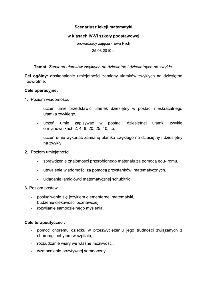 Scenariusz lekcji matematyki w klasach IV-VI szkoły podstawowej prowadzący zajęcia - Ewa Plich 25.03.2010 r. Temat: Zamiana ułamków zwykłych na dziesiętne i dziesiętnych na zwykłe. Cel ogólny: doskonalenie umiejętności zamiany ułamków zwykłych na dziesiętne i odwrotnie. Cele operacyjne: 1. Poziom wiadomości: - uczeń umie przedstawić ułamek dziesiętny w postaci nieskracalnego ułamka zwykłego, - uczeń umie zapisywać w postaci o mianownikach 2, 4, 8, 20, 25, 40, itp. - uczeń umie wykonać zamianę ułamka zwykłego na dziesiętny i dziesiętny na zwykły dziesiętnej ułamki zwykłe 2. Poziom umiejętności : - sprawdzenie znajomości przerobionego materiału za pomocą edu- romu, - utrwalenie wiadomości za pomocą przystanków, matematycznych, - układanie łamigłówki matematycznej schubitrix 3. Poziom postaw: - posługiwanie się językiem elementarnej matematyki, budzenie ciekawości poznawczej, rozwijanie samodzielnego myślenia. Cele terapeutyczne : - pomoc choremu dziecku w przezwycięŜeniu jego trudności związanych z chorobą i pobytem w szpitalu, - rozbudzanie wiary we własne moŜliwości, - wzmocnienie pozytywnej samooceny. Czas trwania: godzina lekcyjna Metody pracy: oparte na działaniu praktycznym Formy pracy: praca indywidualna i praca zbiorowa Środki dydaktyczne: - karty pracy do indywidualnego wykonania, - gra matematyczna – łamigłówka matematyczna, - pomoc multimedialna – edu-Rom. Przebieg zajęć: Faza przygotowawcza Czynności organizacyjno – porządkowe, sprawdzenie listy obecności podanie tematy lekcji, przypomnienie wiadomości dotyczących zamiany ułamka zwykłego na dziesiętny poprzez podzielenie licznika przez mianownik i zamiany ułamka dziesiętnego na ułamek zwykły– wykorzystanie pomocy multimedialnej edu-romu Faza realizacyjna Indywidualne rozwiązywanie zadań z karty pracy, przejście przez cztery przystanki matematyczne , wpisanie liter ze wszystkich przystanków matematycznych do tabel, wspólne odczytanie hasła , utrwalenie wiadomości za pomocą gry dydaktycznej schubitrix – zamiana ułamków. Faza podsumowująca Zebranie najwaŜniejszych treści dot. zamiany ułamków, podziękowanie uczniom za aktywność, ocena uczniów za udział na lekcji. Przeprowadzenie ewaluacji.