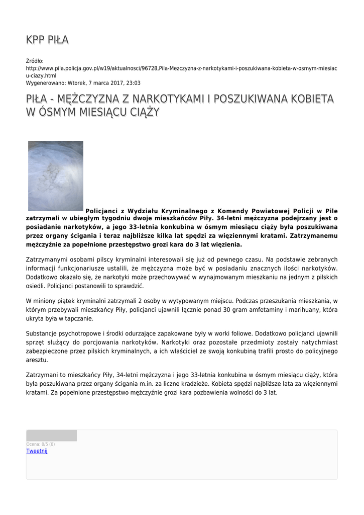 KPP PIŁA Źródło: http://www.pila.policja.gov.pl/w19/aktualnosci/96728,Pila-Mezczyzna-z-narkotykami-i-poszukiwana-kobieta-w-osmym-miesiac u-ciazy.html Wygenerowano: Wtorek, 7 marca 2017, 23:03 PIŁA - MĘŻCZYZNA Z NARKOTYKAMI I POSZUKIWANA KOBIETA W ÓSMYM MIESIĄCU CIĄŻY Policjanci z Wydziału Kryminalnego z Komendy Powiatowej Policji w Pile zatrzymali w ubiegłym tygodniu dwoje mieszkańców Piły. 34-letni mężczyzna podejrzany jest o posiadanie narkotyków, a jego 33-letnia konkubina w ósmym miesiącu ciąży była poszukiwana przez organy ścigania i teraz najbliższe kilka lat spędzi za więziennymi kratami. Zatrzymanemu mężczyźnie za popełnione przestępstwo grozi kara do 3 lat więzienia. Zatrzymanymi osobami pilscy kryminalni interesowali się już od pewnego czasu. Na podstawie zebranych informacji funkcjonariusze ustalili, że mężczyzna może być w posiadaniu znacznych ilości narkotyków. Dodatkowo okazało się, że narkotyki może przechowywać w wynajmowanym mieszkaniu na jednym z pilskich osiedli. Policjanci postanowili to sprawdzić. W miniony piątek kryminalni zatrzymali 2 osoby w wytypowanym miejscu. Podczas przeszukania mieszkania, w którym przebywali mieszkańcy Piły, policjanci ujawnili łącznie ponad 30 gram amfetaminy i marihuany, która ukryta była w tapczanie. Substancje psychotropowe i środki odurzające zapakowane były w worki foliowe. Dodatkowo policjanci ujawnili sprzęt służący do porcjowania narkotyków. Narkotyki oraz pozostałe przedmioty zostały natychmiast zabezpieczone przez pilskich kryminalnych, a ich właściciel ze swoją konkubiną trafili prosto do policyjnego aresztu. Zatrzymani to mieszkańcy Piły, 34-letni mężczyzna i jego 33-letnia konkubina w ósmym miesiącu ciąży, która była poszukiwana przez organy ścigania m.in. za liczne kradzieże. Kobieta spędzi najbliższe lata za więziennymi kratami. Za popełnione przestępstwo mężczyźnie grozi kara pozbawienia wolności do 3 lat. Ocena: 0/5 (0) Tweetnij