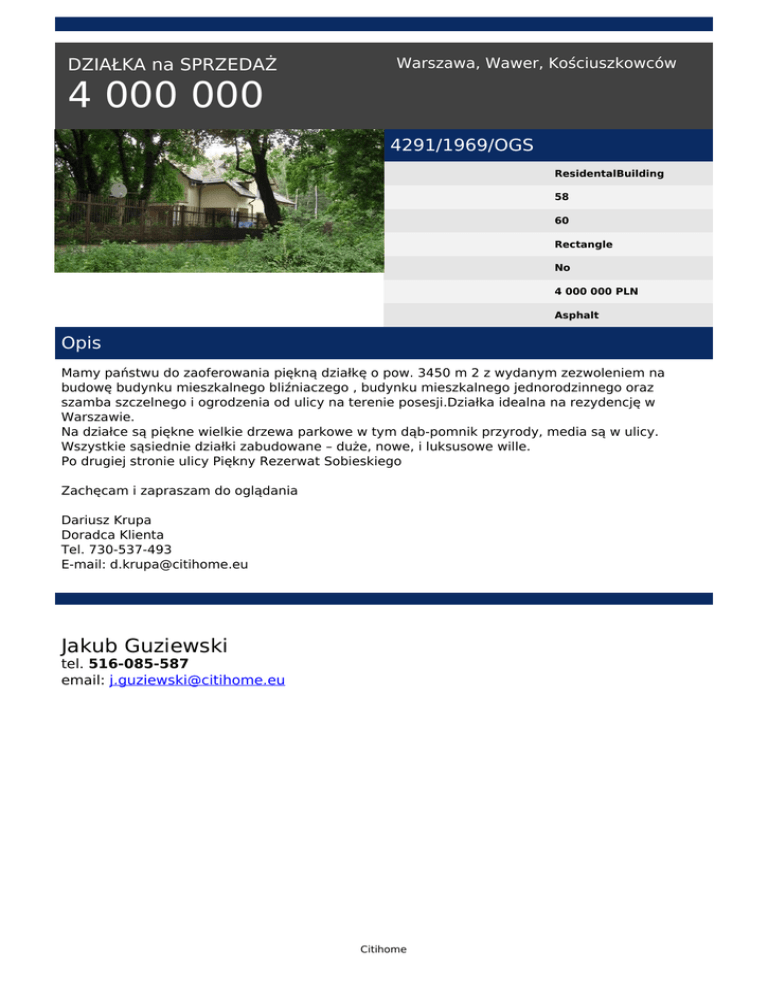 DZIAŁKA na SPRZEDAŻ Warszawa, Wawer, Kościuszkowców 4 000 000 4291/1969/OGS ResidentalBuilding 58 60 Rectangle No 4 000 000 PLN Asphalt Opis Mamy państwu do zaoferowania piękną działkę o pow. 3450 m 2 z wydanym zezwoleniem na budowę budynku mieszkalnego bliźniaczego , budynku mieszkalnego jednorodzinnego oraz szamba szczelnego i ogrodzenia od ulicy na terenie posesji.Działka idealna na rezydencję w Warszawie. Na działce są piękne wielkie drzewa parkowe w tym dąb-pomnik przyrody, media są w ulicy. Wszystkie sąsiednie działki zabudowane – duże, nowe, i luksusowe wille. Po drugiej stronie ulicy Piękny Rezerwat Sobieskiego Zachęcam i zapraszam do oglądania Dariusz Krupa Doradca Klienta Tel. 730-537-493 E-mail: [email protected] Jakub Guziewski tel. 516-085-587 email: [email protected] Citihome Powered by TCPDF (www.tcpdf.org)